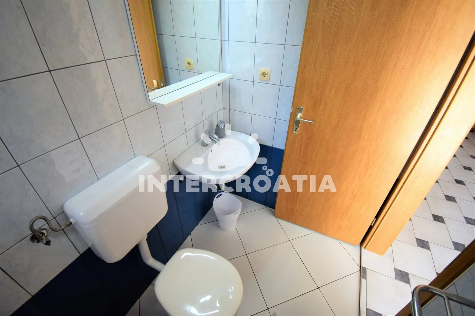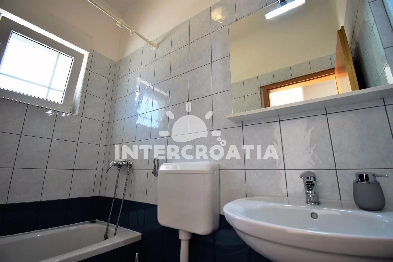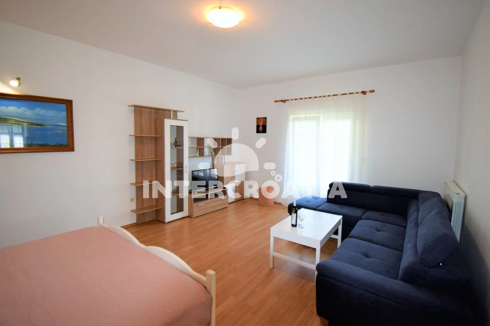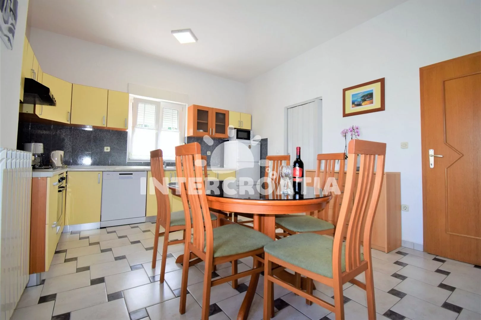 Apartmán (80 m2) s terasou, venkovním posezením a částečným výhledem na moře se nachází v přízemí domu. Apartmán je vhodný pro 2 až 5 osob. Obývací pokoj je spojený s kuchyní. Kuchyňská linka je vybavena varnou deskou, digestoří, vestavěnou troubou, myčkou na nádobí, mikrovlnnou troubou, rychlovarnou konvicí, kávovarem, nádobím a lednicí s mrazákem. Obývací pokoj s jídelním stolem, dvěma přistýlkami, televizí se satelitním programem, klimatizací a vstupem na balkon. Ložnice s jedním dvoulůžkem a přistýlkou. Koupelna s vanou, umyvadlem, fénem a wc. Hostům je k dispozici parkování u objektu zdarma.
