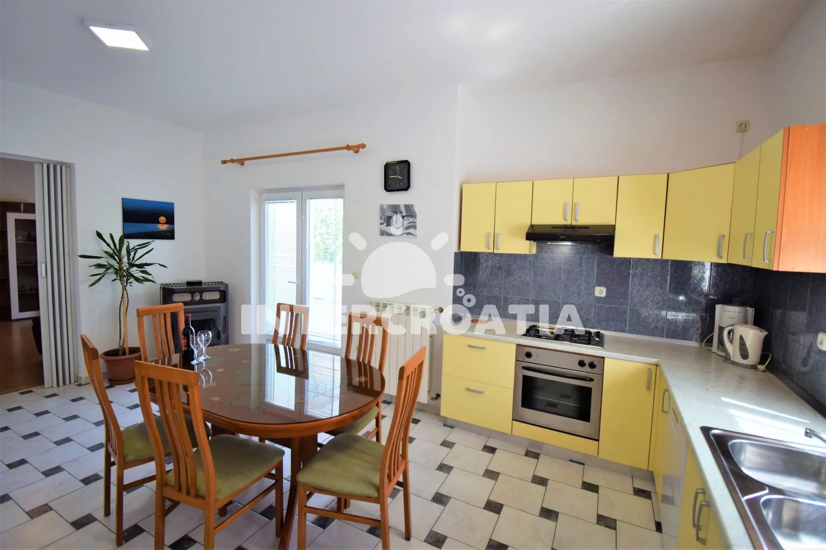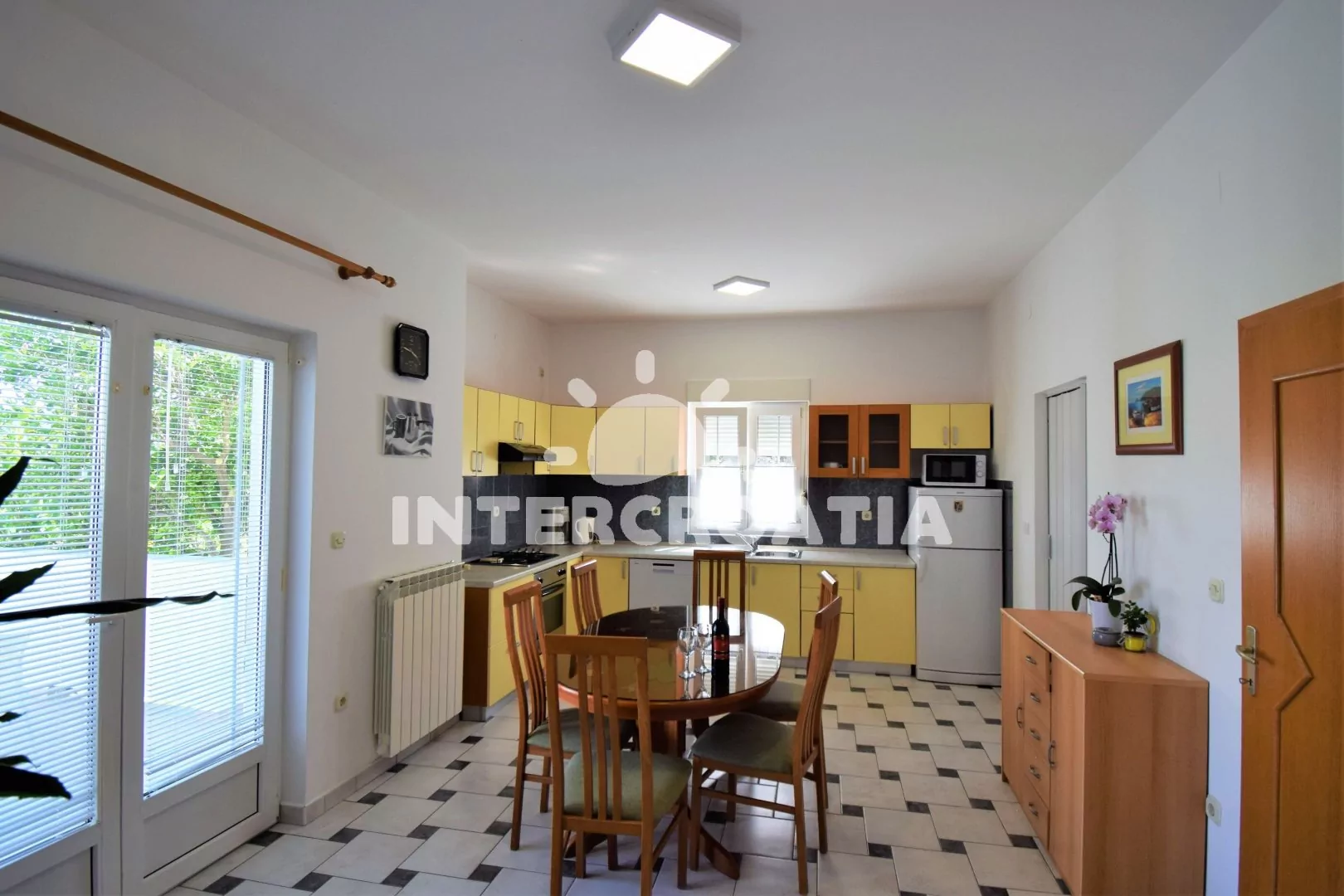 Apartmán (80 m2) s terasou, venkovním posezením a částečným výhledem na moře se nachází v přízemí domu. Apartmán je vhodný pro 2 až 5 osob. Obývací pokoj je spojený s kuchyní. Kuchyňská linka je…
