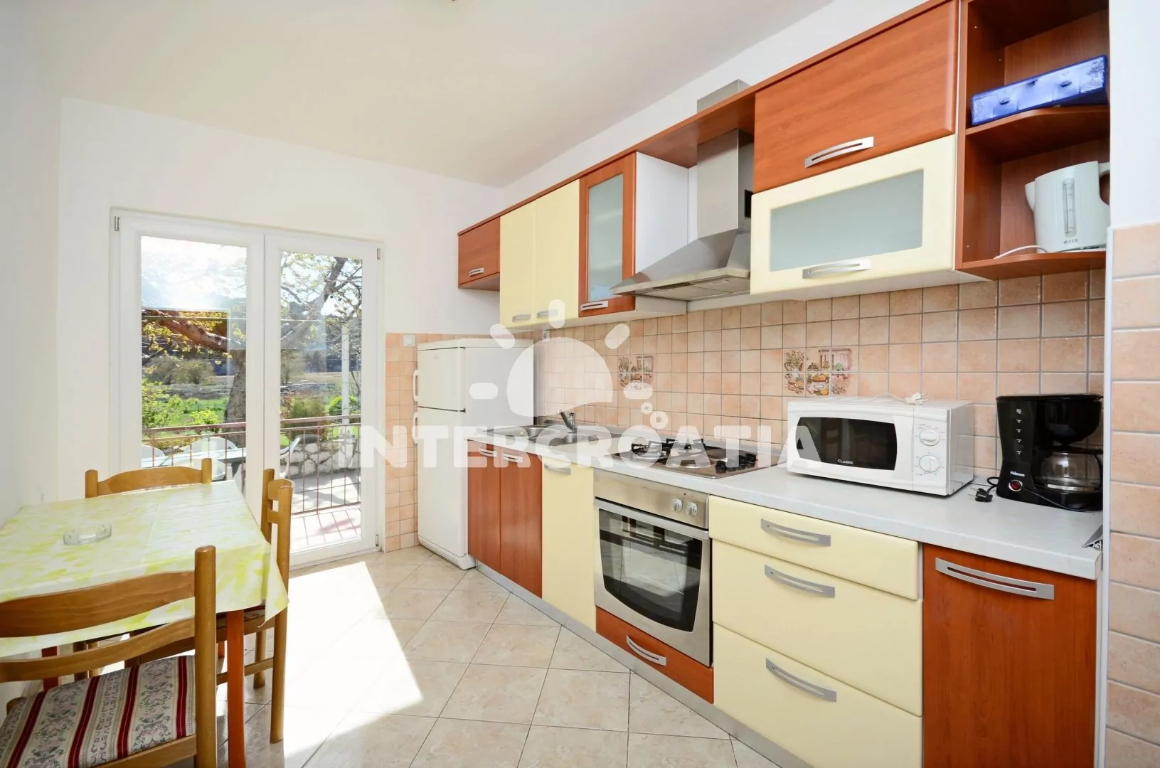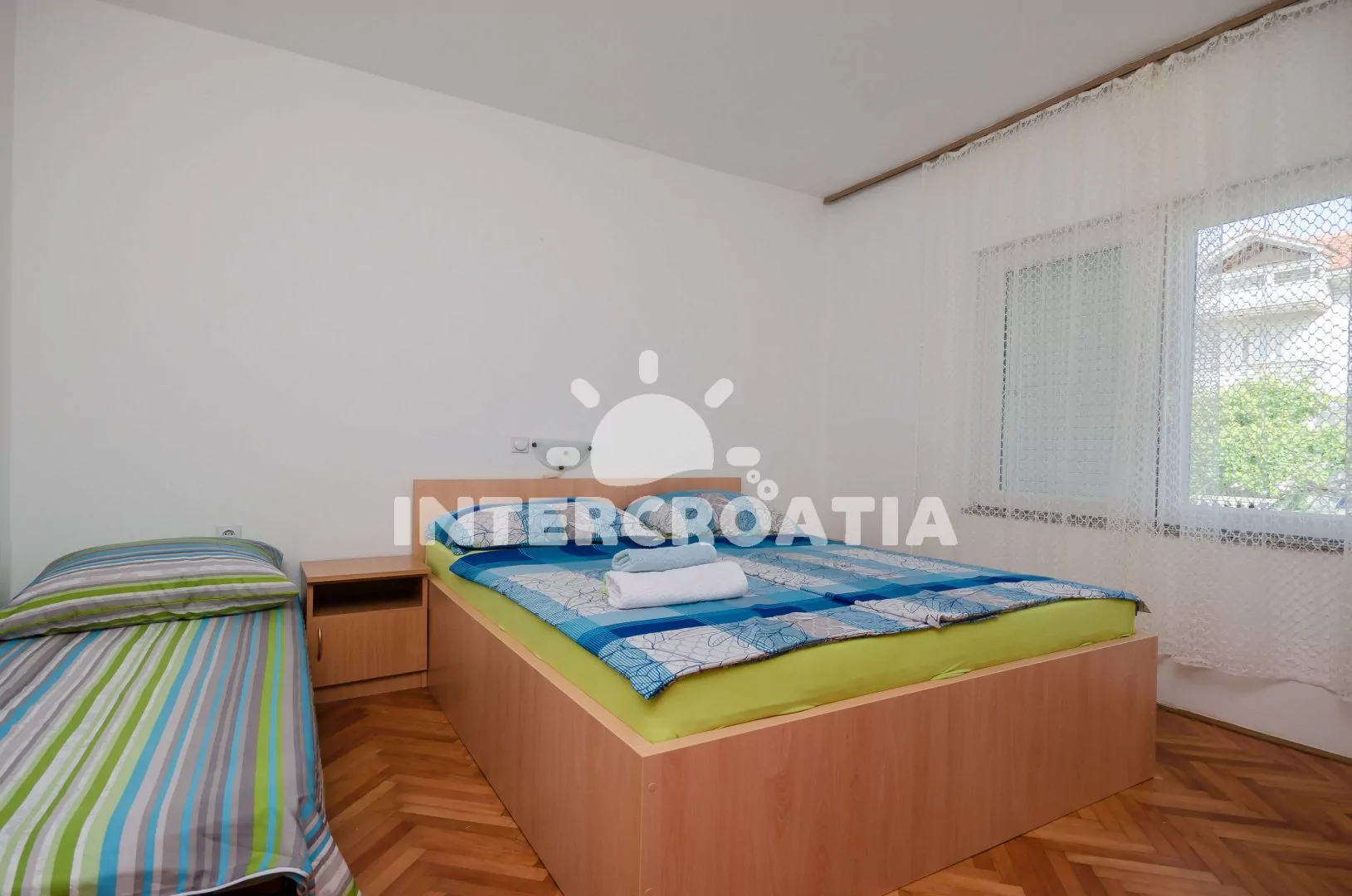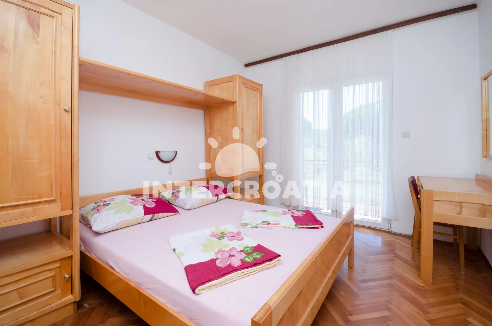 Apartmán (90 m2) s balkonem a venkovním posezením se nachází v přízemí domu. Apartmán má 3 ložnice 2 koupelny a je vhodný pro 7 až 8 osob. Obývací pokoj je spojený s kuchyní. Kuchyňská linka je vybavena varnou deskou, digestoří, vestavěnou troubou, rychlovarnou konvicí, mikrovlnnou troubou, kávovarem, nádobím a lednicí s mrazákem. Obývací pokoj s jídelním stolem, pohovkou (rozložitelná na extra lůžko pro 1 osobu), televizí se satelitním programem, klimatizací a vstupem na balkon. První ložnice s dvoulůžkem a vstupem na balkon. Druhá ložnice s dvoulůžkem. Třetí ložnice s dvoulůžkem a jedním jednolůžkem. První koupelna se sprchovým koutem, umyvadlem a wc. Druhá koupelna s vanou, umyvadlem, pračkou a wc. Hostům je k dispozici parkování u objektu zdarma.