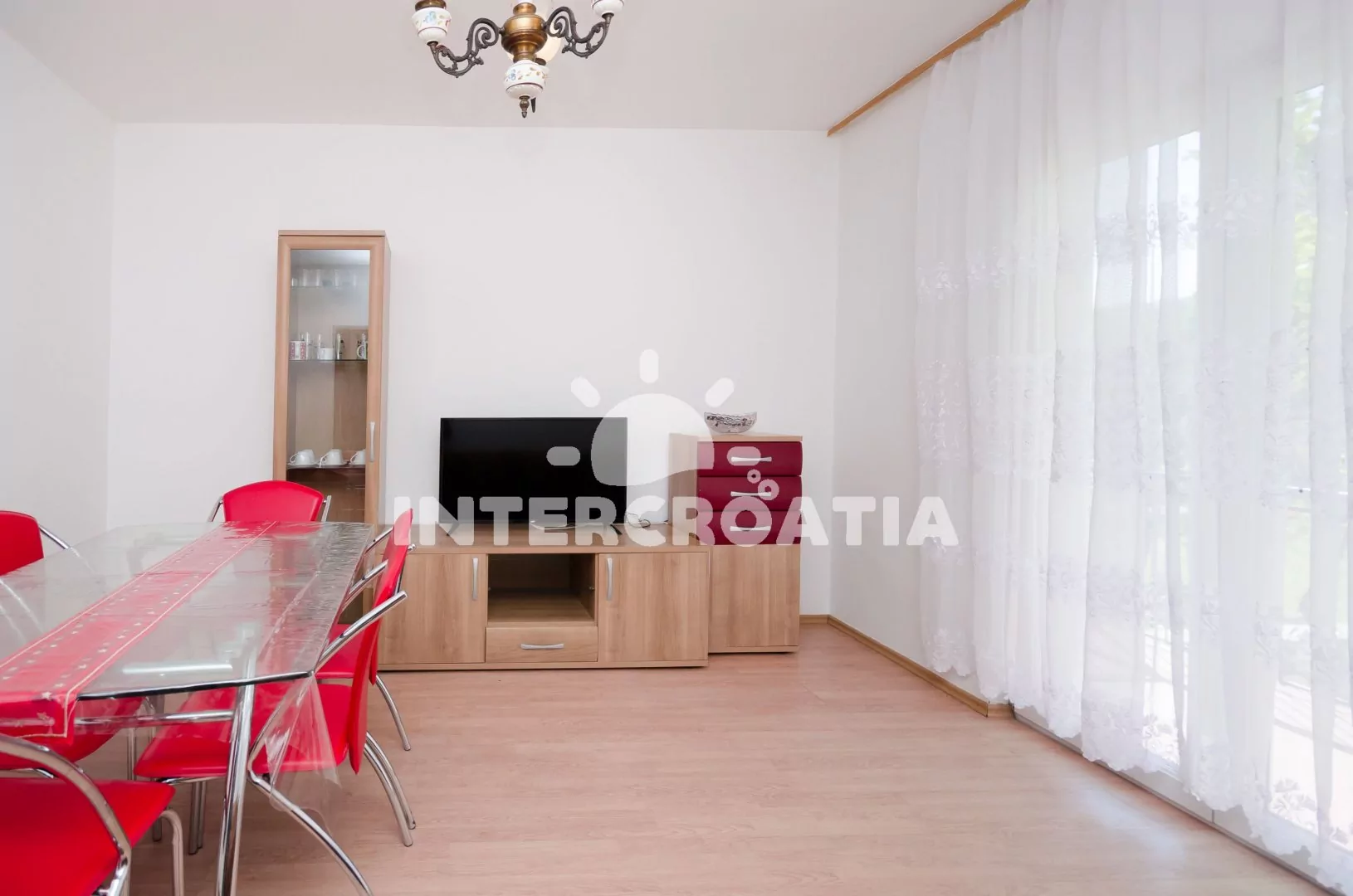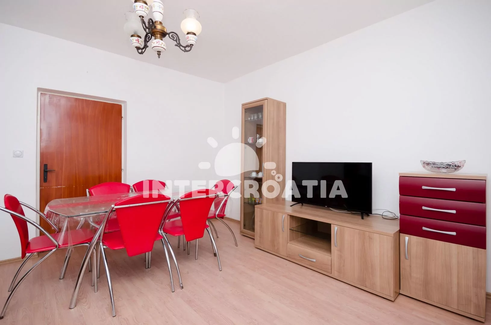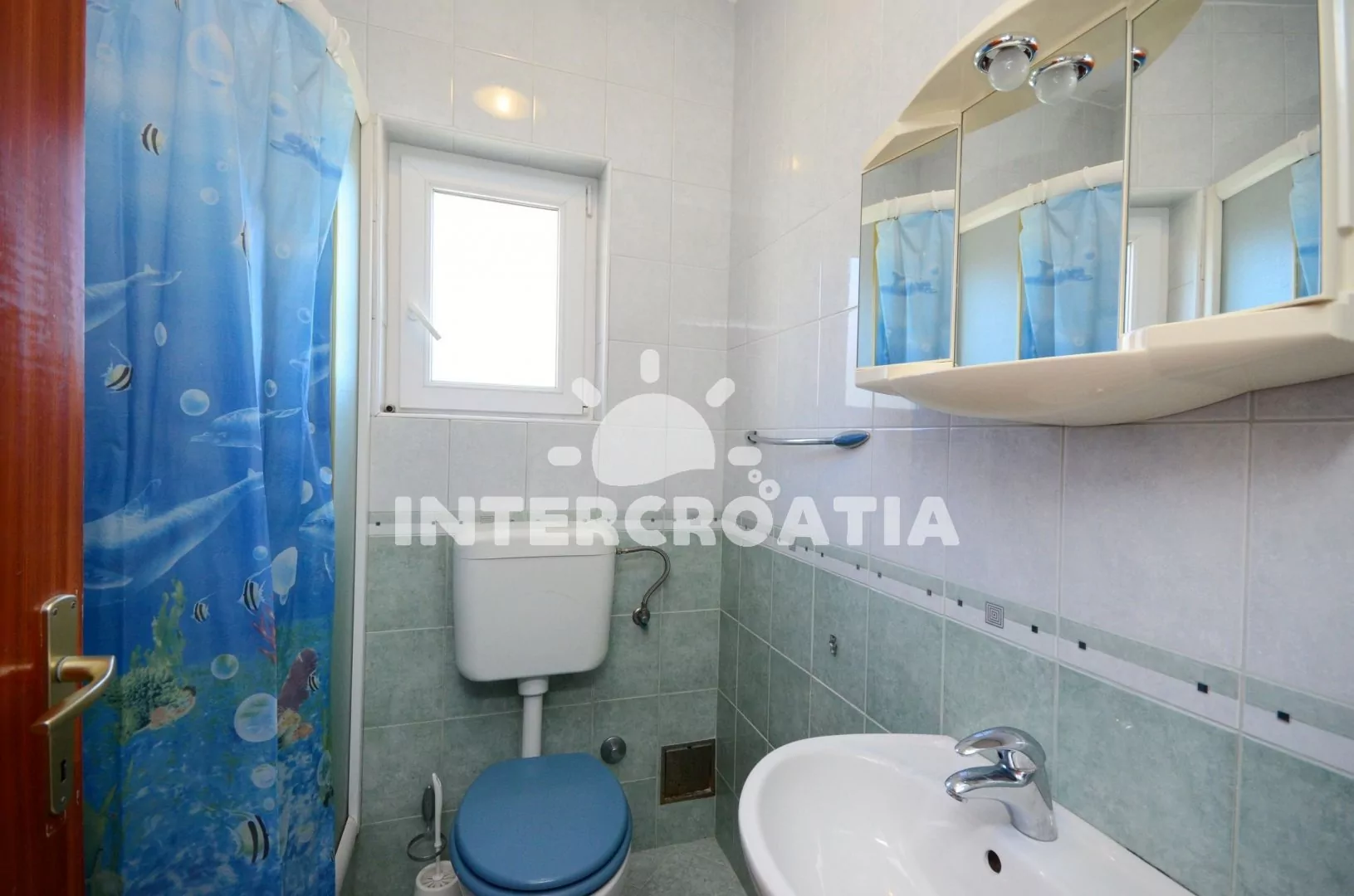 Apartmán (90 m2) s balkonem a venkovním posezením se nachází v přízemí domu. Apartmán má 3 ložnice 2 koupelny a je vhodný pro 7 až 8 osob. Obývací pokoj je spojený s kuchyní. Kuchyňská linka je vybavena varnou deskou, digestoří, vestavěnou troubou, rychlovarnou konvicí, mikrovlnnou troubou, kávovarem, nádobím a lednicí s mrazákem. Obývací pokoj s jídelním stolem, pohovkou (rozložitelná na extra lůžko pro 1 osobu), televizí se satelitním programem, klimatizací a vstupem na balkon. První ložnice s dvoulůžkem a vstupem na balkon. Druhá ložnice s dvoulůžkem. Třetí ložnice s dvoulůžkem a jedním jednolůžkem. První koupelna se sprchovým koutem, umyvadlem a wc. Druhá koupelna s vanou, umyvadlem, pračkou a wc. Hostům je k dispozici parkování u objektu zdarma.