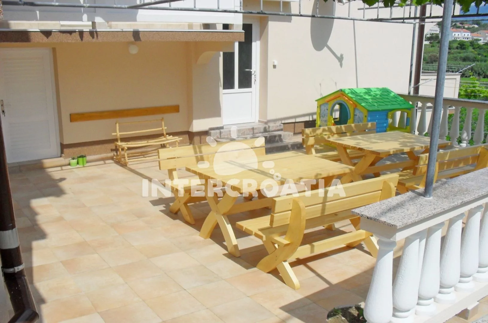Prostorný apartmánový dům v klidné ulici se zahradou se nachází 400 m pěší chůzí od moře a písečné pláže. Dům nabízí ubytování v klimatizovaných apartmánech s lodžiemi a venkovním posezením. Zahrada s dětským koutkem, společná terasa s posezením a zděným grilem. U domu parkovací místa pro automobily.