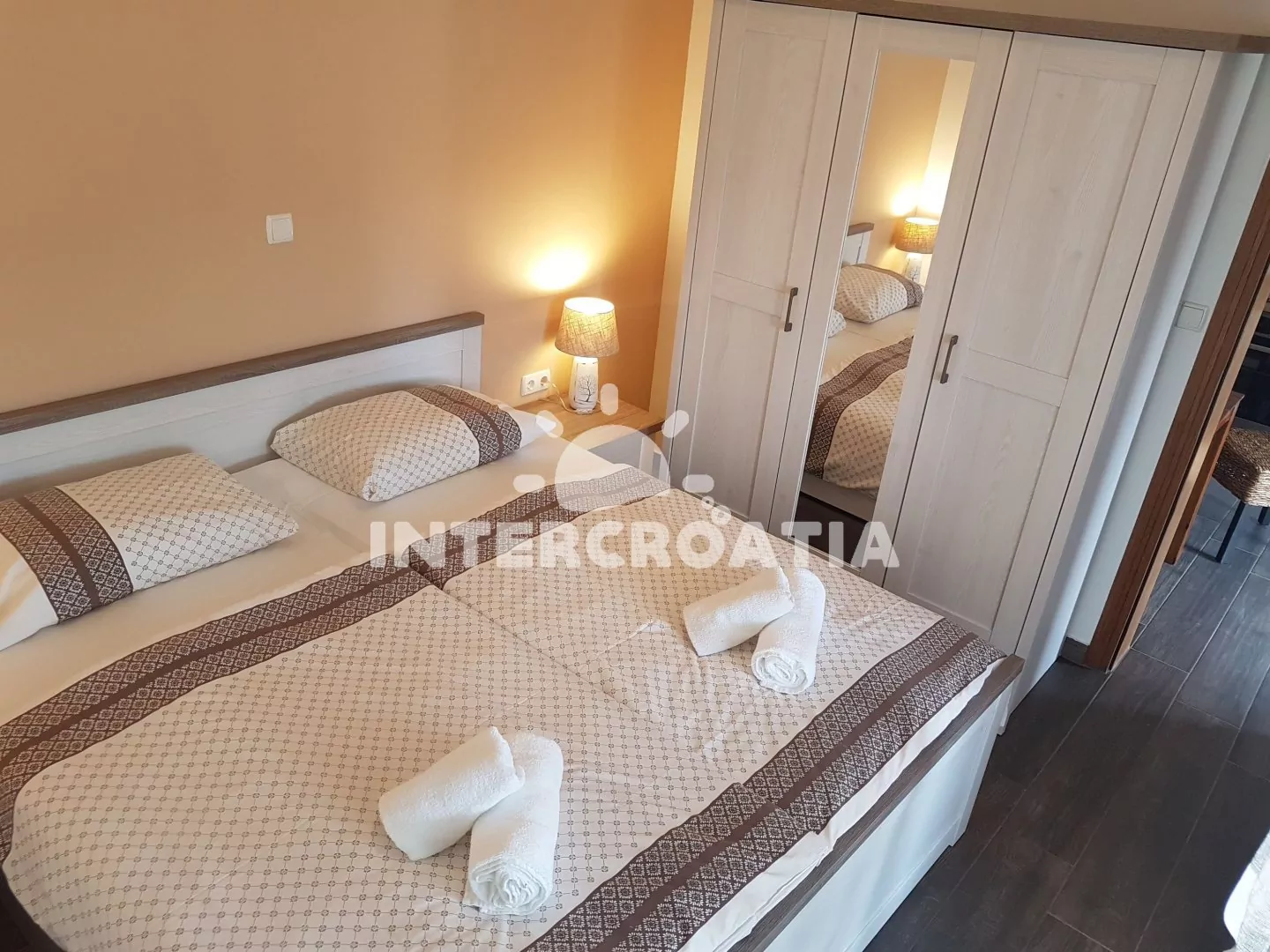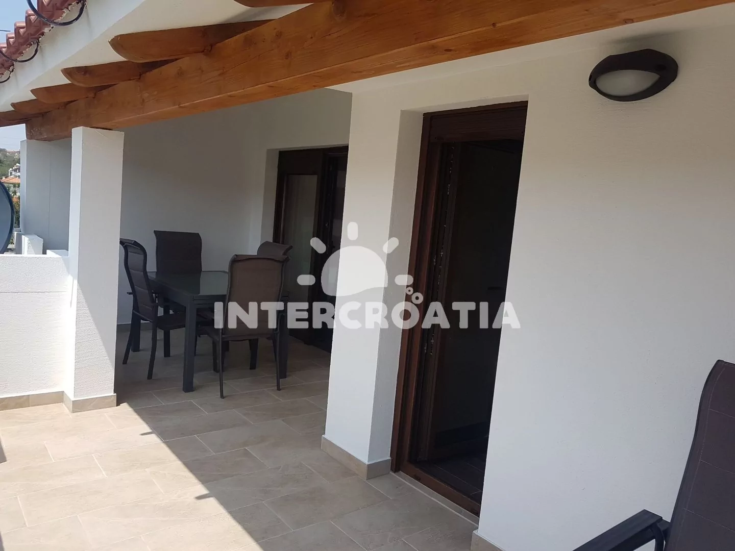 Apartmán (46 m2) s terasou a venkovním posezením se nachází v podkroví domu. Apartmán má 2 ložnice a je vhodný pro 4 až 5 osob. Obývací pokoj je spojený s kuchyní. Kuchyňská linka je vybavena sklokeramickou varnou deskou, digestoří, vestavěnou troubou, myčkou na nádobí, mikrovlnnou troubou, rychlovarnou konvicí, kávovarem, toustovačem, nádobím a lednicí s mrazákem. Obývací pokoj s jídelním stolem, pohovkou (rozložitelná na extra lůžko pro 1 osobu), televizí se satelitním programem, klimatizací a vstupem na terasu. První i druhá ložnice je vybavena vždy s dvoulůžkem a vstupem na terasu. Koupelna se sprchovým koutem, umyvadlem, fénem, pračkou a wc. Hostům je k dispozici parkování u objektu zdarma.