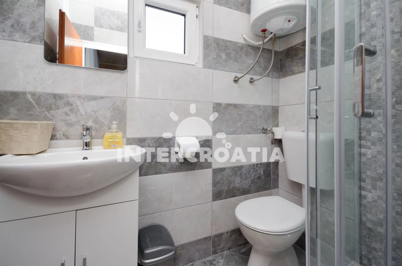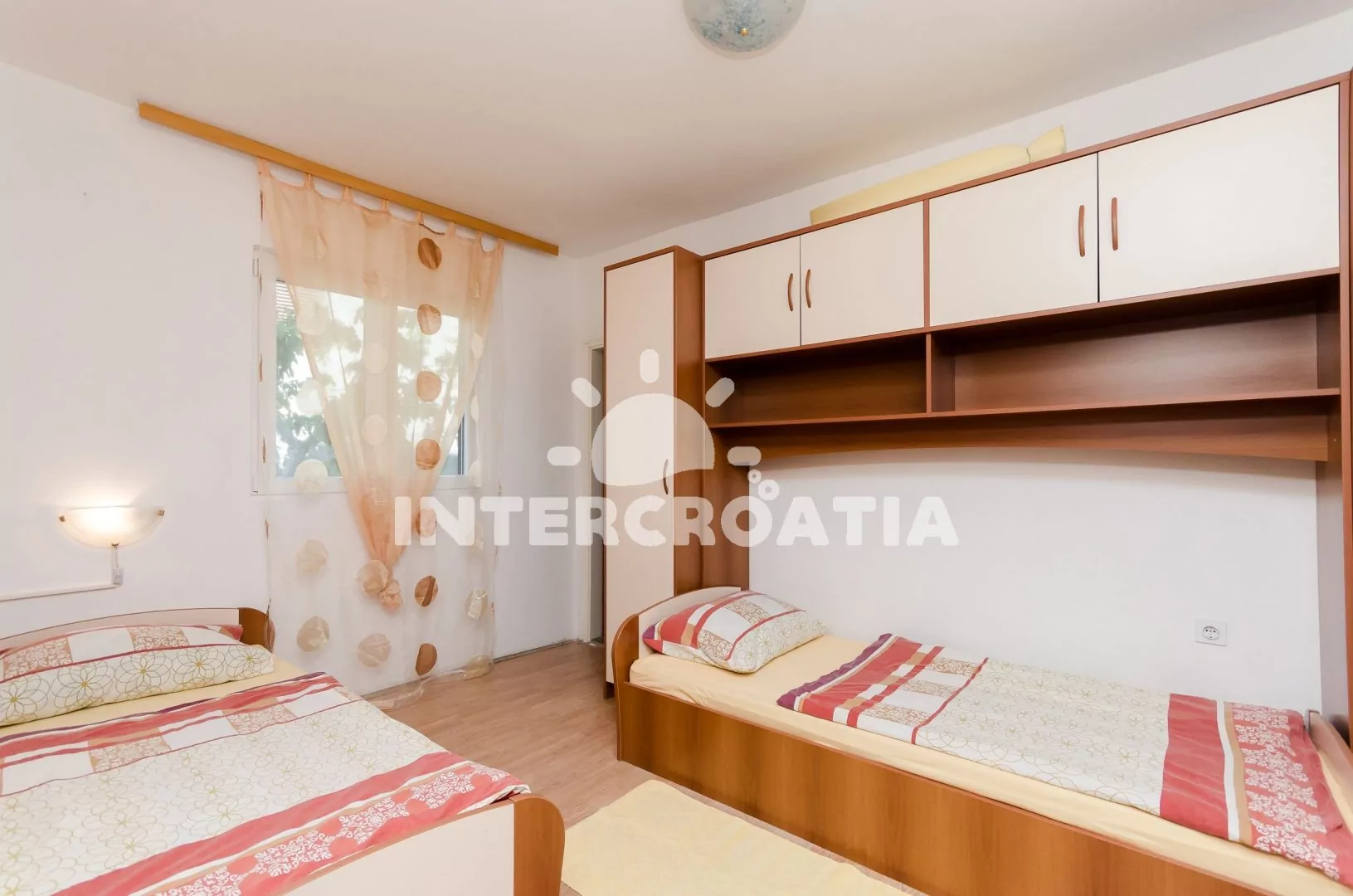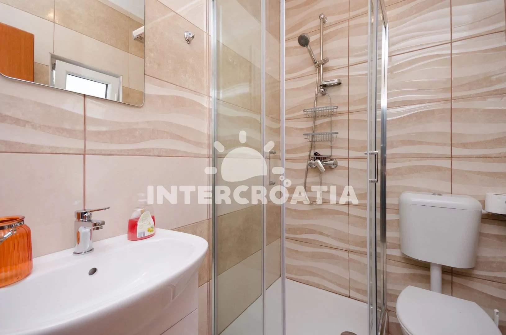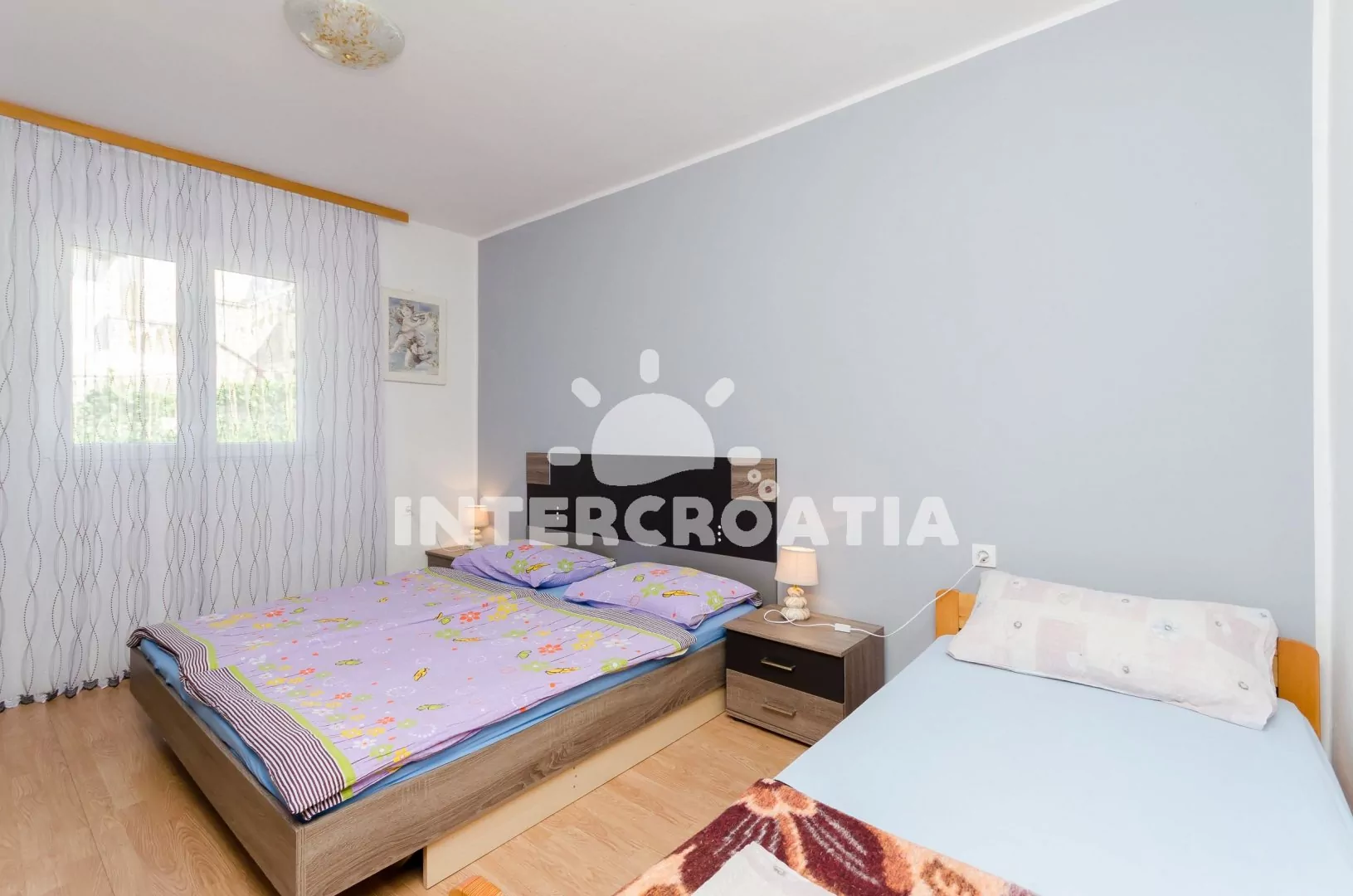 Apartmán (100 m2) s balkonem, posezením a výhledem na moře se nachází v přízemí vily. Apartmán má 2 ložnice, 3 koupelny a je vhodný pro 5 až 6 osob. Obývací pokoj je spojený s kuchyní. Kuchyňská linka je vybavena varnou deskou, digestoří, vestavěnou troubou, rychlovarnou konvicí, mikrovlnnou troubou, kávovarem, nádobím a lednicí s mrazákem. Obývací pokoj s jídelním stolem, sedací soupravou s pohovkou (rozložitelná na extra lůžko pro 1 osobu), televizí a klimatizací. První ložnice s dvoulůžkem a jedním jednolůžkem. Druhá ložnice s dvěma jednolůžky. Tři koupelny se sprchovým koutem, umyvadlem a wc (jeden fén na vlasy). Hostům je k dispozici parkování u objektu zdarma.
