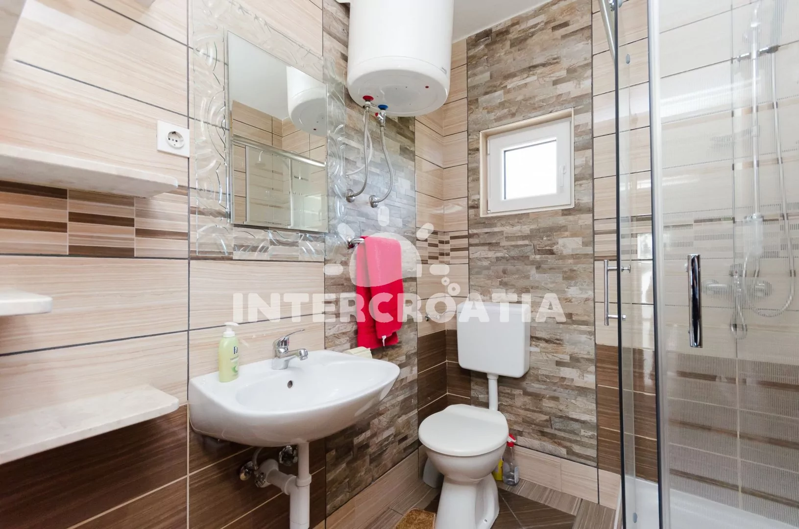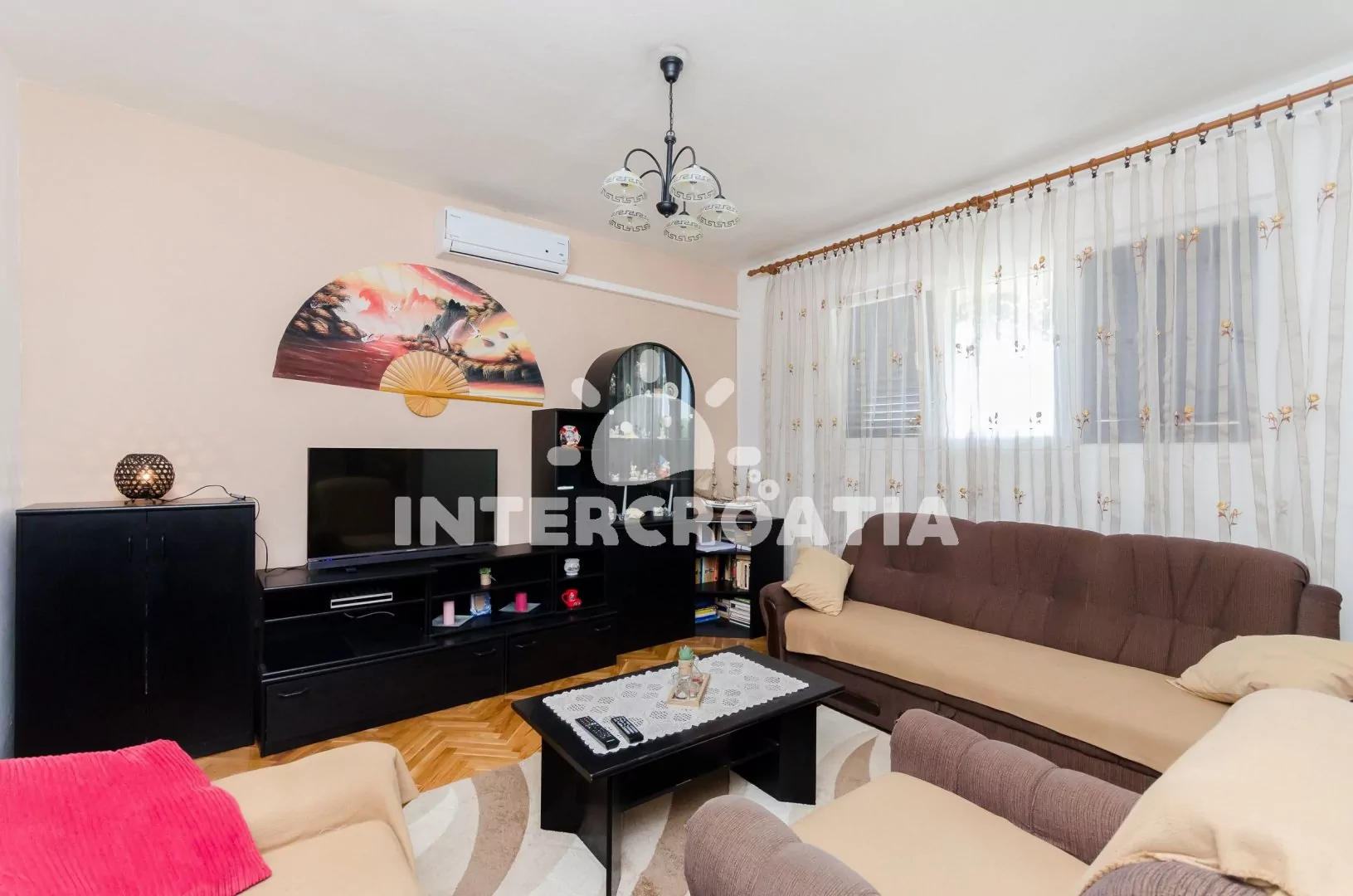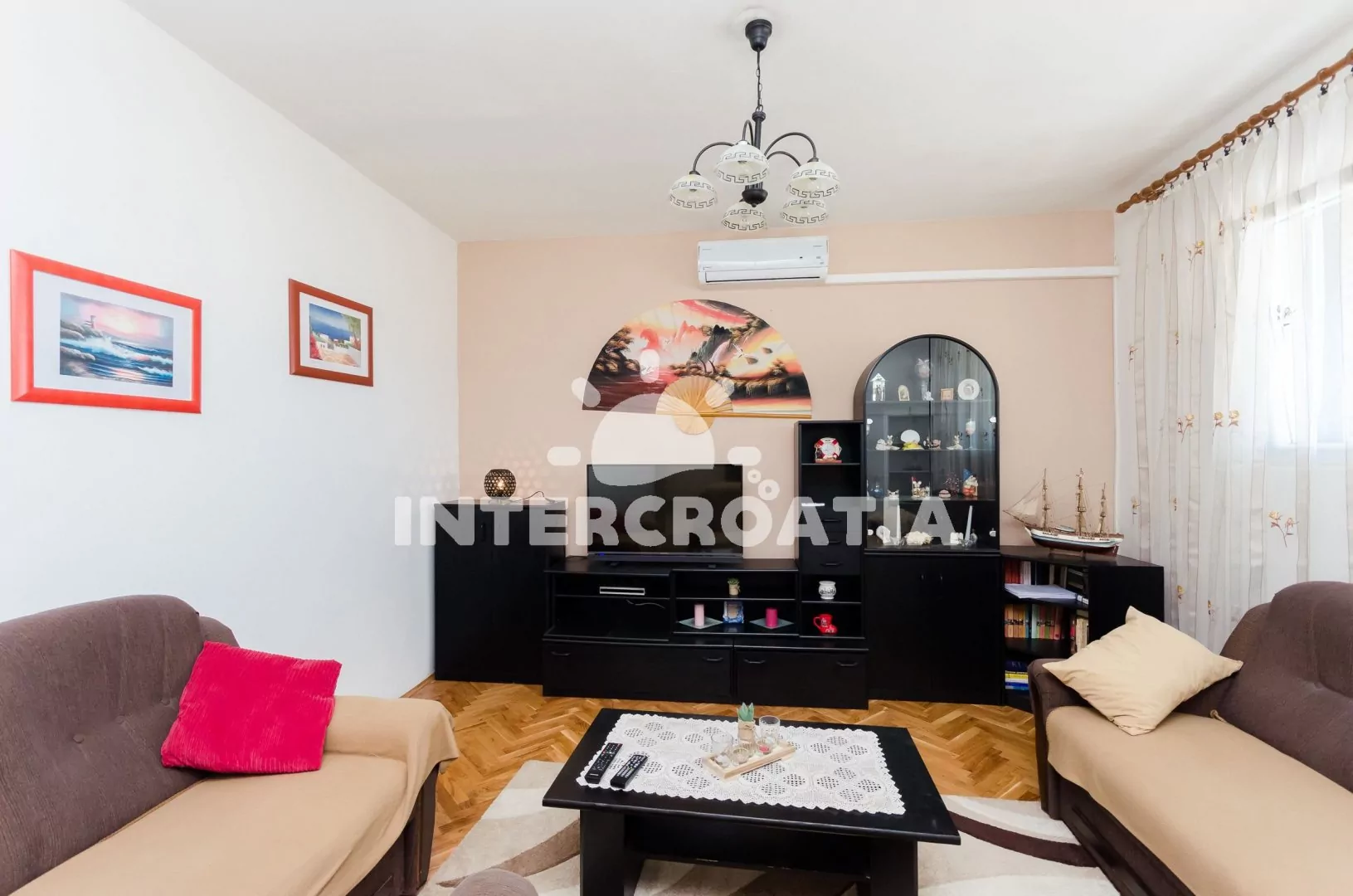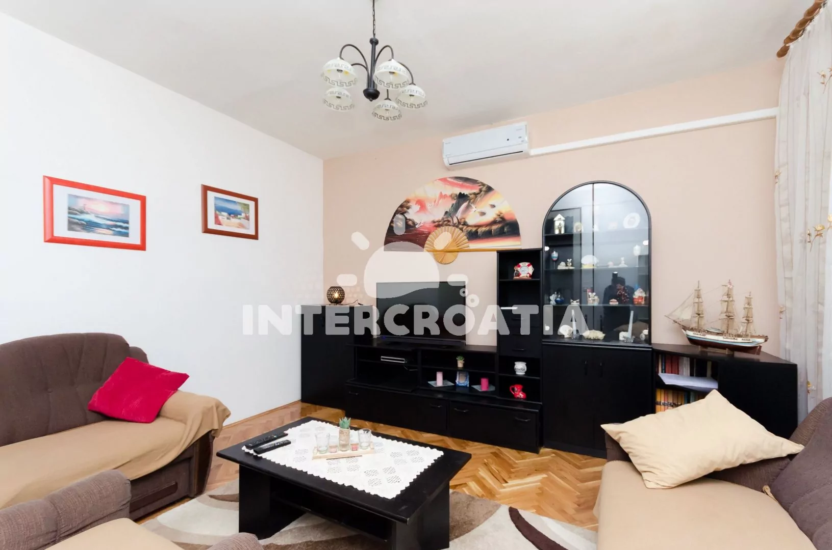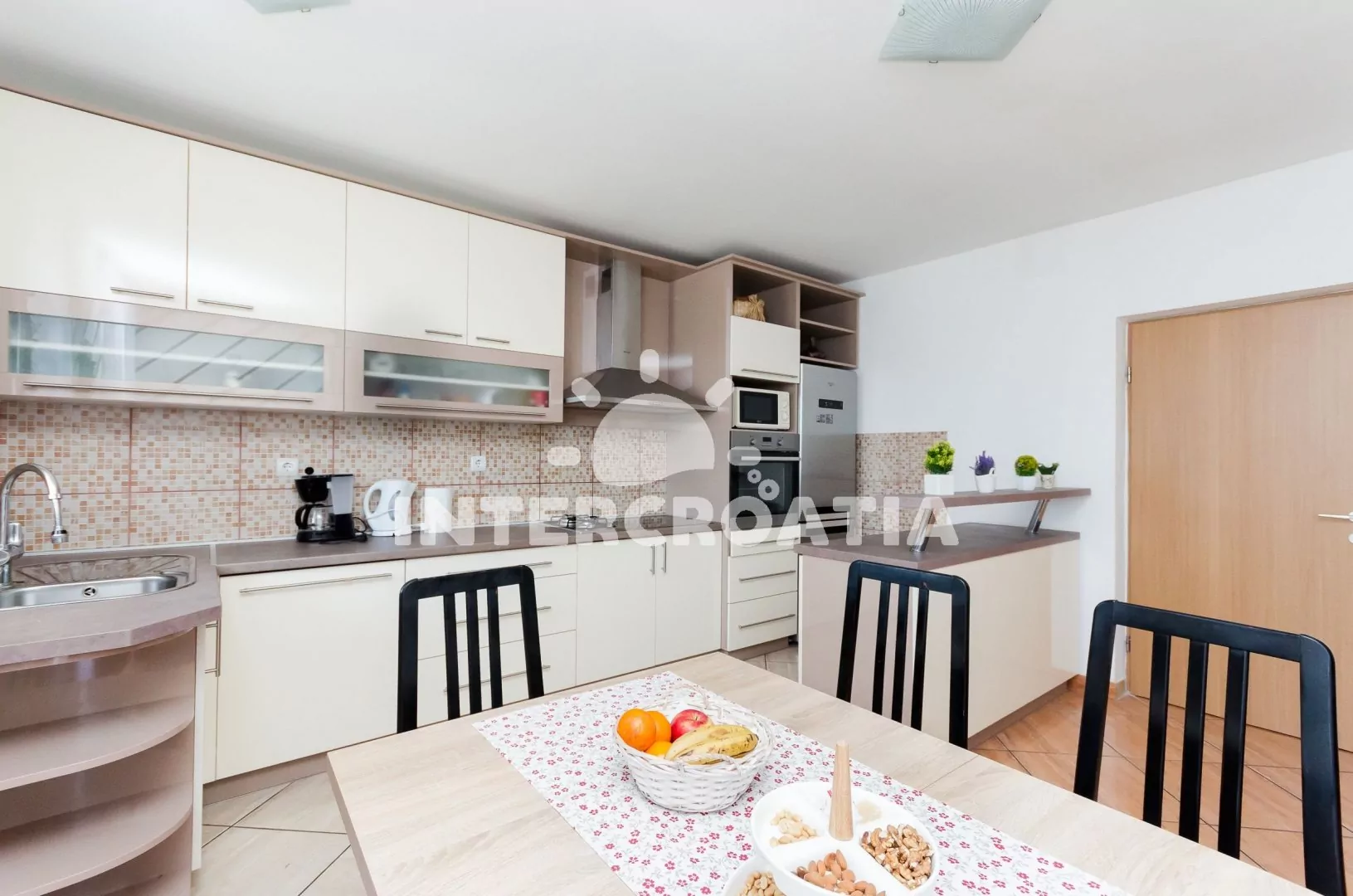 Apartmán (100 m2) s balkonem, posezením a výhledem na moře se nachází v přízemí vily. Apartmán má 2 ložnice, 3 koupelny a je vhodný pro 5 až 6 osob. Obývací pokoj je spojený s kuchyní. Kuchyňská linka je vybavena varnou deskou, digestoří, vestavěnou troubou, rychlovarnou konvicí, mikrovlnnou troubou, kávovarem, nádobím a lednicí s mrazákem. Obývací pokoj s jídelním stolem, sedací soupravou s pohovkou (rozložitelná na extra lůžko pro 1 osobu), televizí a klimatizací. První ložnice s dvoulůžkem a jedním jednolůžkem. Druhá ložnice s dvěma jednolůžky. Tři koupelny se sprchovým koutem, umyvadlem a wc (jeden fén na vlasy). Hostům je k dispozici parkování u objektu zdarma.