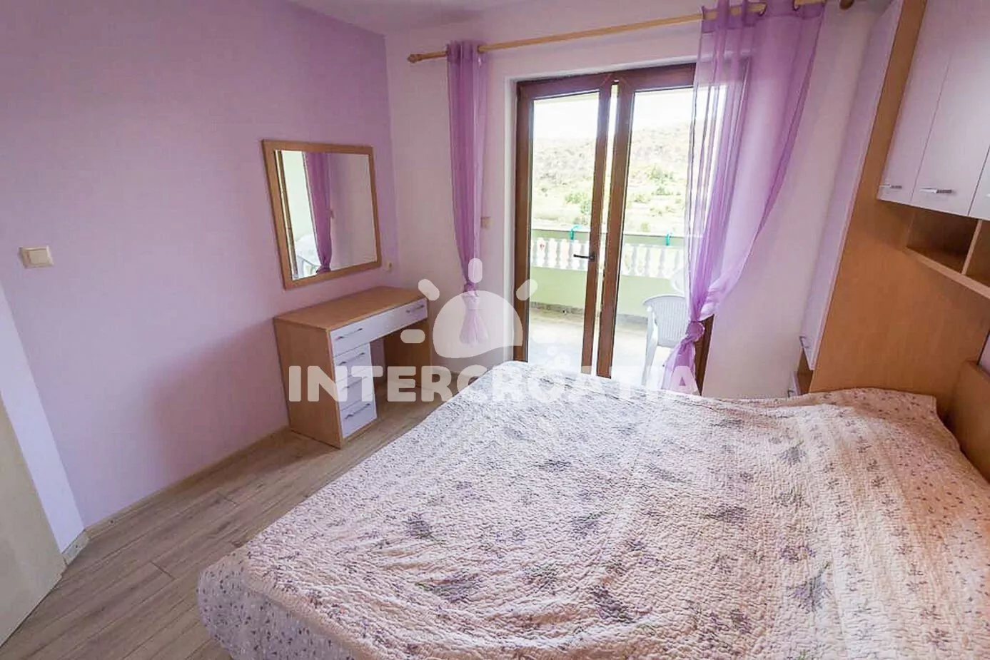 Apartmán (85 m2) s balkonem, venkovním posezením a výhledem na moře se nachází ve 2. patře domu. Apartmán má 2 ložnice a je vhodný pro až 4 osoby. Obývací místnost je spojena s kuchyní. Kuchyňská linka je vybavena varnou deskou, digestoří, vestavěnou troubou, rychlovarnou konvicí, kávovarem, nádobím a lednicí s mrazákem. Obývací místnost s jídelním stolem, televizí se satelitním programem a klimatizací. První ložnice s dvoulůžkem, klimatizací a vstupem na balkon. Druhá ložnice s dvoulůžkem a klimatizací. Koupelna se sprchovým koutem, umyvadlem a wc. Hostům je k dispozici parkování u objektu zdarma.