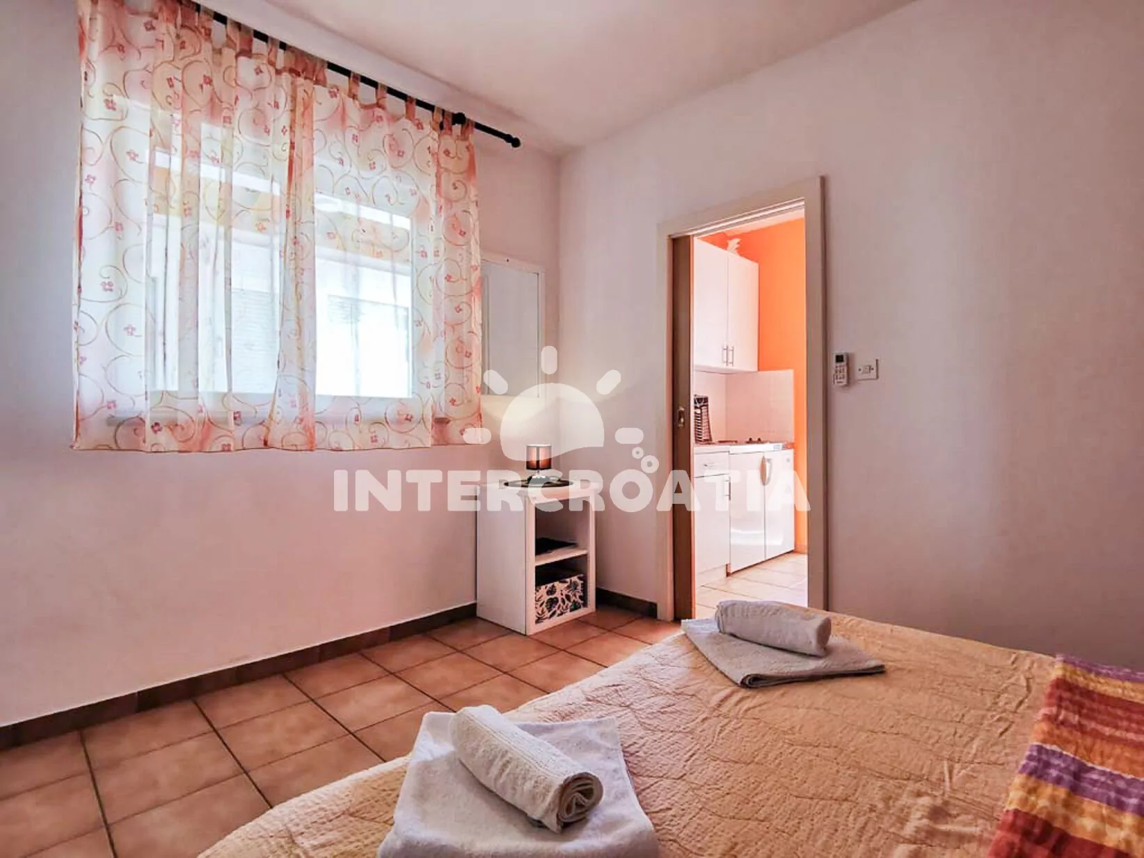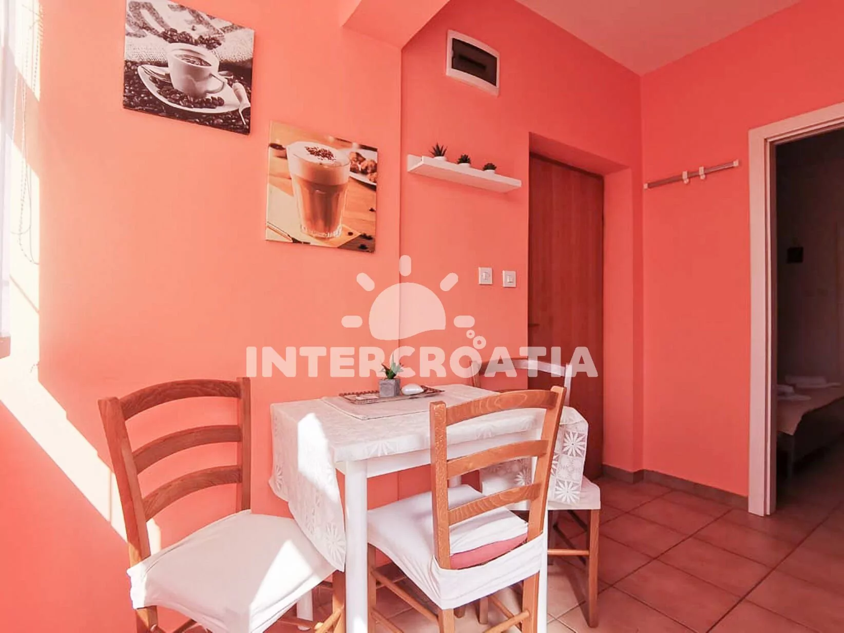 Apartmán (35 m2) typu studio s terasou, posezením a výhledem do zahrady se nachází v 1. patře domu. Obývací místnost je spojena s kuchyní. Kuchyňská linka je vybavena dvouplotýnkovým vařičem, rychlovarnou konvicí, kávovarem, mikrovlnnou troubou, nádobím a lednicí s mrazákem. Obývací místnost s jídelním stolem, televizí se satelitním programem, dvoulůžkem, klimatizací a vstupem na terasu. Koupelna se sprchovým koutem, umyvadlem a wc. Hostům je k dispozici parkování u objektu zdarma.