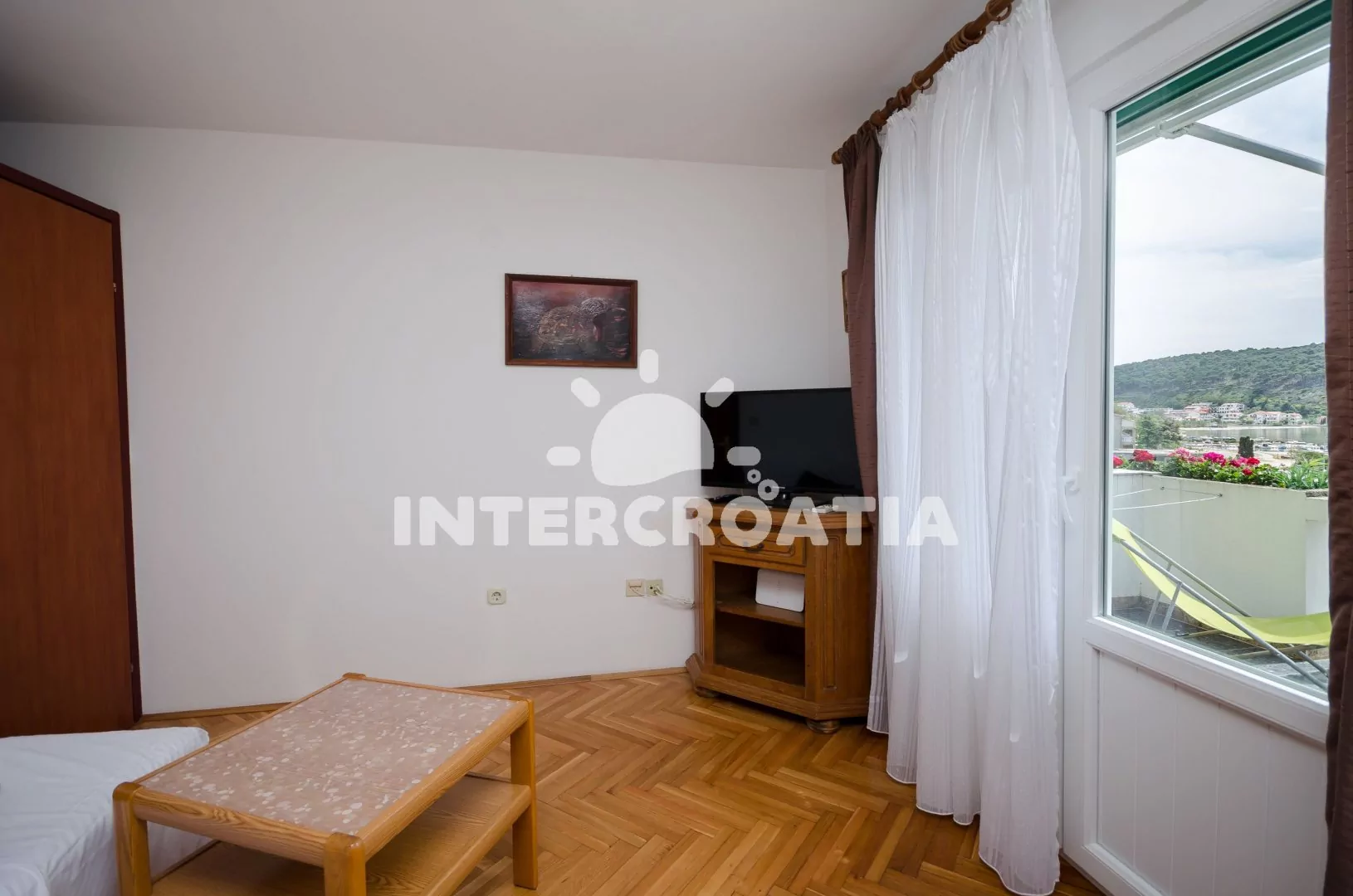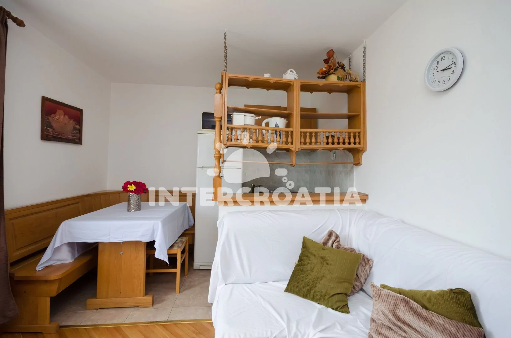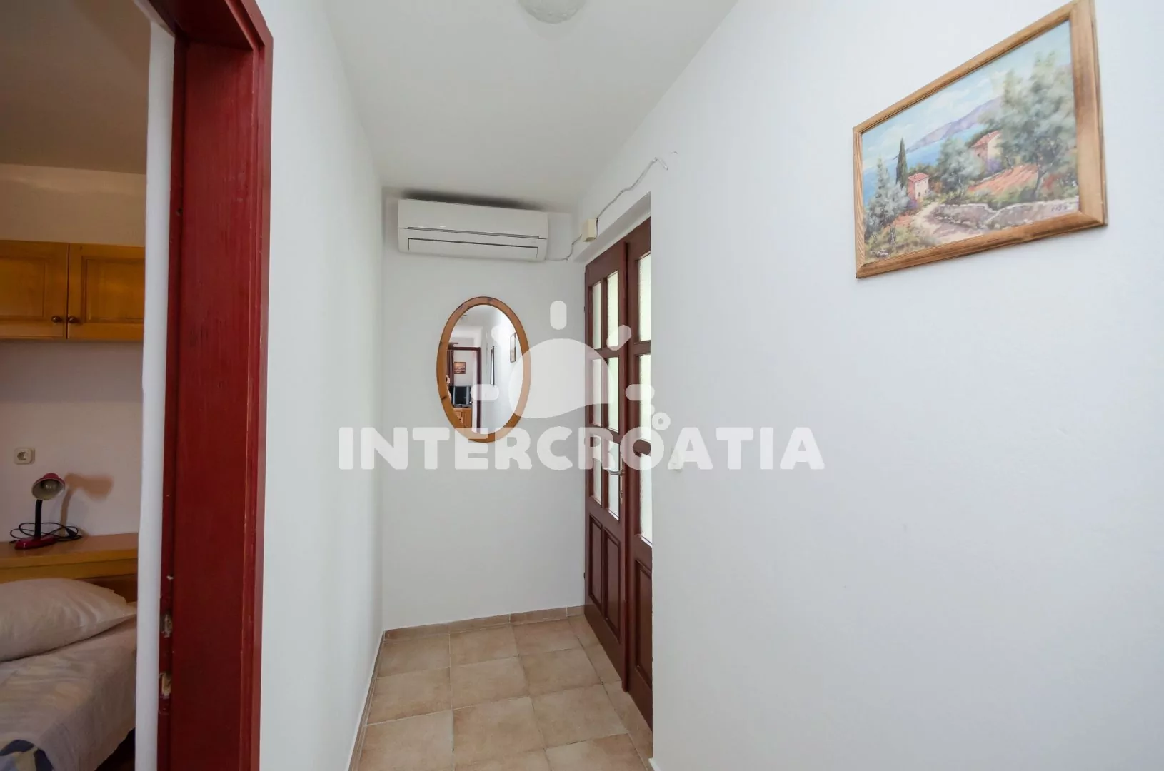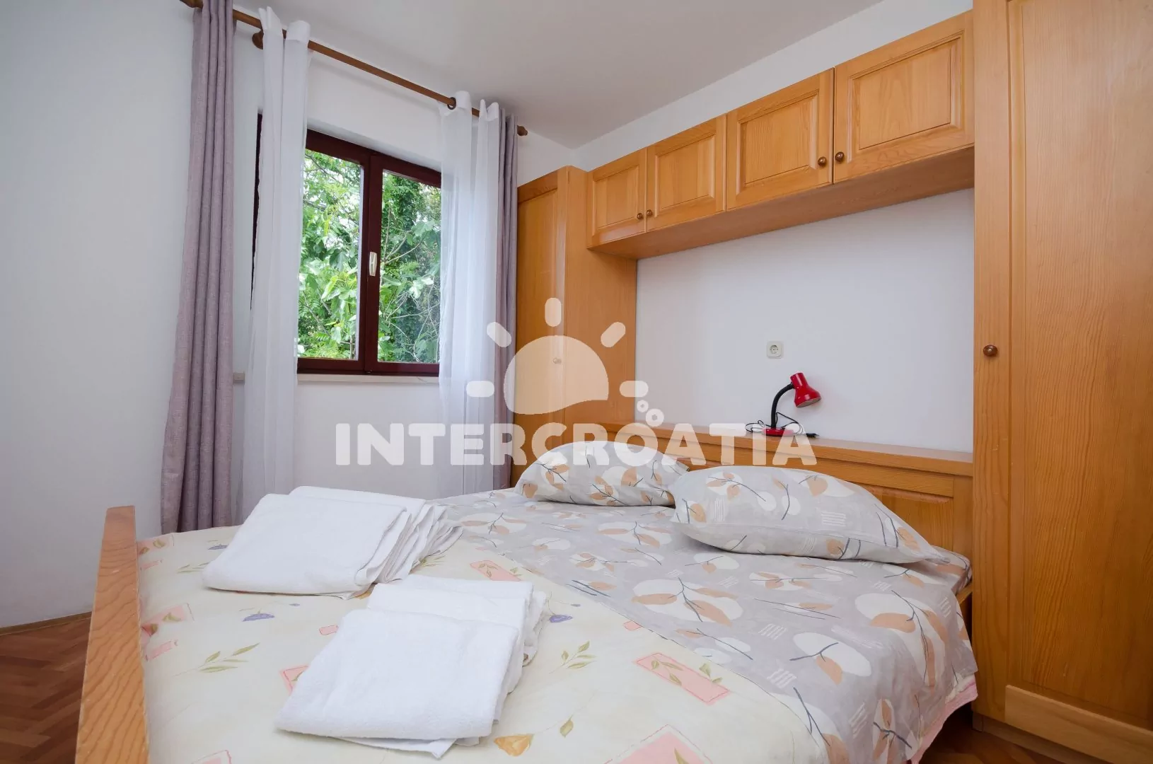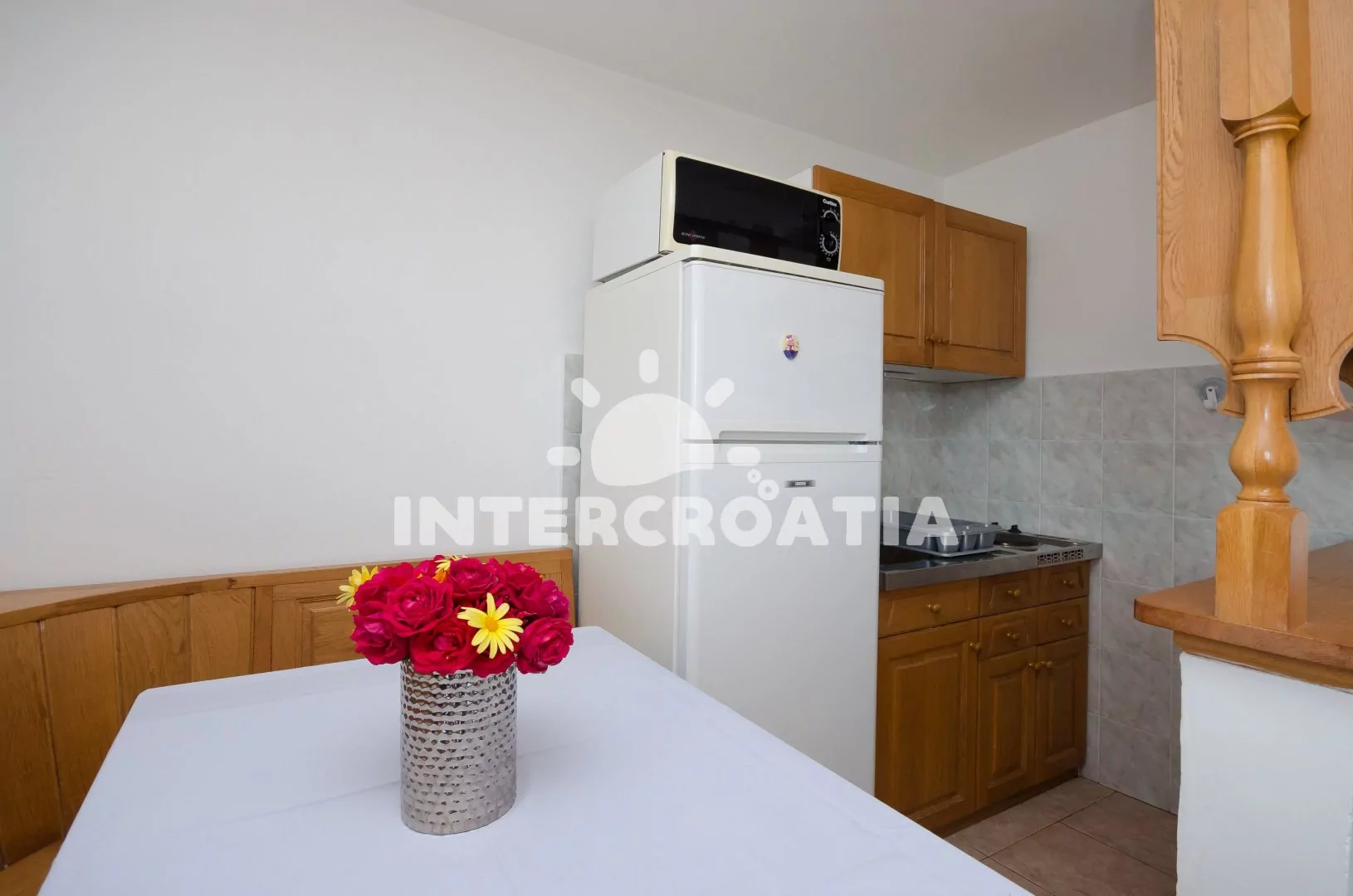 Apartmán (50 m2) s balkonem a výhledem na moře se nachází ve 2. patře domu. Apartmán má 2 ložnice a je vhodný pro až 4 osoby. Obývací pokoj je spojený s kuchyní. Kuchyňská linka je vybavena dvouplotýnkovým vařičem, mikrovlnnou troubou, rychlovarnou konvicí, nádobím a lednicí s mrazákem. Obývací pokoj s jídelním stolem, pohovkou, televizí se satelitním programem, klimatizací a vstupem na balkon. První i druhá ložnice je vybavena vždy s jedním dvoulůžkem. Koupelna se sprchovým koutem, umyvadlem a wc. Hostům je k dispozici parkování u objektu zdarma.