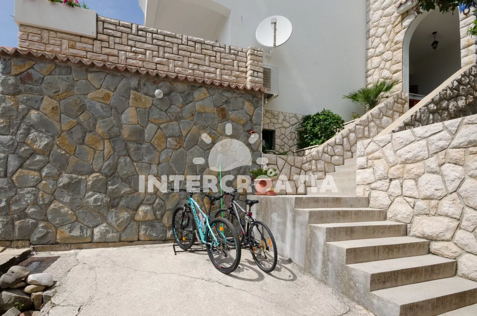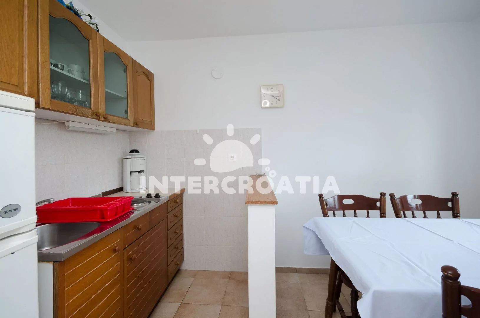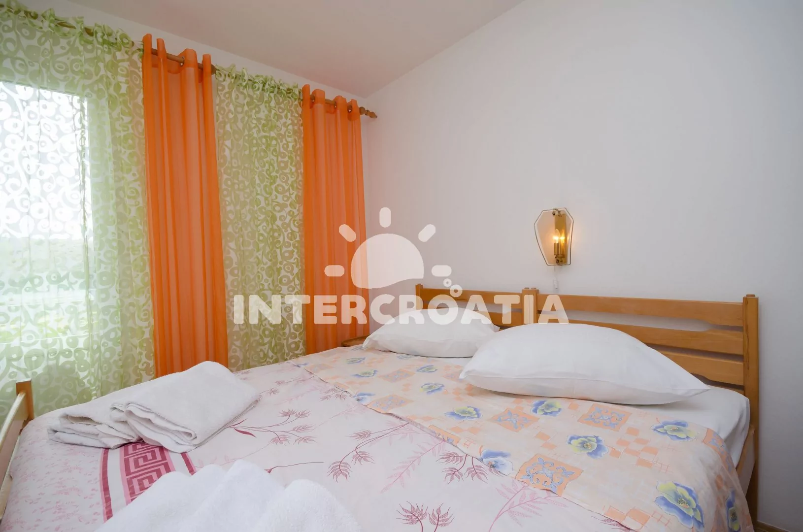 Apartmán (55 m2) s balkonem/terasou a výhledem na moře se nachází ve 2. patře domu. Apartmán má 2 ložnice a je vhodný pro až 4 osoby. Obývací pokoj je částečně oddělený od kuchyně. Kuchyňská linka je vybavena dvouplotýnkovým vařičem, mikrovlnnou troubou, rychlovarnou konvicí, nádobím a lednicí s mrazákem. Dále jídelní stůl pro 4 osoby. Obývací pokoj s pohovkou, televizí se satelitním programem, klimatizací a vstupem na terasu. První i druhá ložnice je vybavena vždy s jedním dvoulůžkem a vstupem na balkon. Koupelna s vanou, sprchovou zástěnou, umyvadlem a wc. Hostům je k dispozici parkování u objektu zdarma.