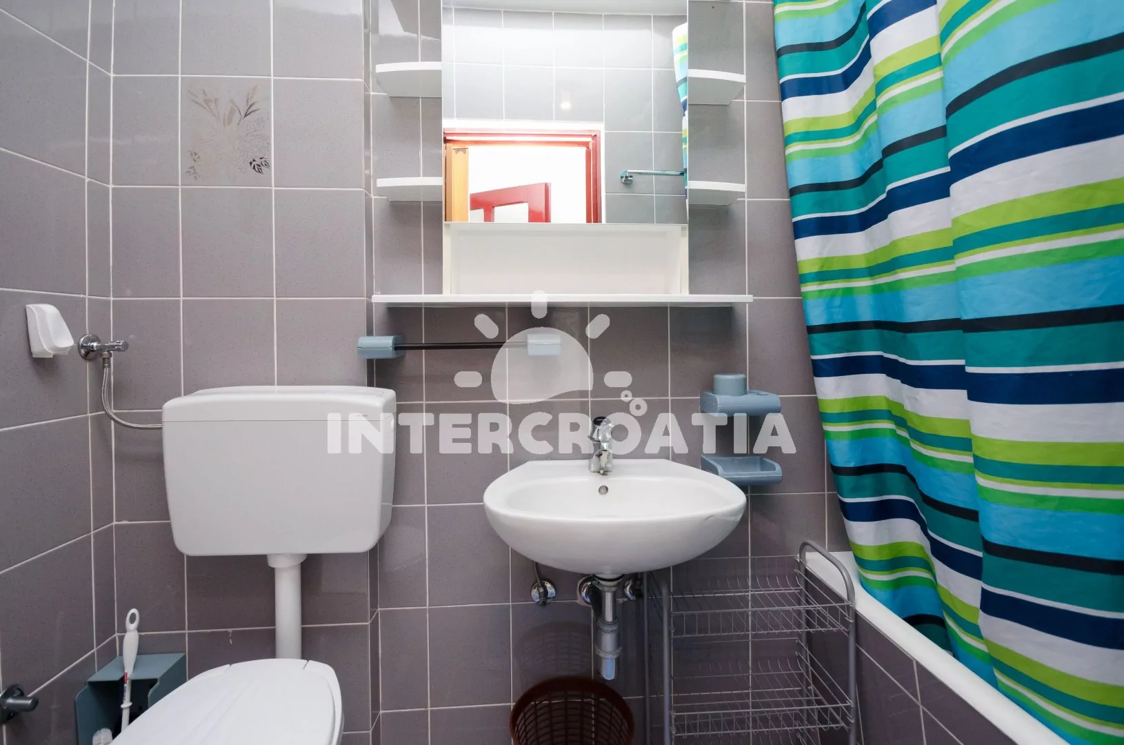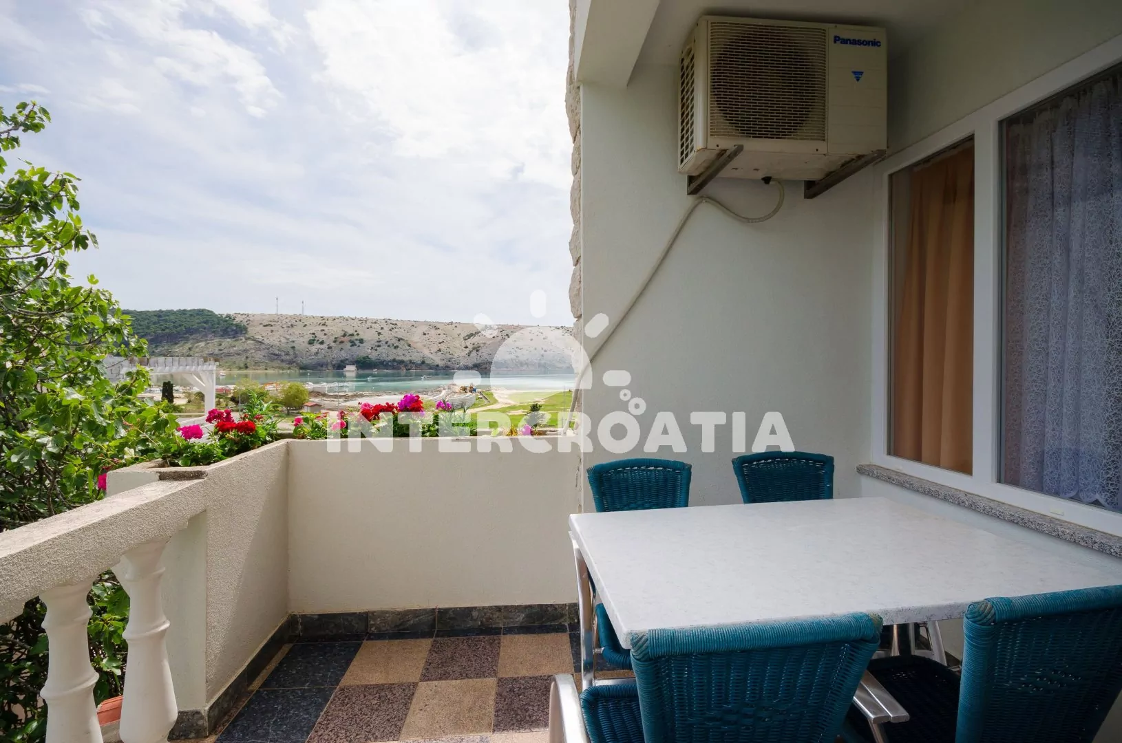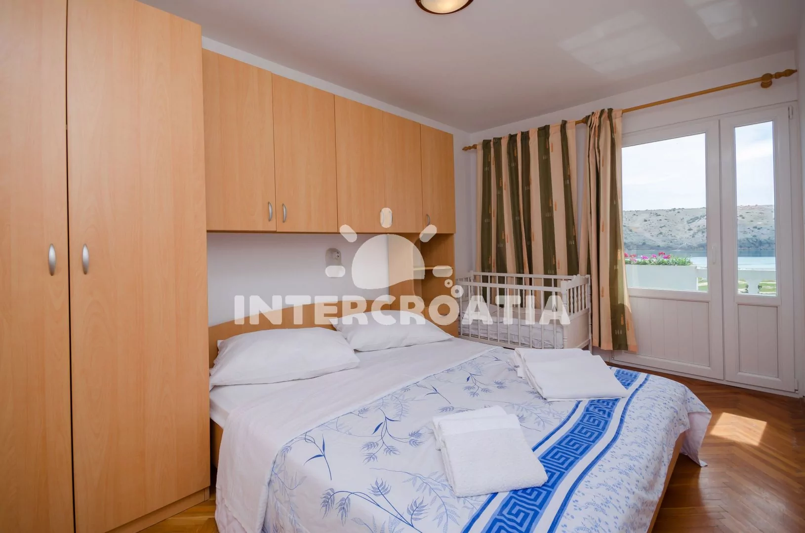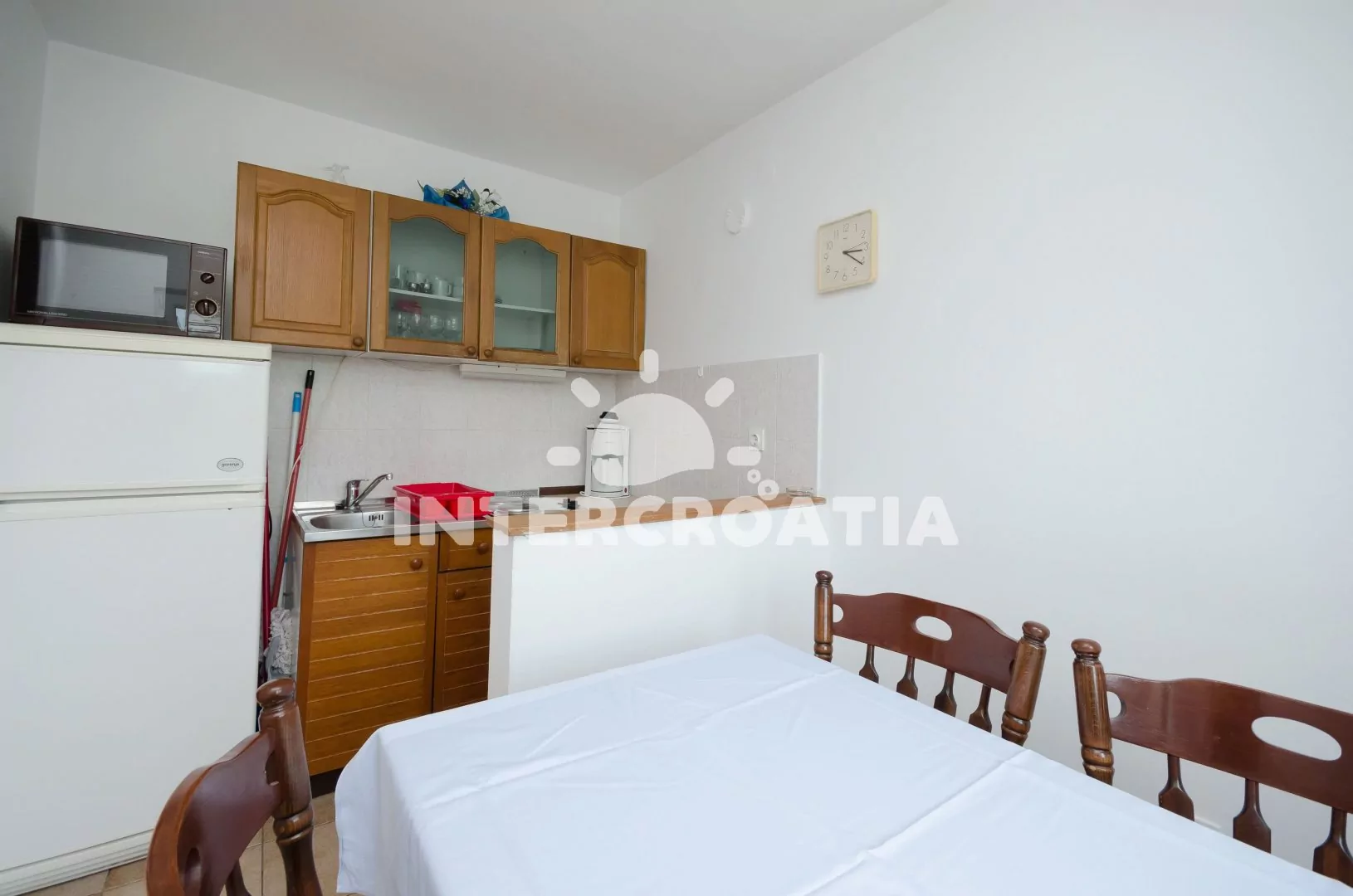 Apartmán (55 m2) s balkonem/terasou a výhledem na moře se nachází ve 2. patře domu. Apartmán má 2 ložnice a je vhodný pro až 4 osoby. Obývací pokoj je částečně oddělený od kuchyně. Kuchyňská linka je vybavena dvouplotýnkovým vařičem, mikrovlnnou troubou, rychlovarnou konvicí, nádobím a lednicí s mrazákem. Dále jídelní stůl pro 4 osoby. Obývací pokoj s pohovkou, televizí se satelitním programem, klimatizací a vstupem na terasu. První i druhá ložnice je vybavena vždy s jedním dvoulůžkem a vstupem na balkon. Koupelna s vanou, sprchovou zástěnou, umyvadlem a wc. Hostům je k dispozici parkování u objektu zdarma.