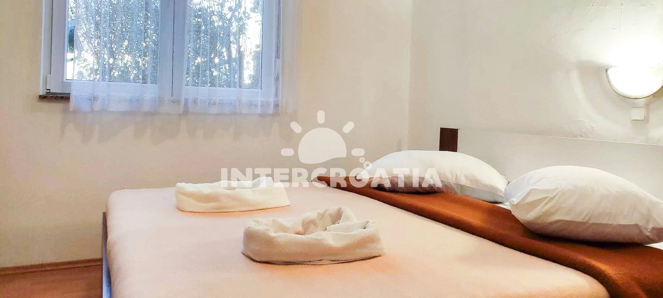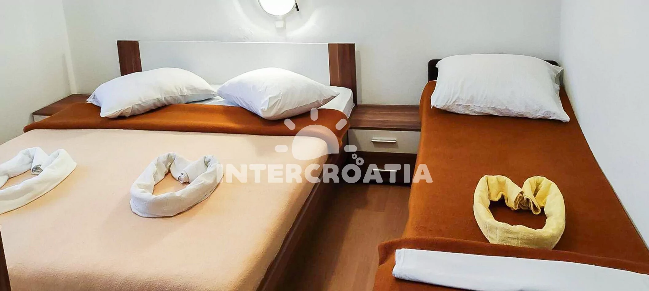 Apartmán (65 m2) s terasou a venkovním posezením se nachází v přízemí domu. Apartmán má 2 ložnice a je vhodný pro až 5 osob. Obývací pokoj je spojený s kuchyní. Kuchyňská linka je vybavena sporákem s troubou, digestoří, mikrovlnnou troubou, rychlovarnou konvicí, kávovarem, nádobím a lednicí s mrazákem. Obývací pokoj s jídelním stolem, pohovkou, televizí se satelitním programem, klimatizací a vstupem na terasu. První ložnice s dvoulůžkem a jednolůžkem. Druhá ložnice s dvoulůžkem. Koupelna se sprchovým koutem, umyvadlem, pračkou a wc. Hostům je k dispozici parkování u objektu zdarma.