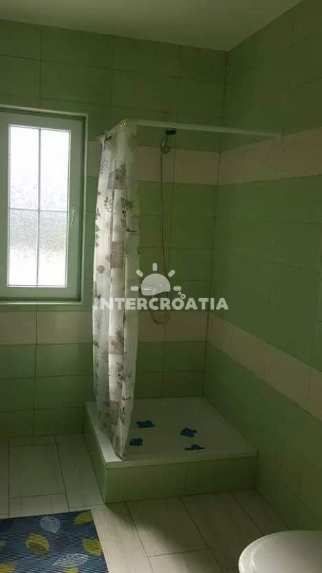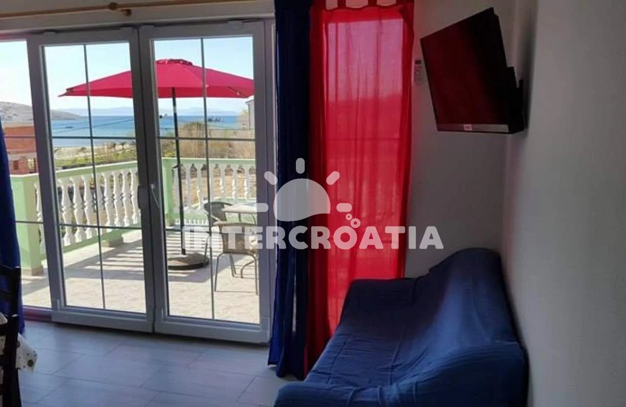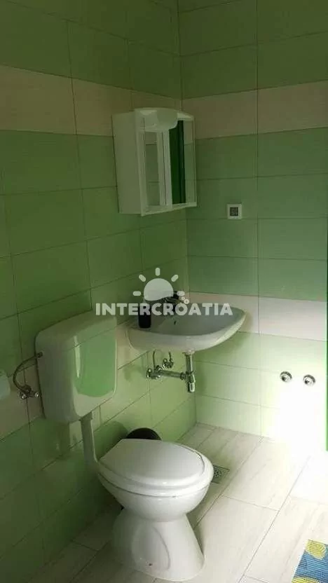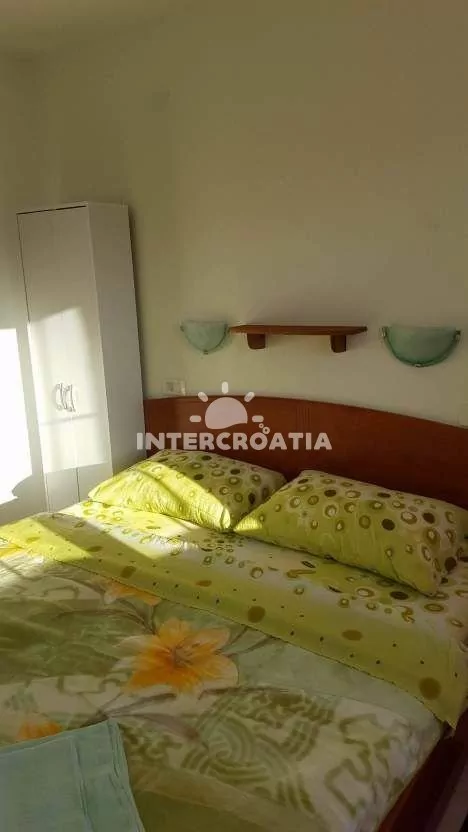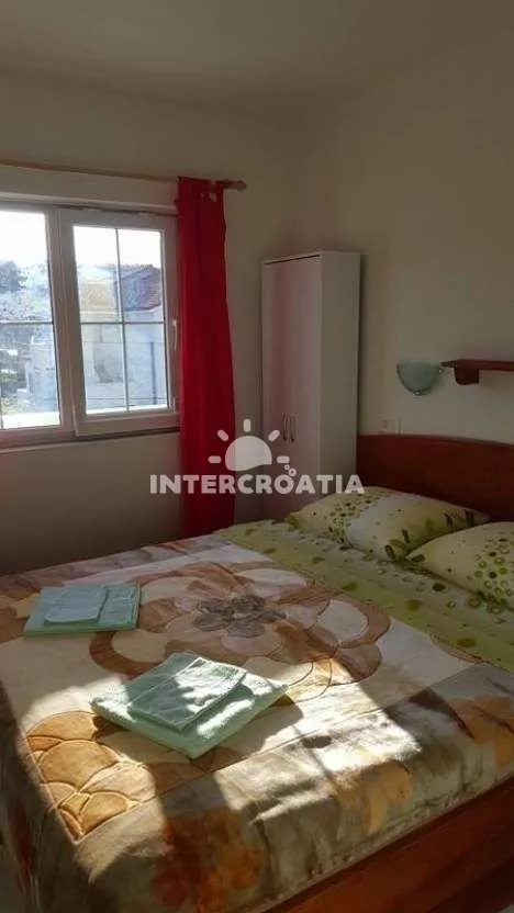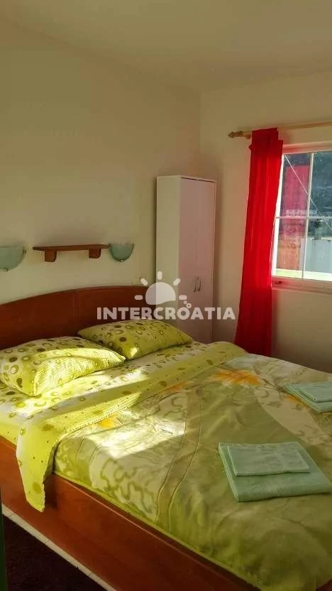 Apartmán (50 m2) s terasou/balkonem, posezením a výhledem na moře se nachází ve zvýšeném přízemí domu. Apartmán má 2 ložnice a je vhodný pro až 4 osoby. Obývací pokoj je spojený s kuchyní. Kuchyňská linka je vybavena sporákem s troubou, digestoří, mikrovlnnou troubou, rychlovarnou konvicí, kávovarem, nádobím a lednicí s mrazákem. Obývací pokoj s jídelním stolem, pohovkou, televizí se satelitním programem, klimatizací a vstupem na terasu. První i druhá ložnice je vybavena vždy s jedním dvoulůžkem. Koupelna se sprchovým koutem, umyvadlem a wc. Hostům je k dispozici parkování u objektu zdarma.