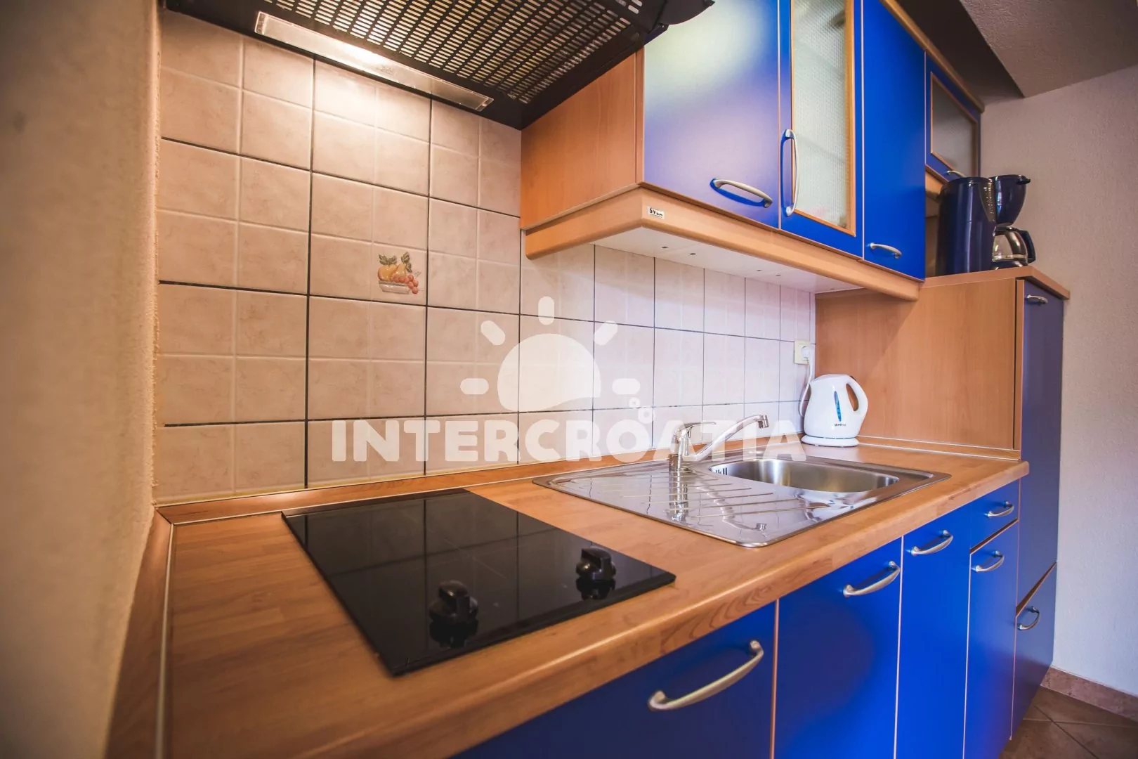 Apartmán (60 m2) s terasou a venkovním posezením se nachází v 1. patře domu. Apartmán má 2 ložnice, 2 koupelny a je vhodný pro 4 až 5 osob. Obývací pokoj je spojený s kuchyní. kuchyňská linka je vybavena dvouplotýnkovým vařičem, digestoří, mikrovlnnou troubou, kávovarem, rychlovarnou konvicí, toustovačem, nádobím a lednicí s mrazákem. Obývací pokoj s jídelním stolem, pohovkou (rozložitelná na extra lůžko pro 1 osobu), televizí, klimatizací a vstupem na terasu. První i druhá ložnice je vybavena vždy s jedním dvoulůžkem. Dvě koupelny se sprchovým koutem, umyvadlem, fénem a wc. Hostům je k dispozici parkování u objektu zdarma.