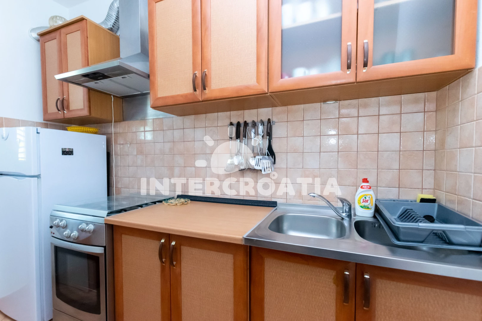 Apartmán (65 m2) s terasou a venkovním posezením se nachází v přízemí domu. Apartmán má 2 ložnice, 2 koupelny a je vhodný pro až 5 osob. Obývací místnost je spojena s kuchyní. Kuchyňská linka je…