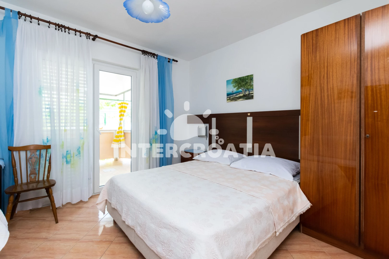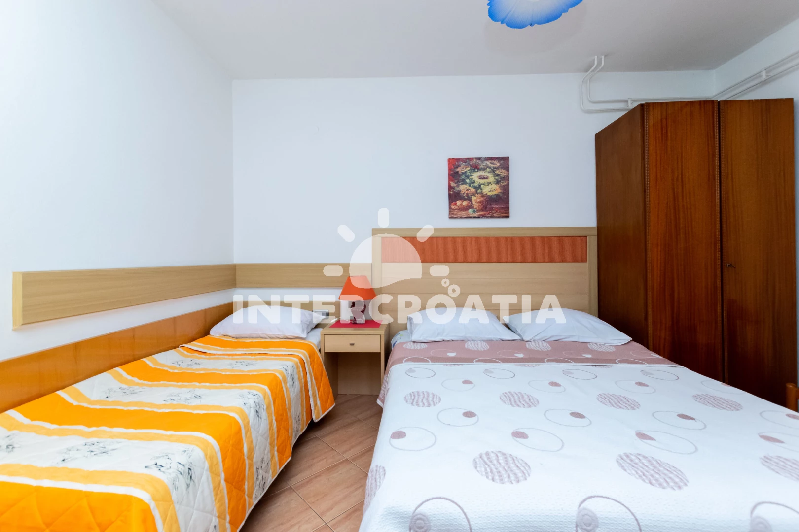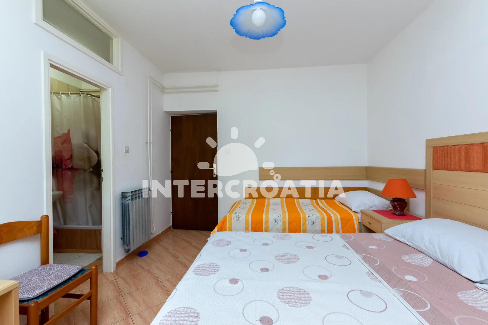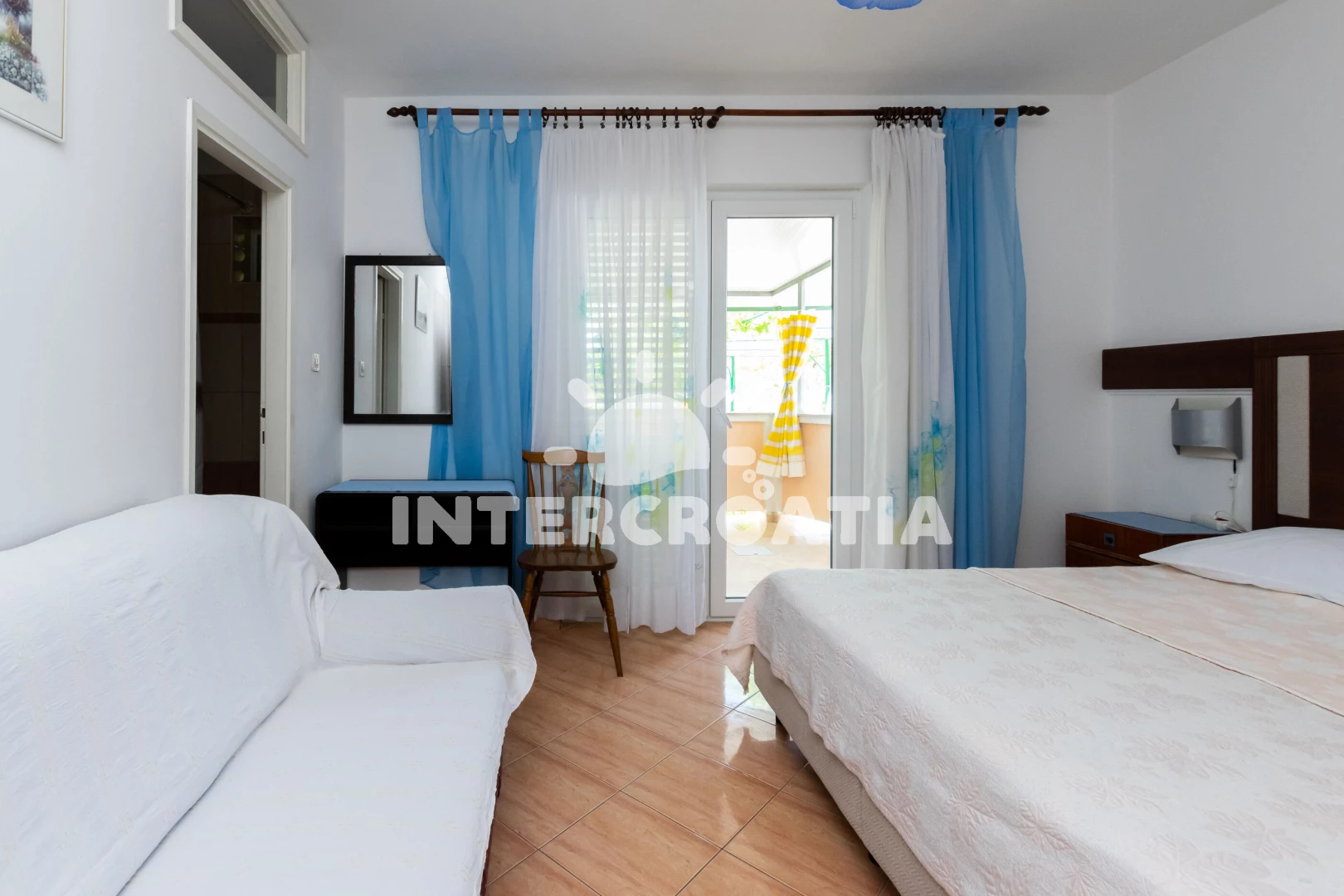 Apartmán (65 m2) s terasou a venkovním posezením se nachází v přízemí domu. Apartmán má 2 ložnice, 2 koupelny a je vhodný pro až 5 osob. Obývací místnost je spojena s kuchyní. Kuchyňská linka je vybavena sporákem s troubou, digestoří, rychlovarnou konvicí, mikrovlnnou troubou, kávovarem, nádobím a lednicí s mrazákem. Obývací místnost s jídelním stolem, televizí se satelitním programem a klimatizací. První ložnice s dvoulůžkem, pohovkou a vstupem na terasu. Druhá ložnice s dvoulůžkem a jednolůžkem. Dvě koupelny se sprchovým koutem, umyvadlem a wc. Hostům je k dispozici parkování u objektu zdarma.