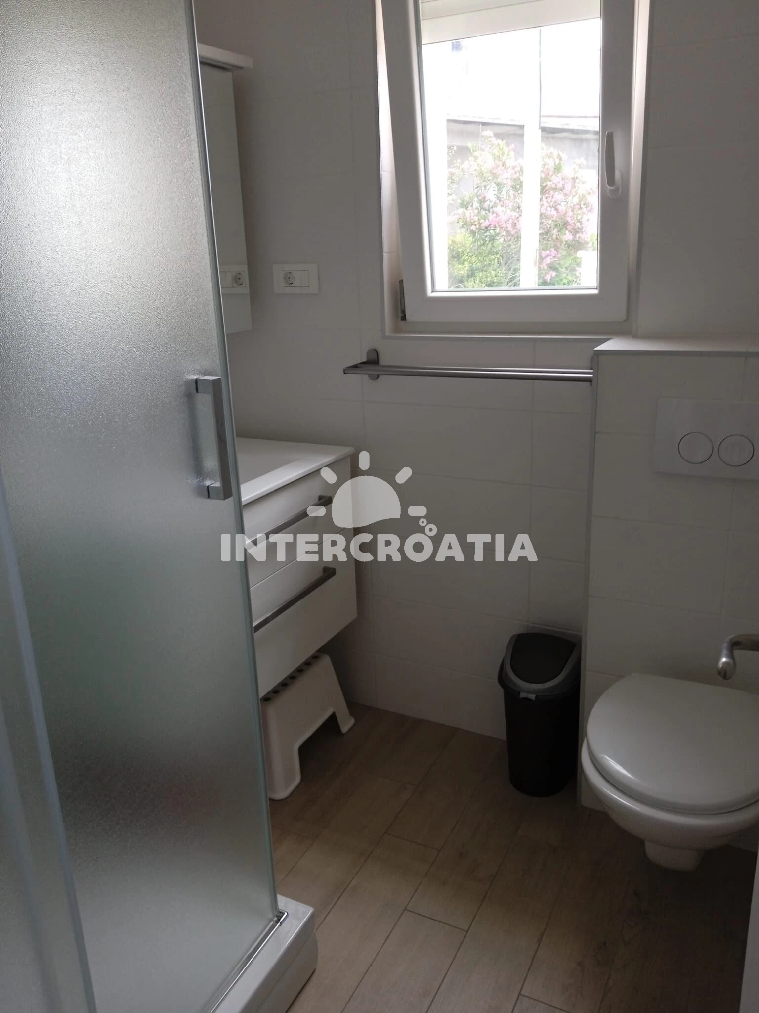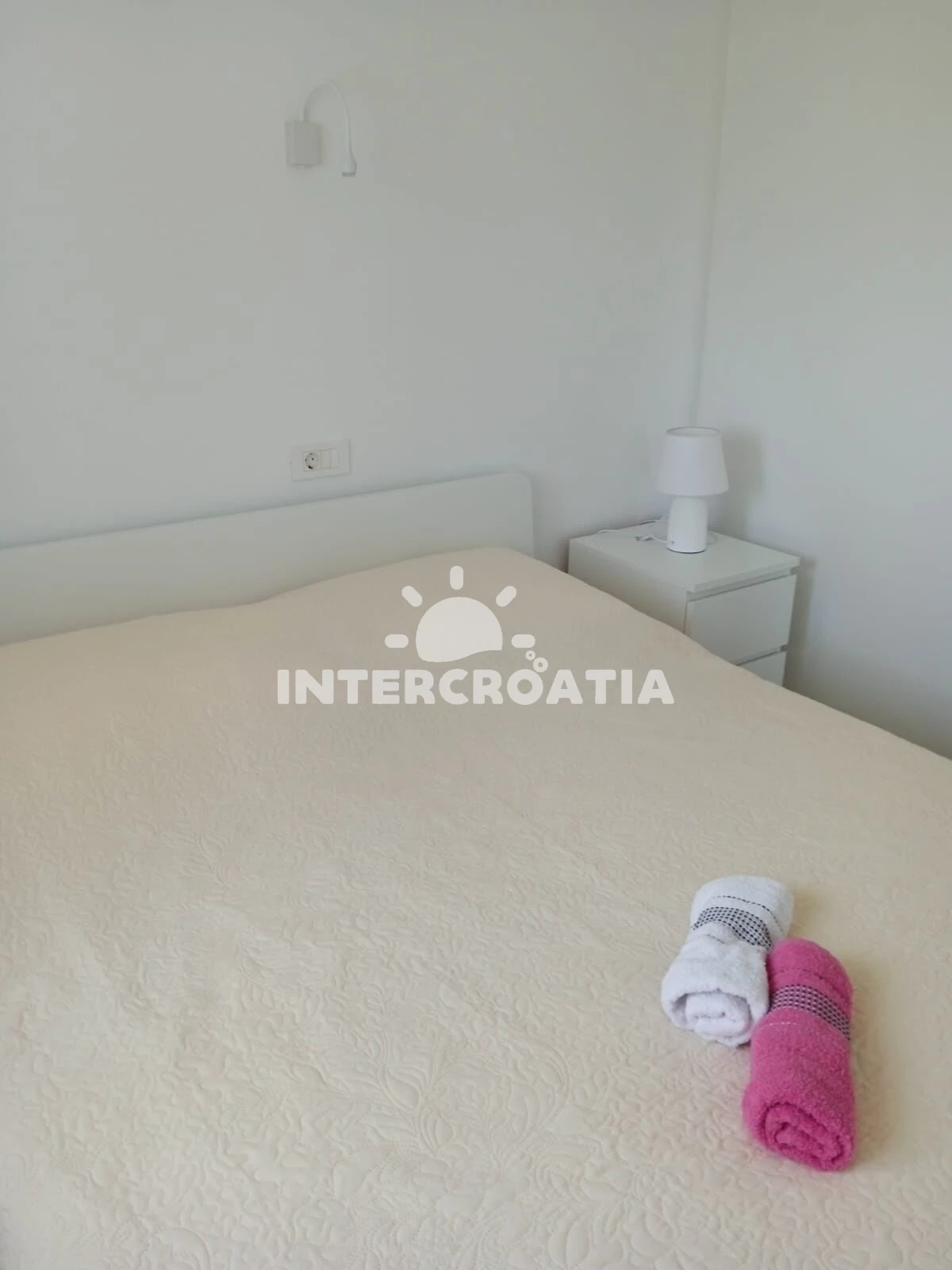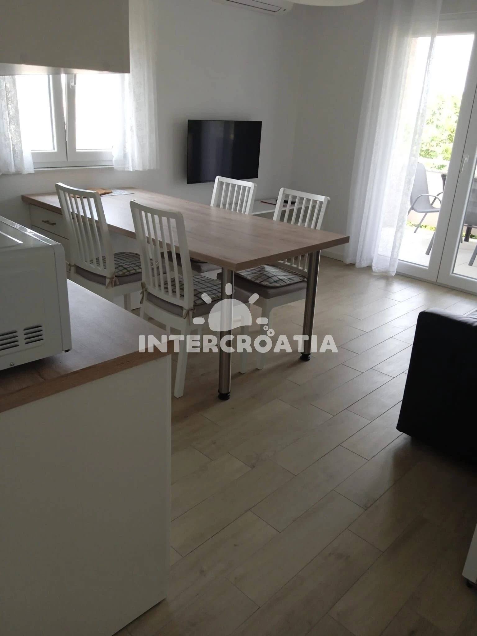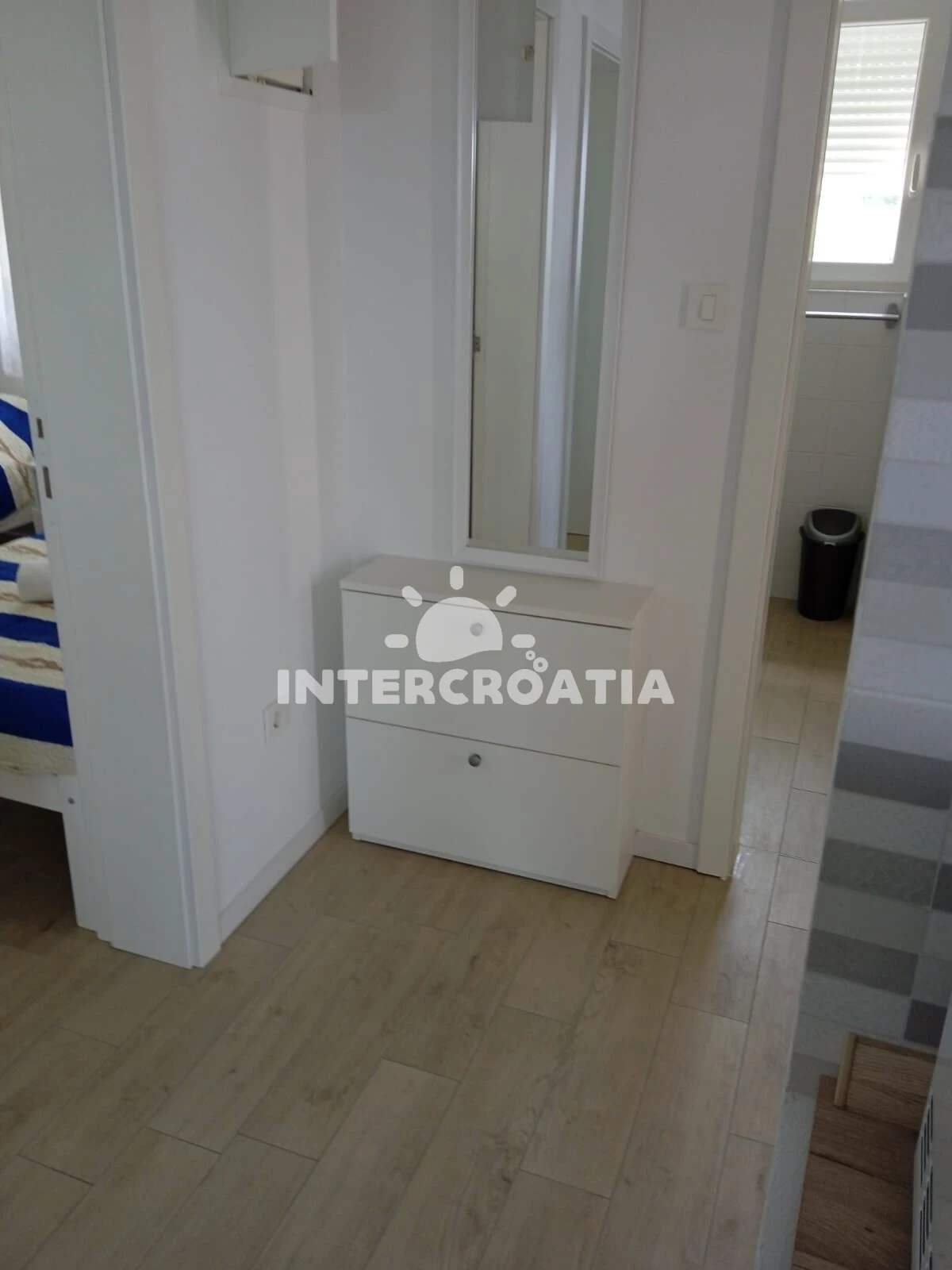Apartmán (45 m2) s terasou a venkovním posezením se nachází v 1. patře domu. Apartmán má 2 ložnice a je vhodný pro až 5 osob. Obývací pokoj je spojený s kuchyní. Kuchyňská linka je vybavena sklokeramickou varnou deskou, digestoří, vestavěnou troubou, myčkou na nádobí, mikrovlnnou troubou, rychlovarnou konvicí, toustovačem, nádobím a lednicí s mrazákem. Obývací pokoj s jídelním stolem, pohovkou (rozložitelná na extra lůžko pro 1 osobu), televizí se satelitním programem, klimatizací a vstupem na terasu. První ložnice s dvoulůžkem. Druhá ložnice se dvěma jednolůžky. Koupelna se sprchovým koutem, umyvadlem a wc. Hostům je k dispozici parkování u objektu zdarma.