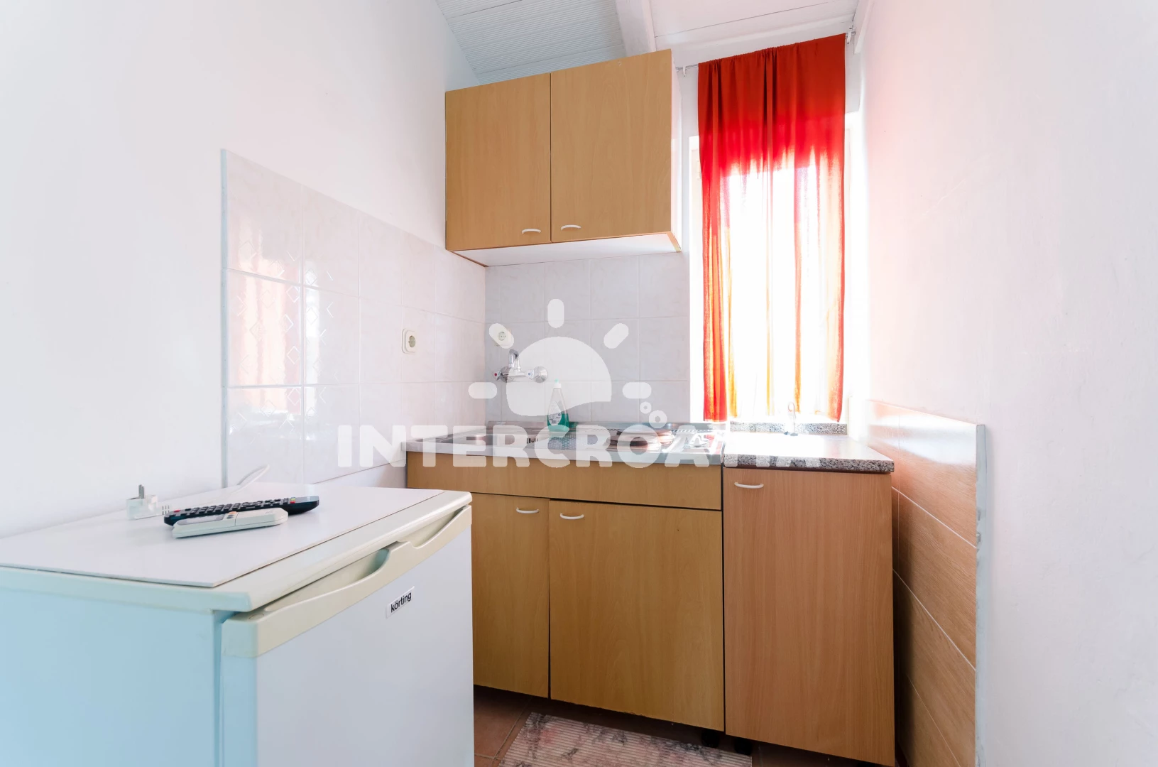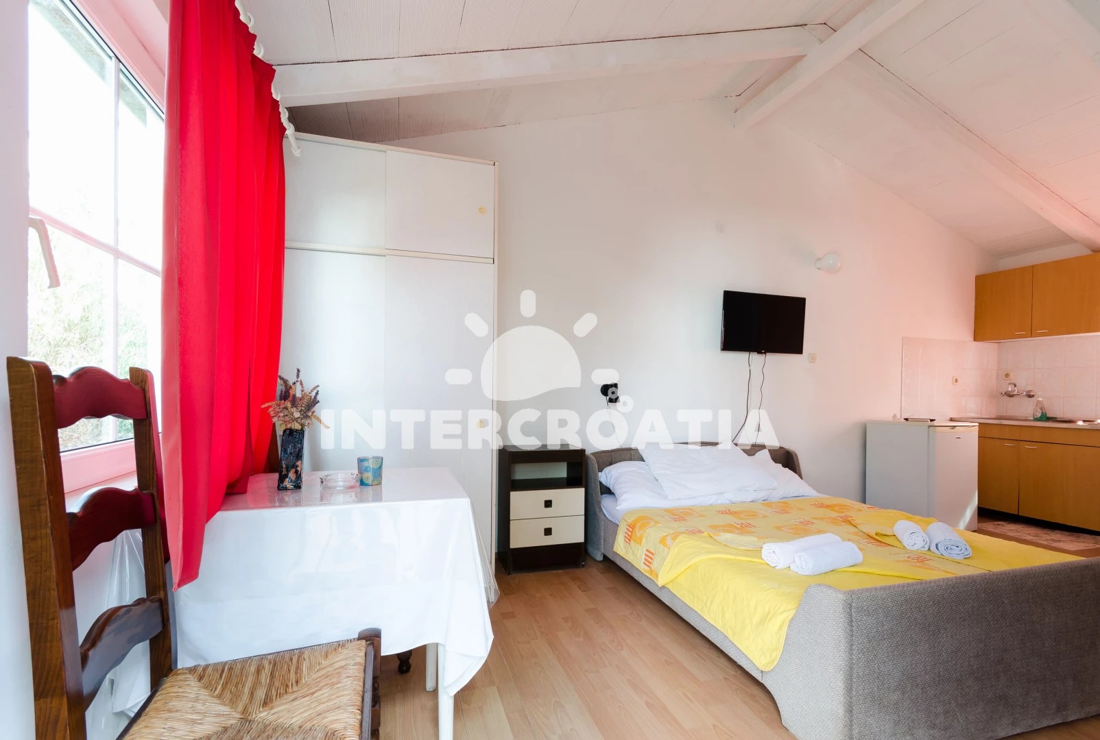 Apartmán typu studio (22 m2) s terasou. Nachází se v 1. patře objektu. Kuchyňská linka je vybavena varnou deskou, rychlovarnou konvicí, nádobím, lednicí, mrazákem. K dispozici dvoulůžko, televize se satelitním programem. Koupelna se sprchovým koutem, umyvadlem, WC.