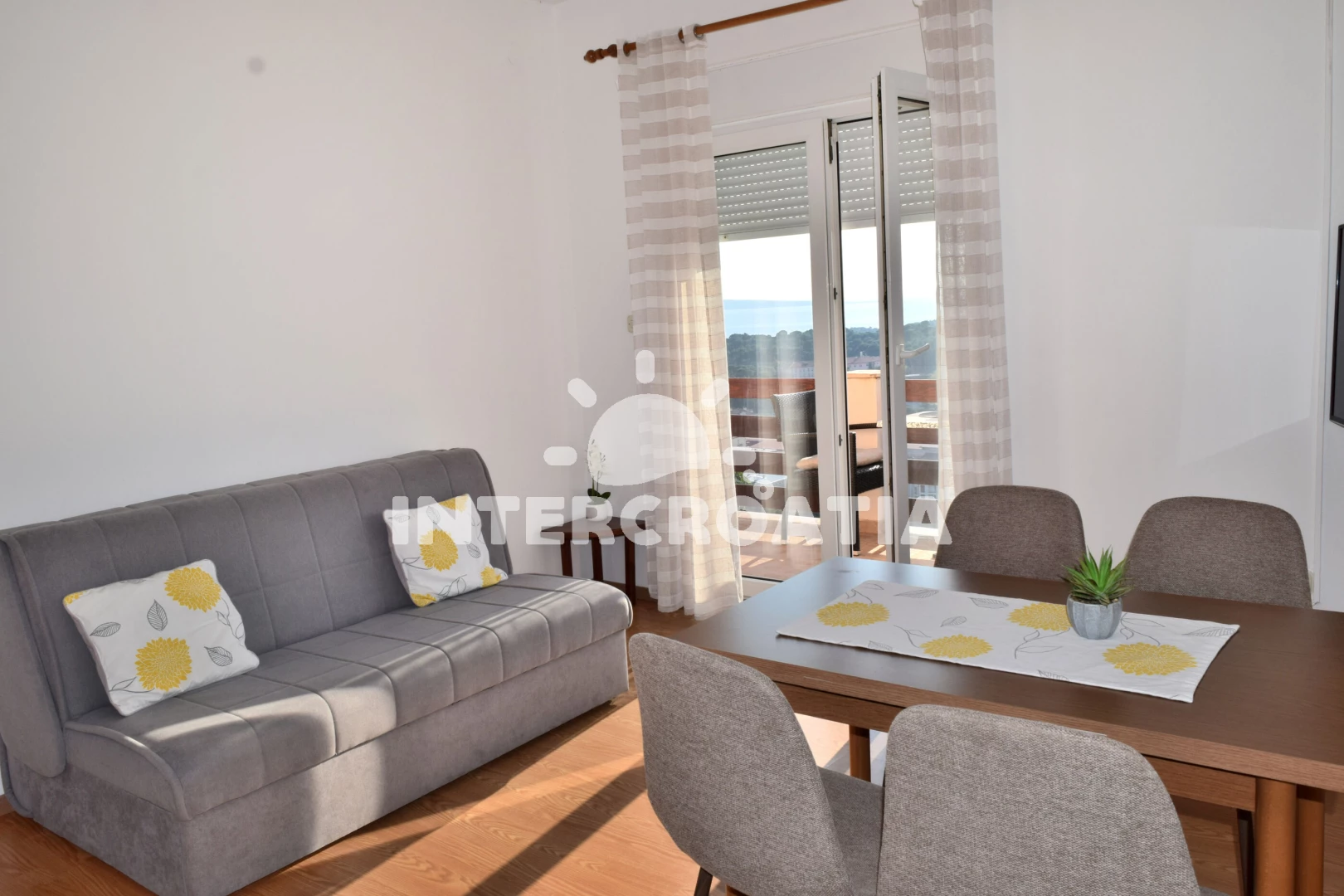 Apartmán (45 m2) s terasou, a výhledem na moře. Nachází se v 1. patře objektu. Apartmán má 1 ložnici a je vhodný pro až 3 osoby. Kuchyňská linka je vybavena varnou deskou, kávovarem, troubou, toustovačem, myčkou na nádobí, rychlovarnou konvicí, nádobím, lednicí, mrazákem. V obývací místnosti je rozložitelná pohovka (extra lůžko pro 1 osobu). K dispozici televize se satelitním programem. Ložnice s dvoulůžkem. Koupelna se sprchovým koutem, umyvadlem, fénem a WC.
