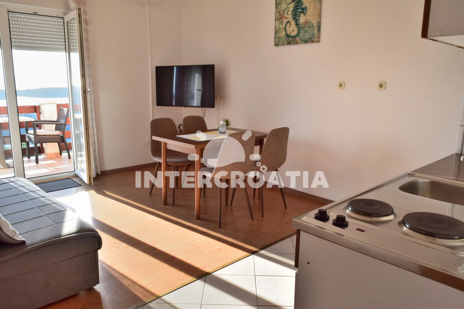Apartmán (45 m2) s terasou, a výhledem na moře. Nachází se v 1. patře objektu. Apartmán má 1 ložnici a je vhodný pro až 3 osoby. Kuchyňská linka je vybavena varnou deskou, kávovarem, troubou,…