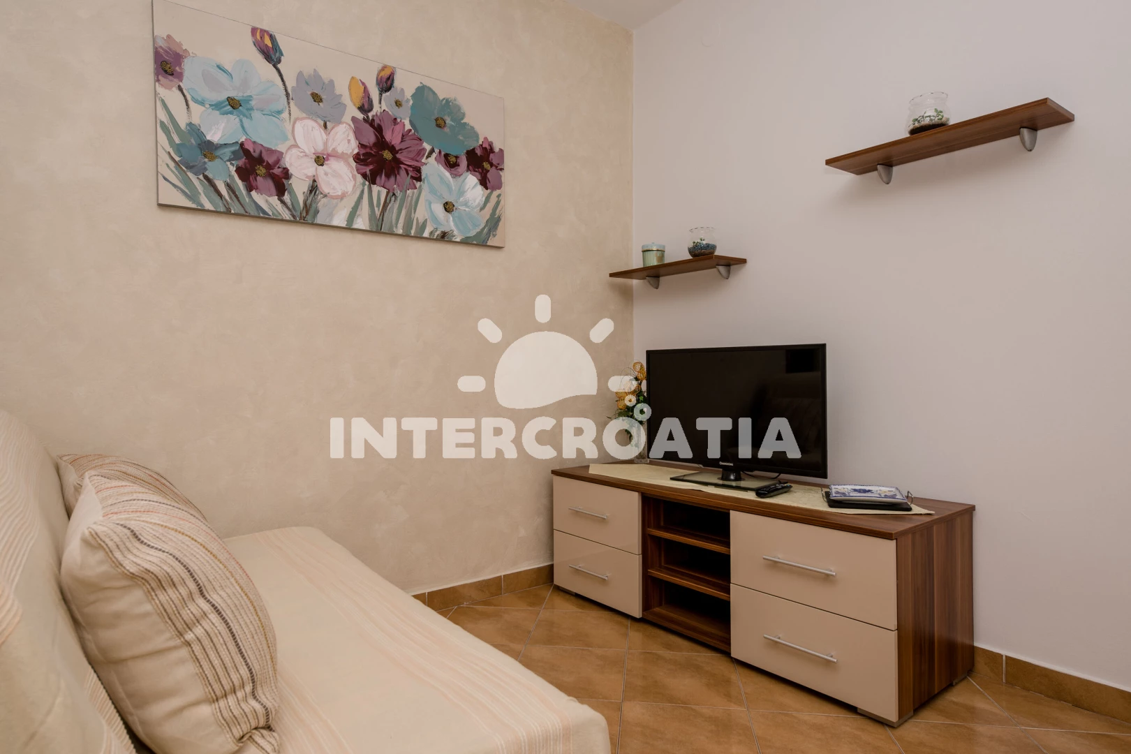 Apartmán se nachází 200 m od moře a pláže. Pláž je písčitá a betonové desky.