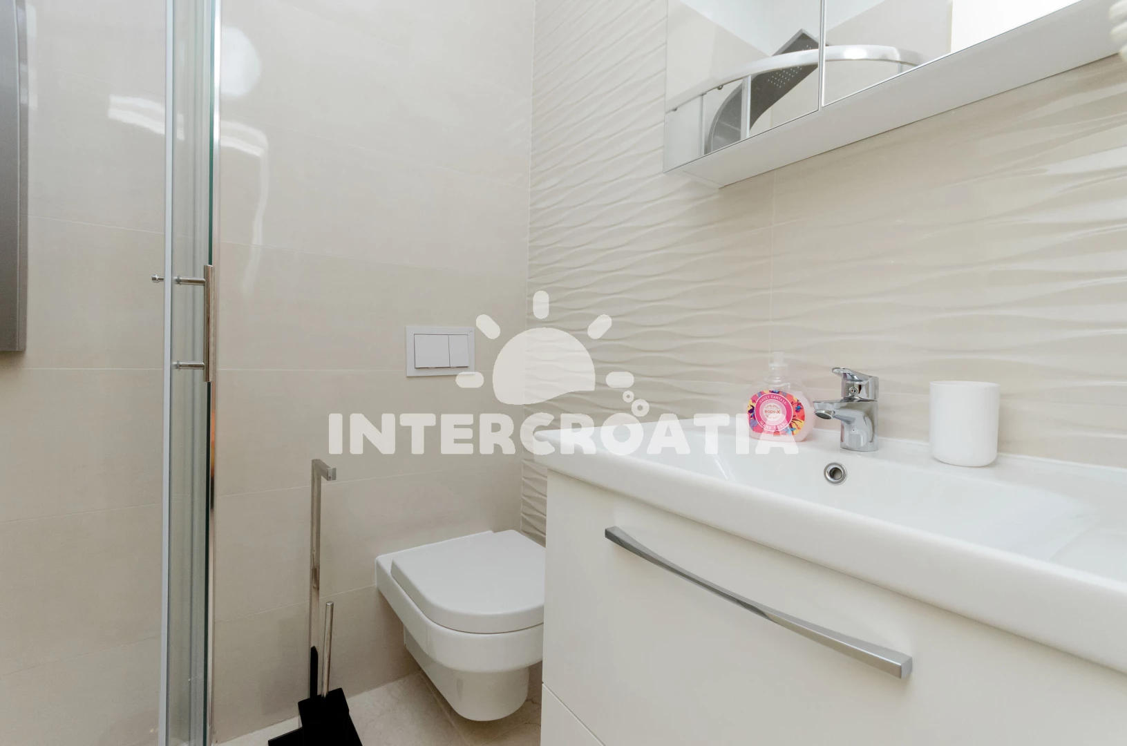 Apartmán se nachází 750 m od moře a pláže. Pláž je oblázková a betonové desky. Apartmán disponuje bazénem s lehátky pro ubytované hosty. U objektu je k dispozici společná zahrada s posezením a grilem. Parkování je před domem.