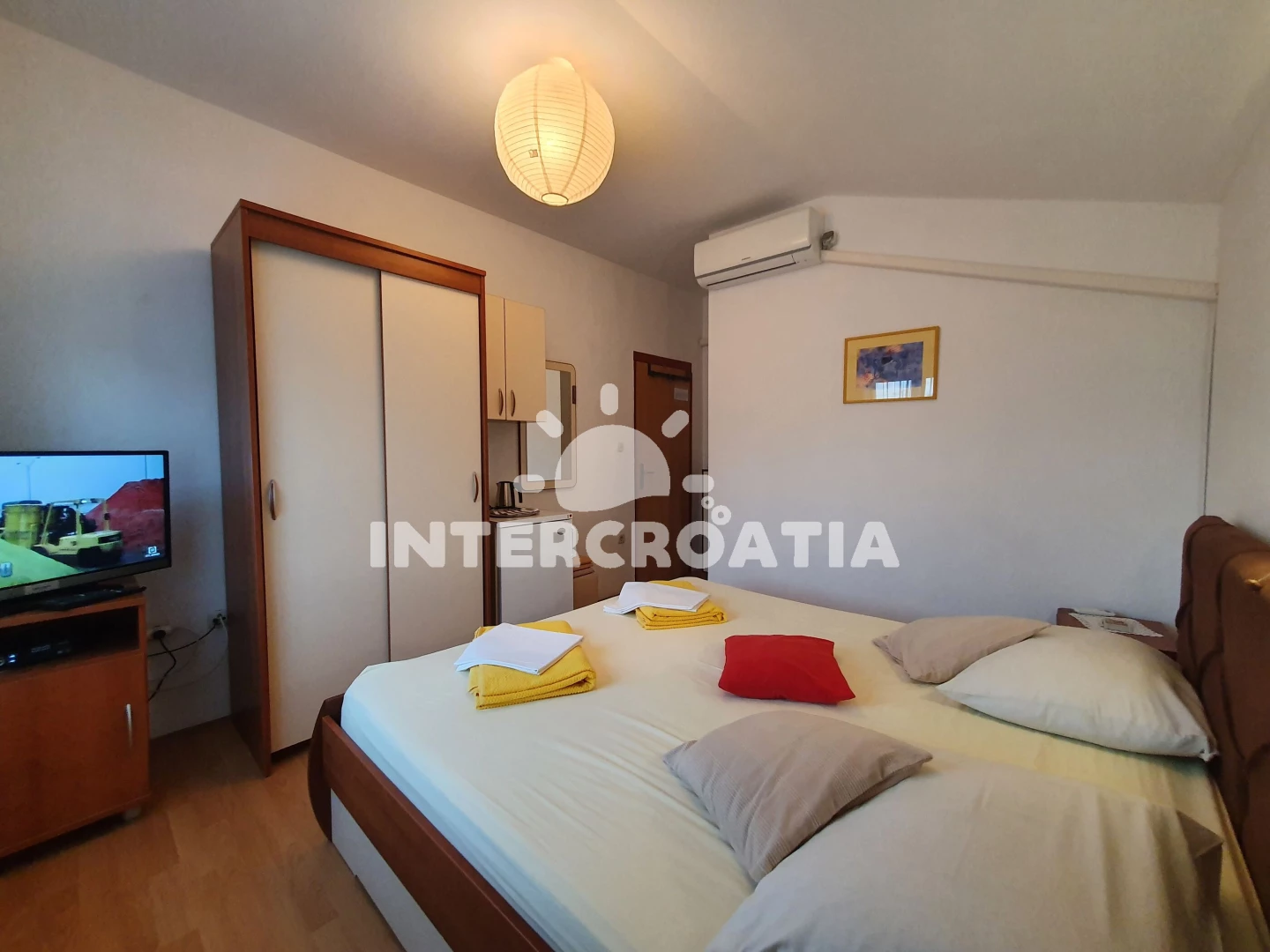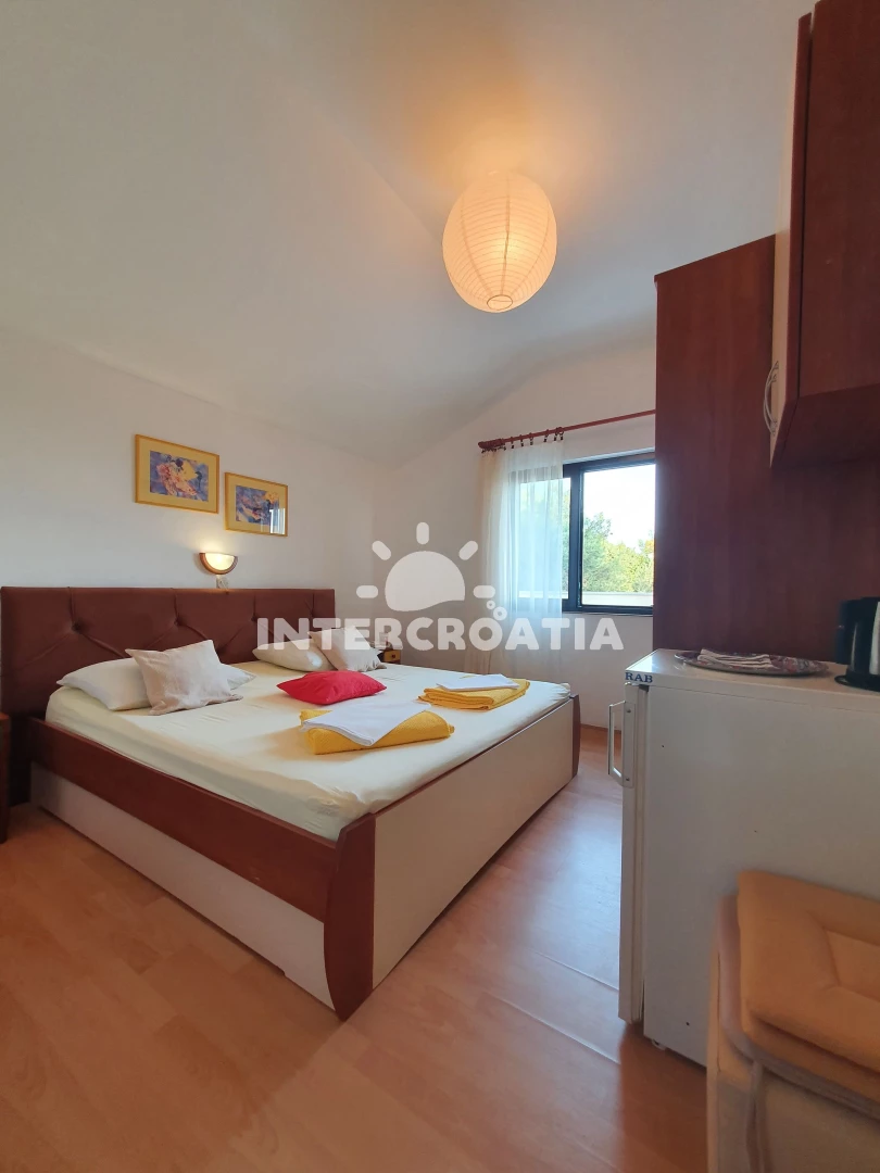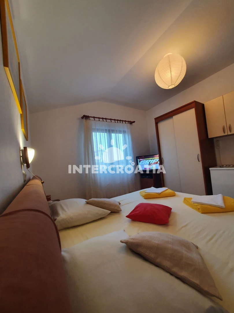 Apartmán (24 m2) s výhledem na moře. Nachází se ve 2. patře objektu. Kuchyňská linka je vybavena rychlovarnou konvicí, mini lednicí. K dispozici dvoulůžko, televize se satelitním programem. Koupelna s WC.