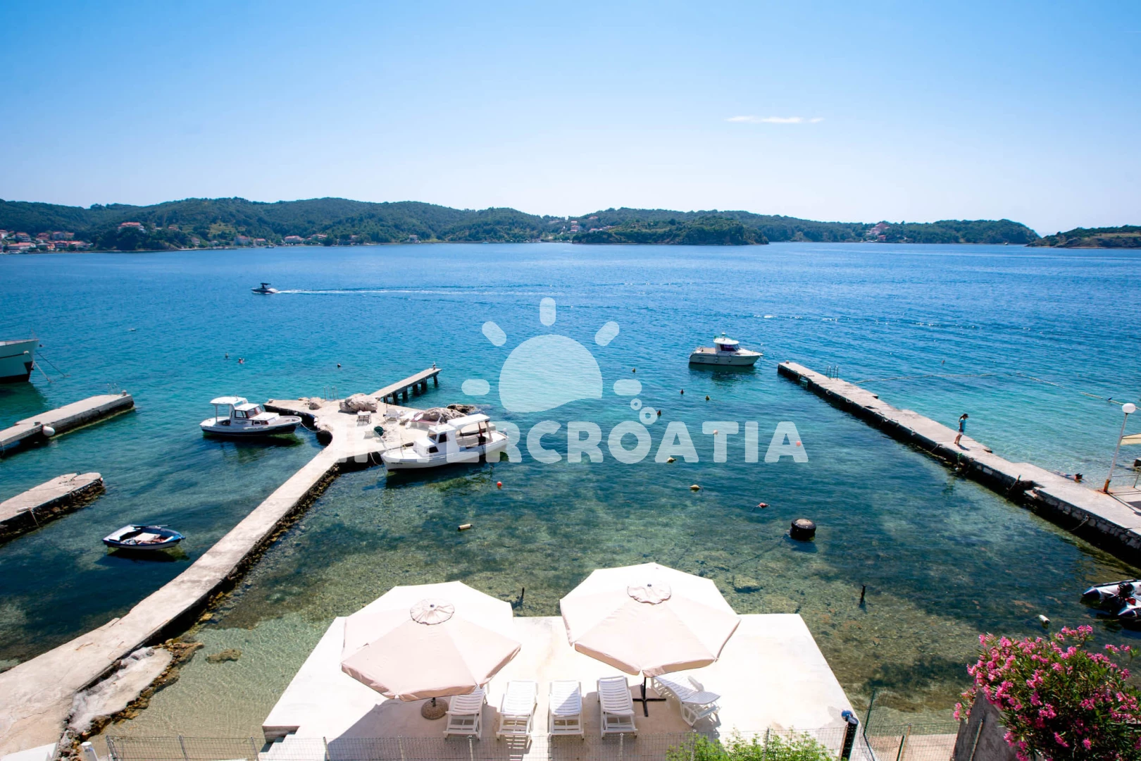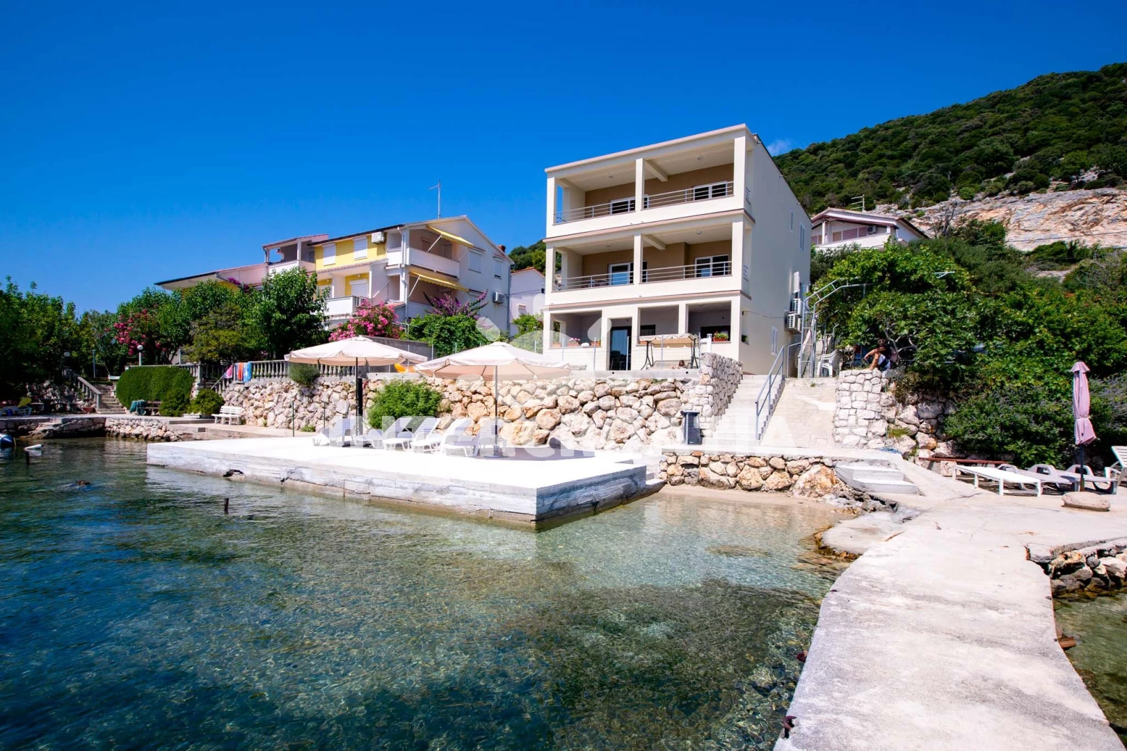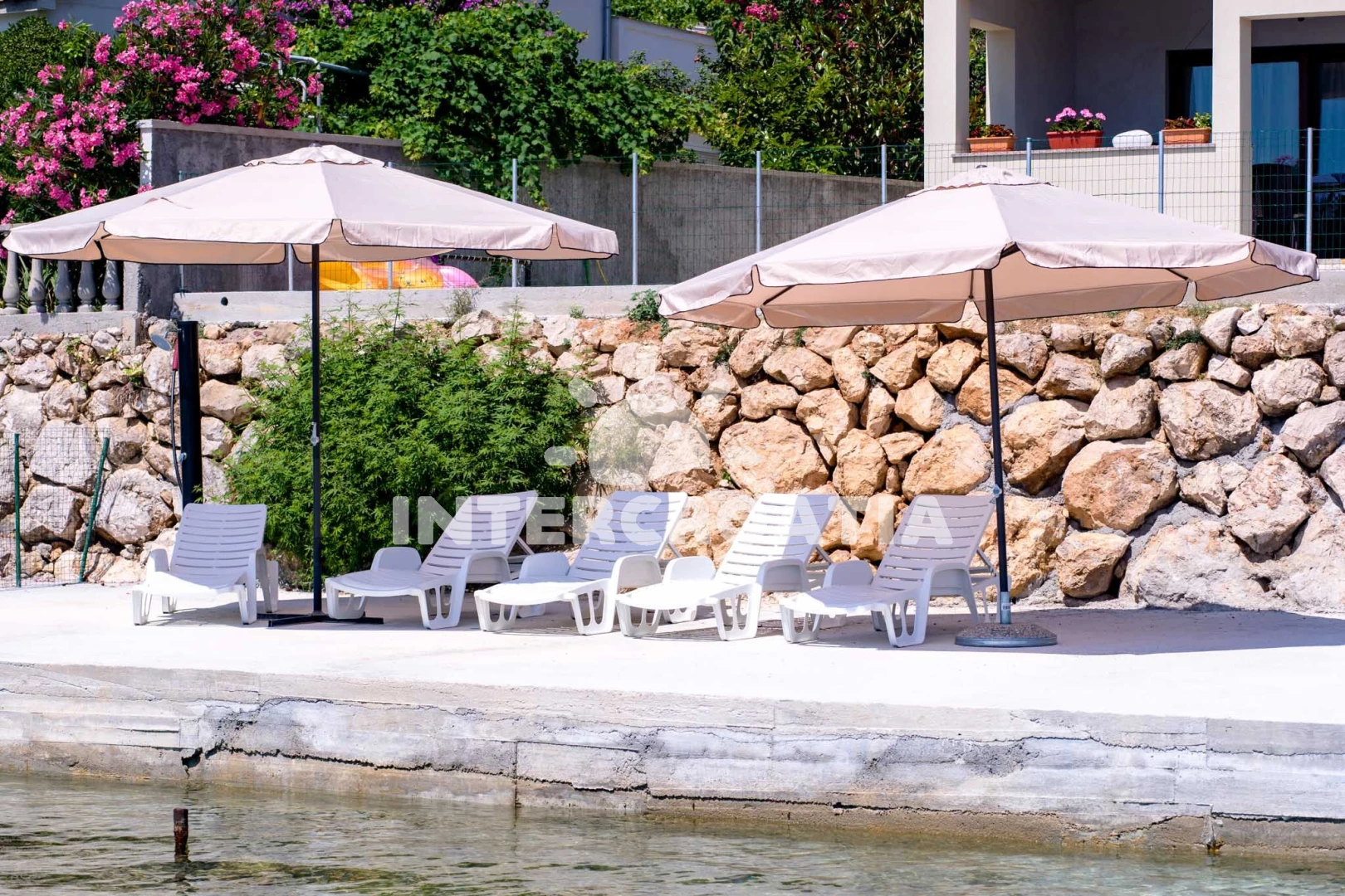 Vzdálenosti: Moře 5 m, pláž 5 m (oblázková a betonové desky), restaurace 100 m, veřejná doprava 200 m, půjčovna motorových člunů 400 m, bar 700 m, centrum 700 m, supermarket 700 m, čerpací stanice 2 km, pošta 3 km, mini golf 3 km, tenisové kurty 3 km, ambulance 3 km, směnárna 3 km, lékárna 3 km, půjčovna kol 3 km, muzeum 7 km, diskotéka 7 km, potápění 7 km, banka 7 km,