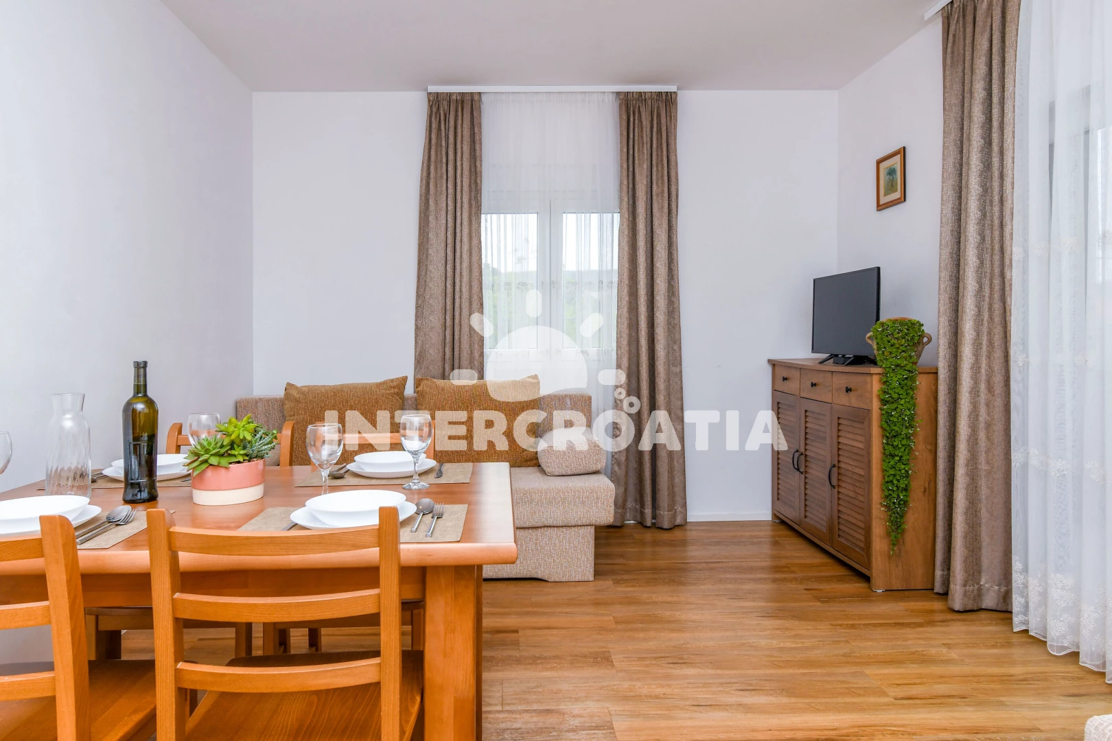 Apartmán (48 m2) s výhledem na moře. Nachází se v přízemí objektu. Apartmán má 1 ložnici a je vhodný pro až 4 osoby. Kuchyňská linka je vybavena varnou deskou, troubou, kávovarem, toustovačem, rychlovarnou konvicí, nádobím, lednicí, mrazákem. V obývací místnosti je rozložitelná pohovka (extra lůžko pro 2 osoby). K dispozici televize se satelitním programem, žehlička. Ložnice s dvoulůžkem. Koupelna se sprchovým koutem, umyvadlem, fénem a WC.