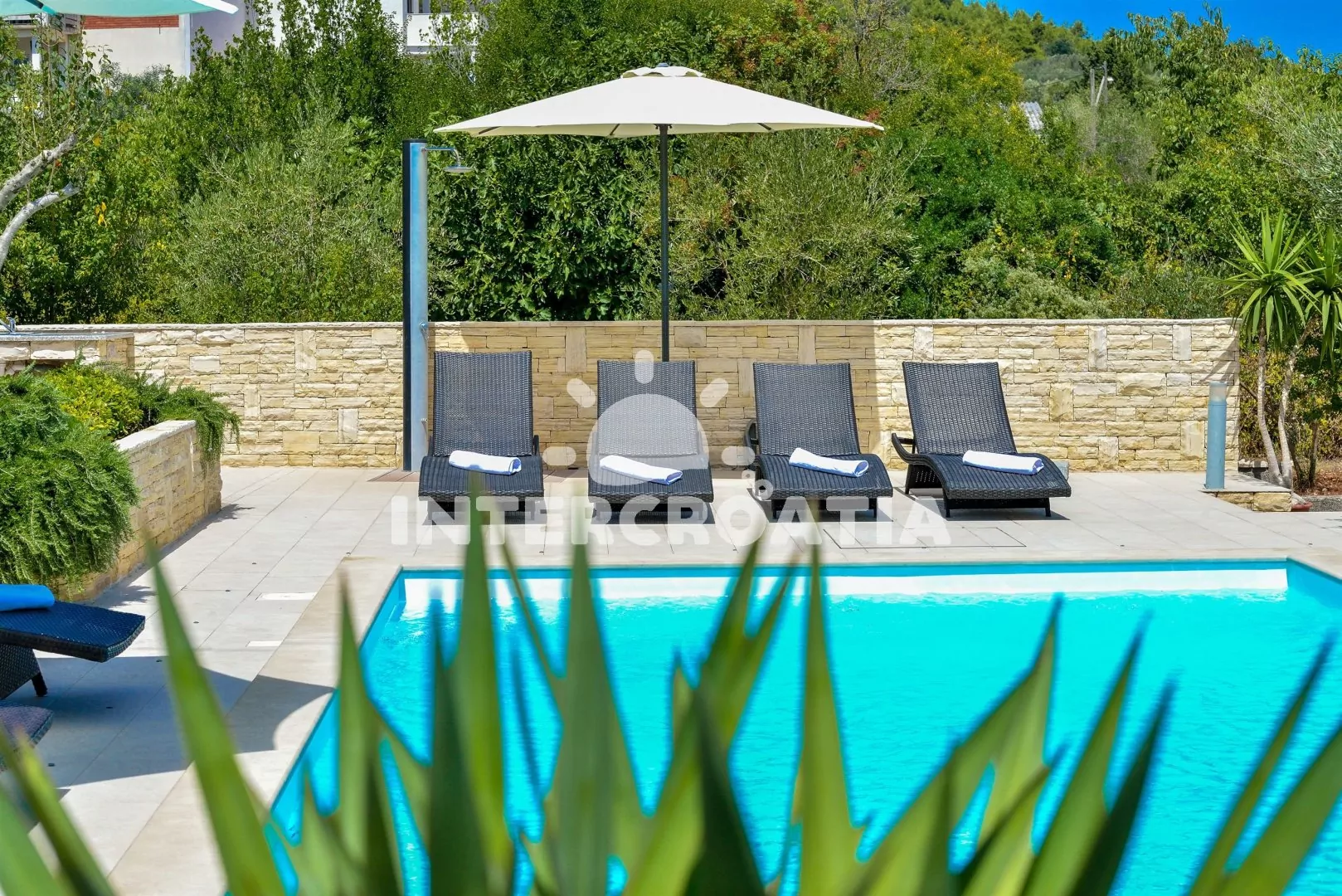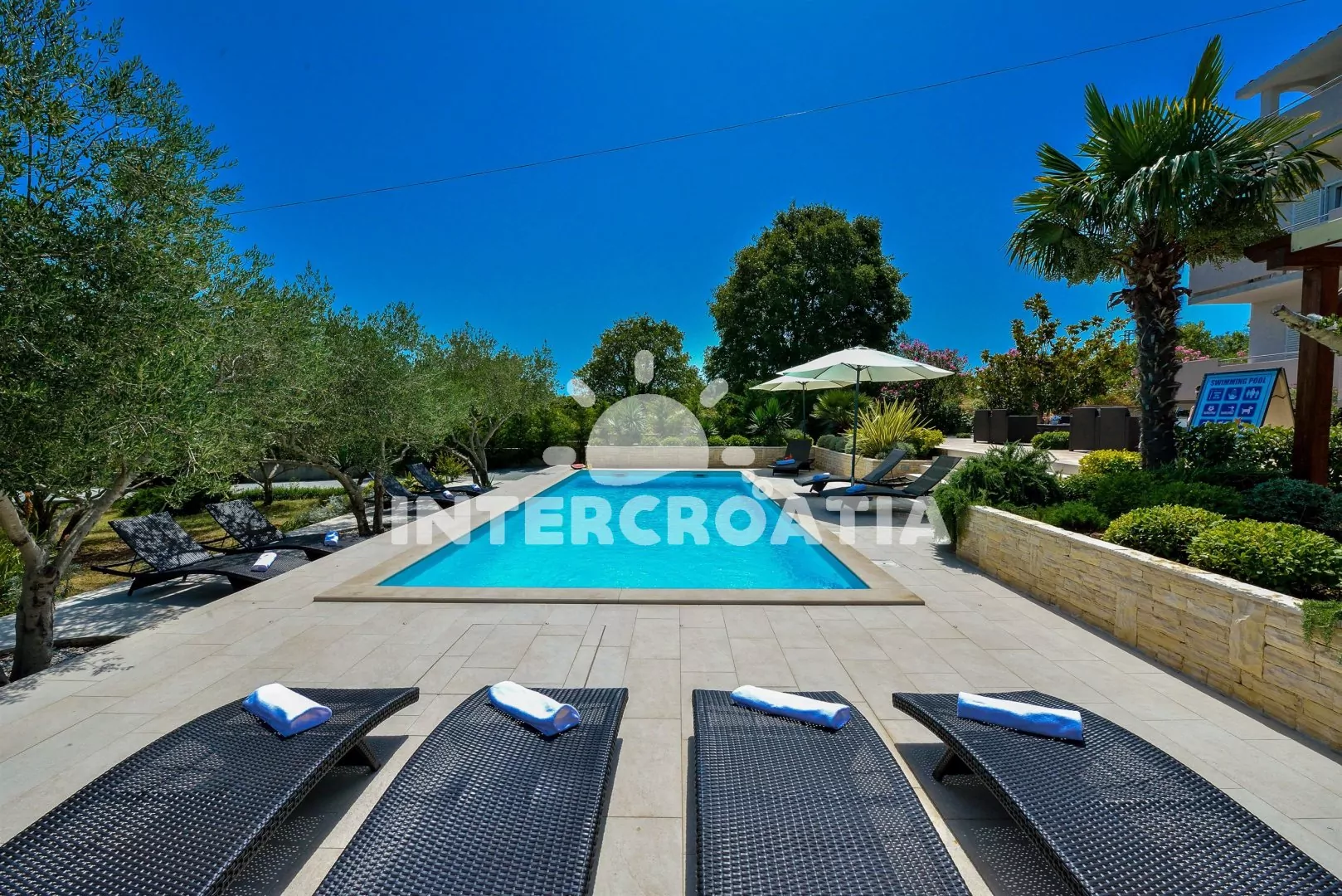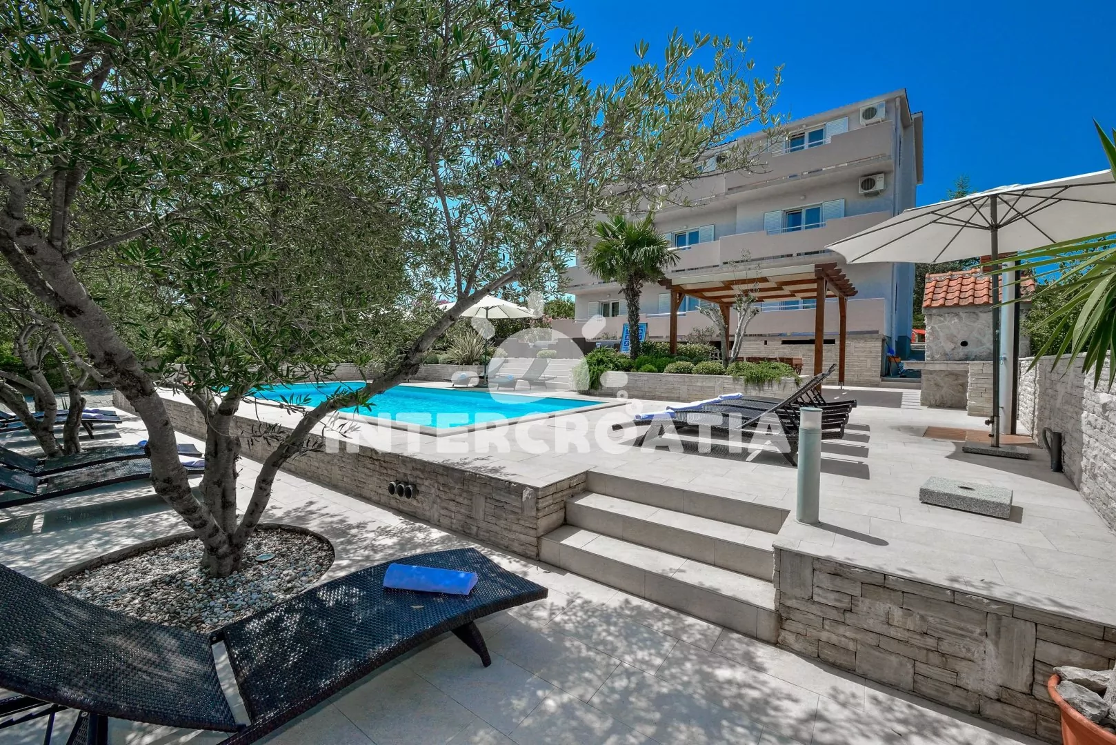 Třípodlažní apartmánová vila v zahradě s terasou, vlastním zapuštěným bazénem s lehátky a dobrou dostupností na pláž.