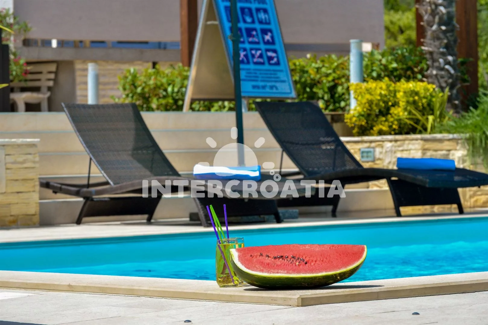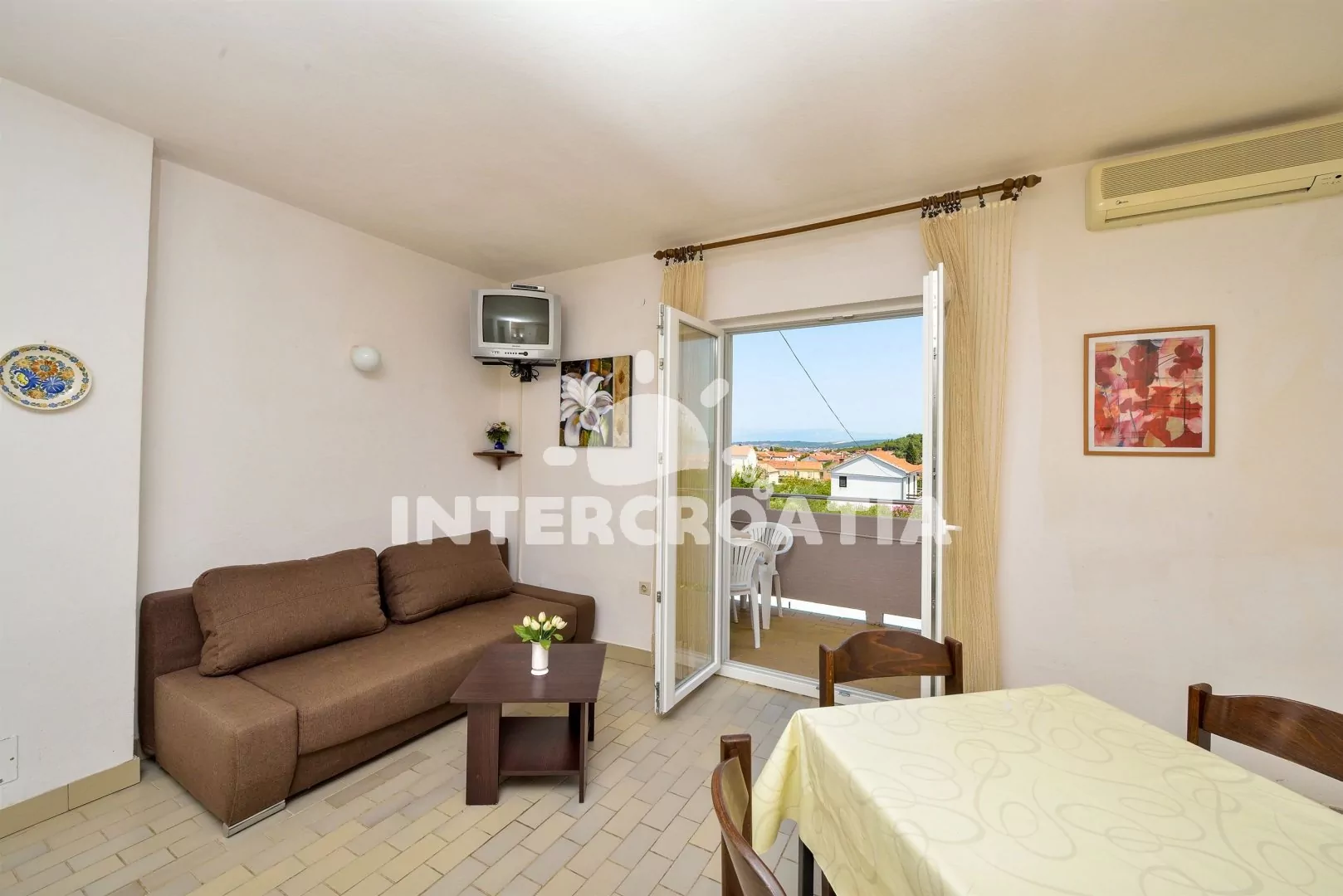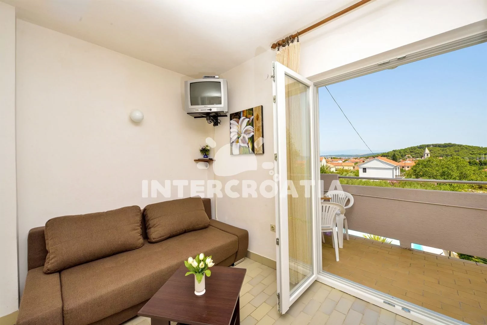 Dvoupokojový apartmán (40 m2) s terasou s posezením a výhledem na bazén i moře, nacházející se v 1. patře domu. Vstup, obývací místnost spojená s kuchyňským koutem. Kuchyňská linka s dvouplotýnkovým elektrickým vařičem, lednicí a nádobím. V obývací místnosti jídelní stůl pro 4 osoby, pohovka (rozložitelná na extra lůžko pro 2 osoby), televize, klimatizace a vstup na balkon. Ložnice s dvoulůžkem. Koupelna se sprchovým koutem, umyvadlem a wc. Hosté mají k dispozici terasu s posezením, v zahradě společný zapuštěný bazén s lehátky a posezení v pergole s grilem. Parkování u objektu zdarma.