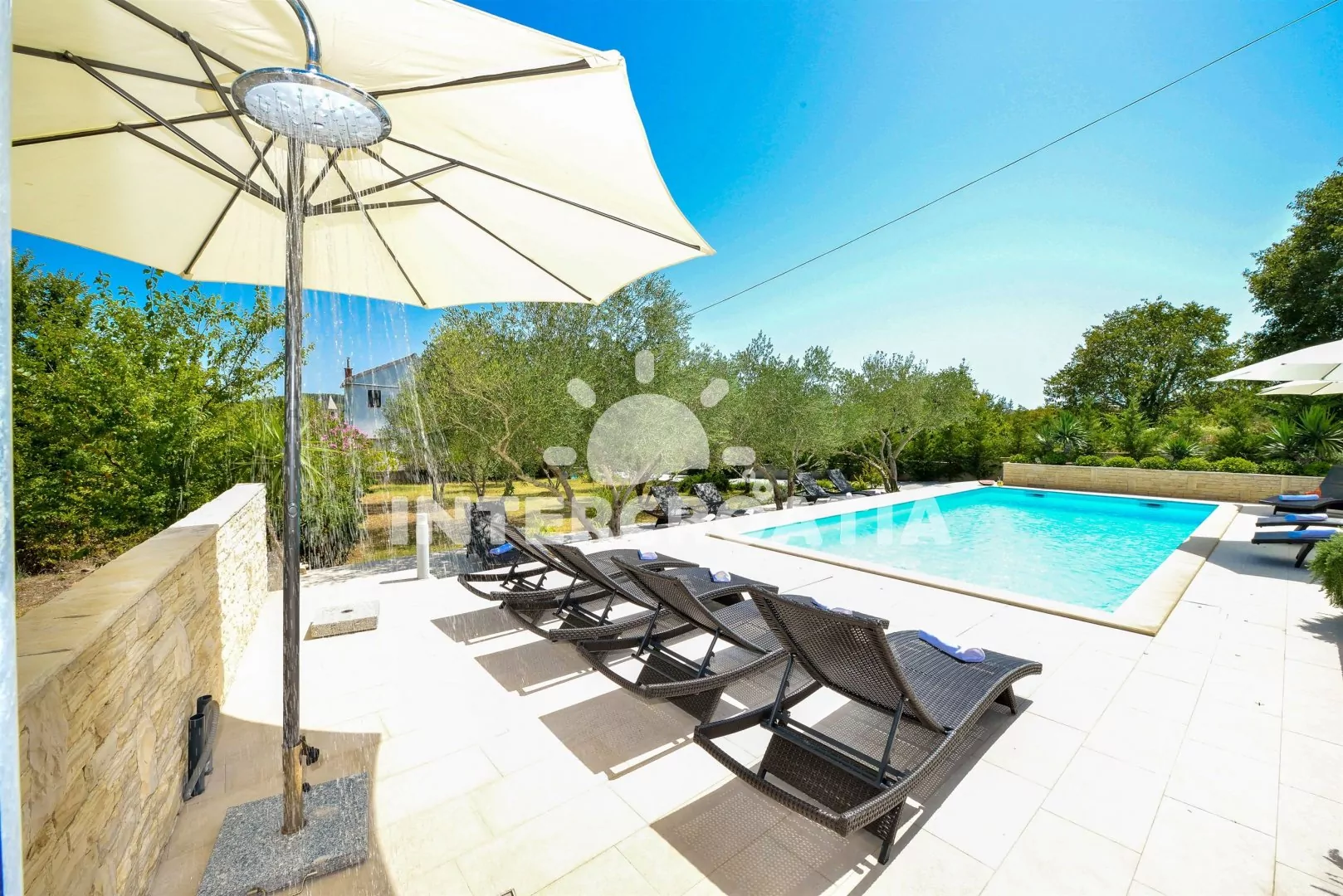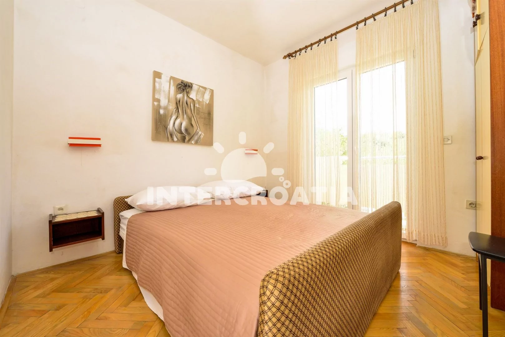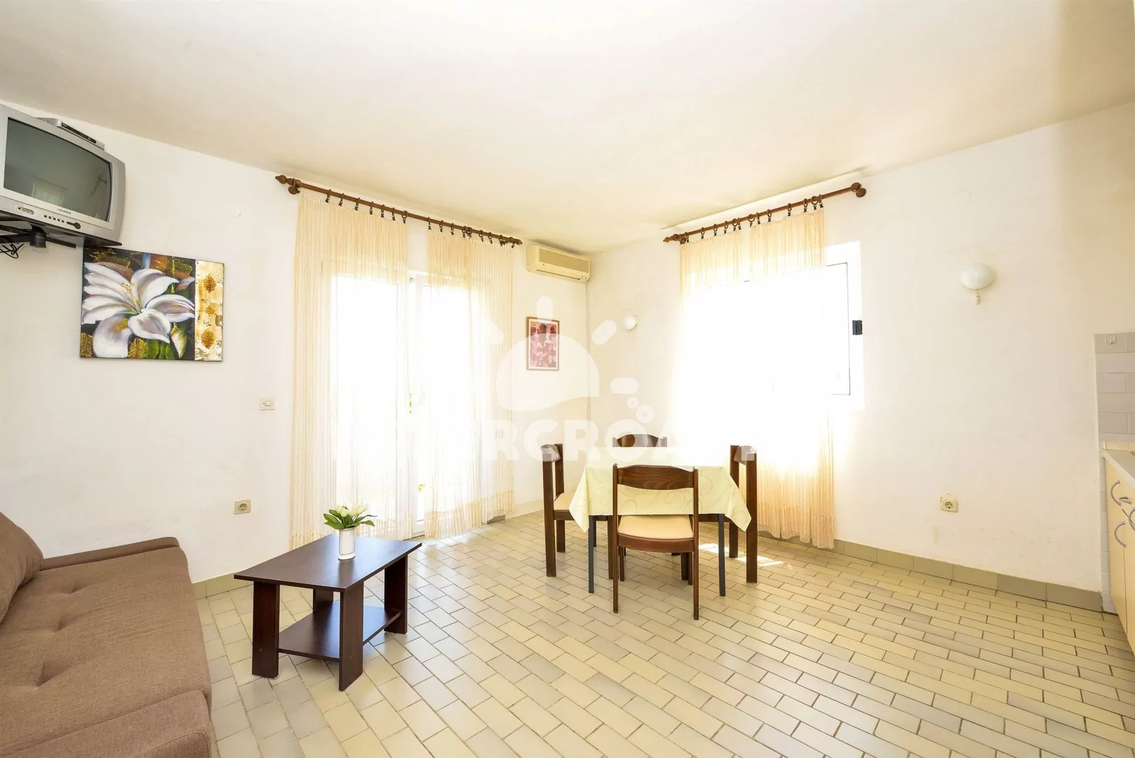 Dvoupokojový apartmán (40 m2) s terasou s posezením a výhledem na bazén i moře, nacházející se v 1. patře domu. Vstup, obývací místnost spojená s kuchyňským koutem. Kuchyňská linka s dvouplotýnkovým elektrickým vařičem, lednicí a nádobím. V obývací místnosti jídelní stůl pro 4 osoby, pohovka (rozložitelná na extra lůžko pro 2 osoby), televize, klimatizace a vstup na balkon. Ložnice s dvoulůžkem. Koupelna se sprchovým koutem, umyvadlem a wc. Hosté mají k dispozici terasu s posezením, v zahradě společný zapuštěný bazén s lehátky a posezení v pergole s grilem. Parkování u objektu zdarma.