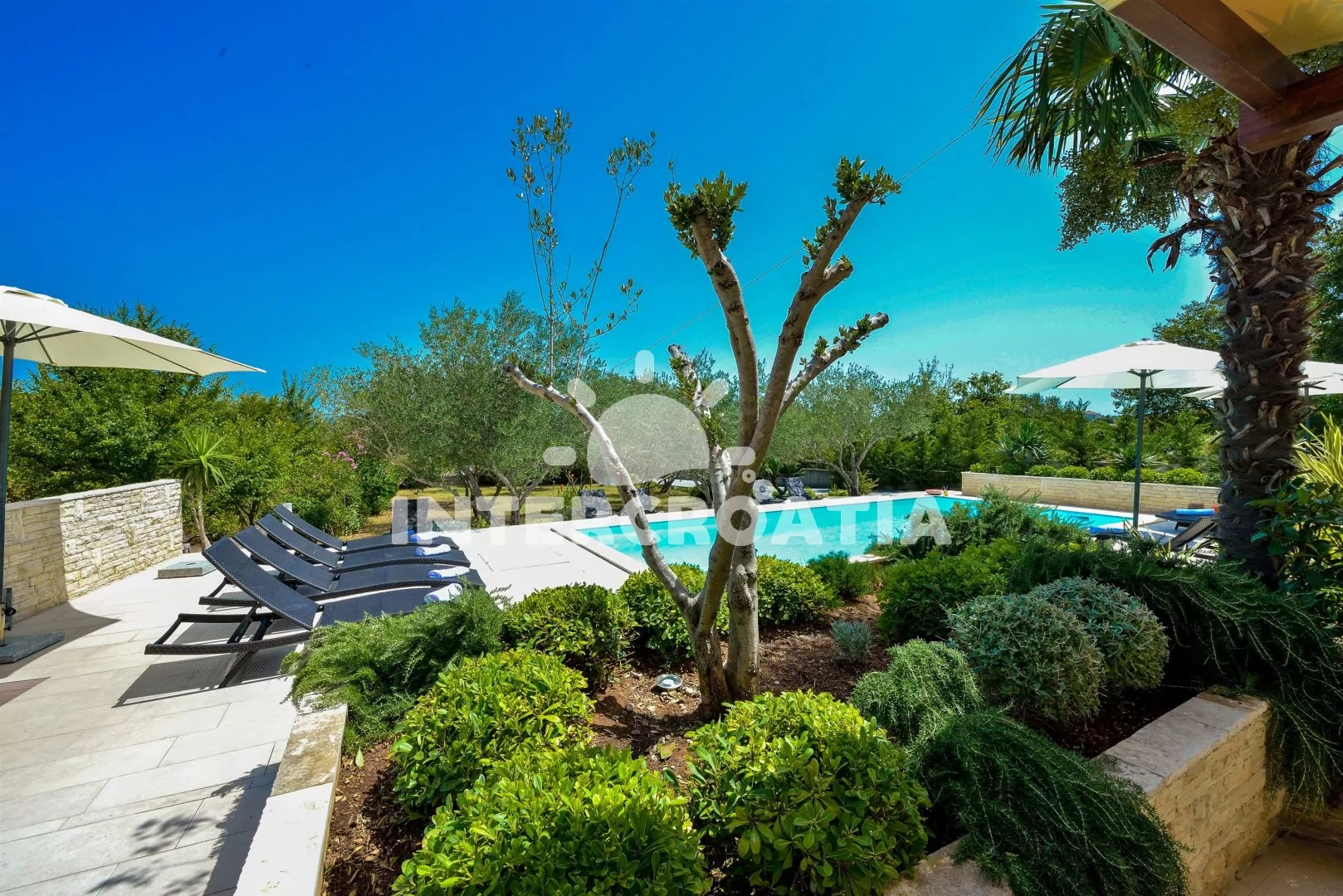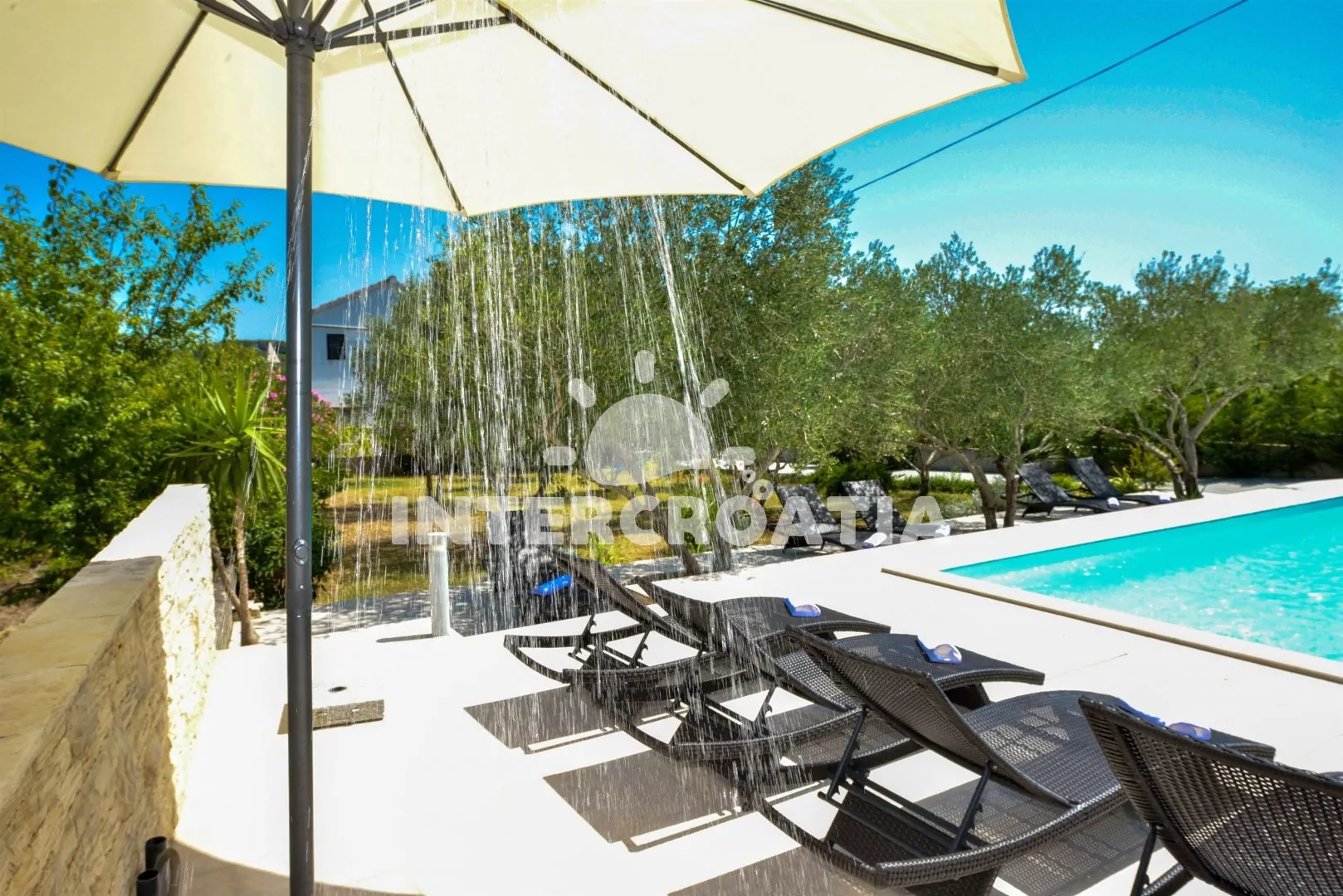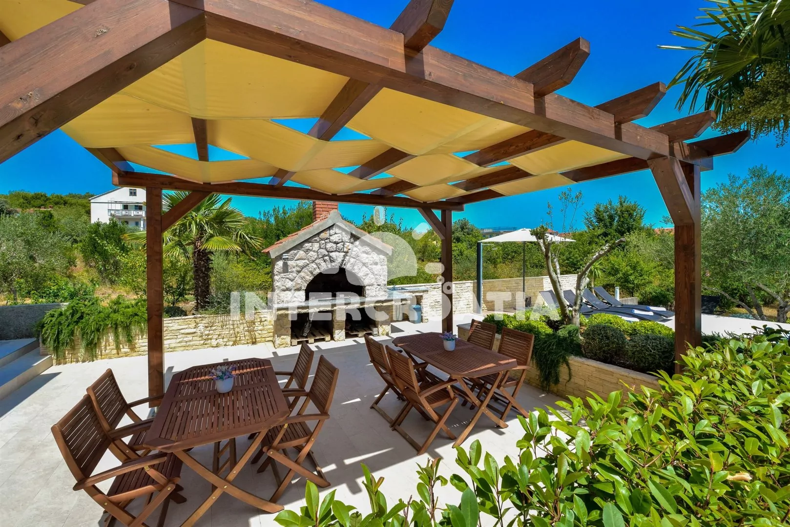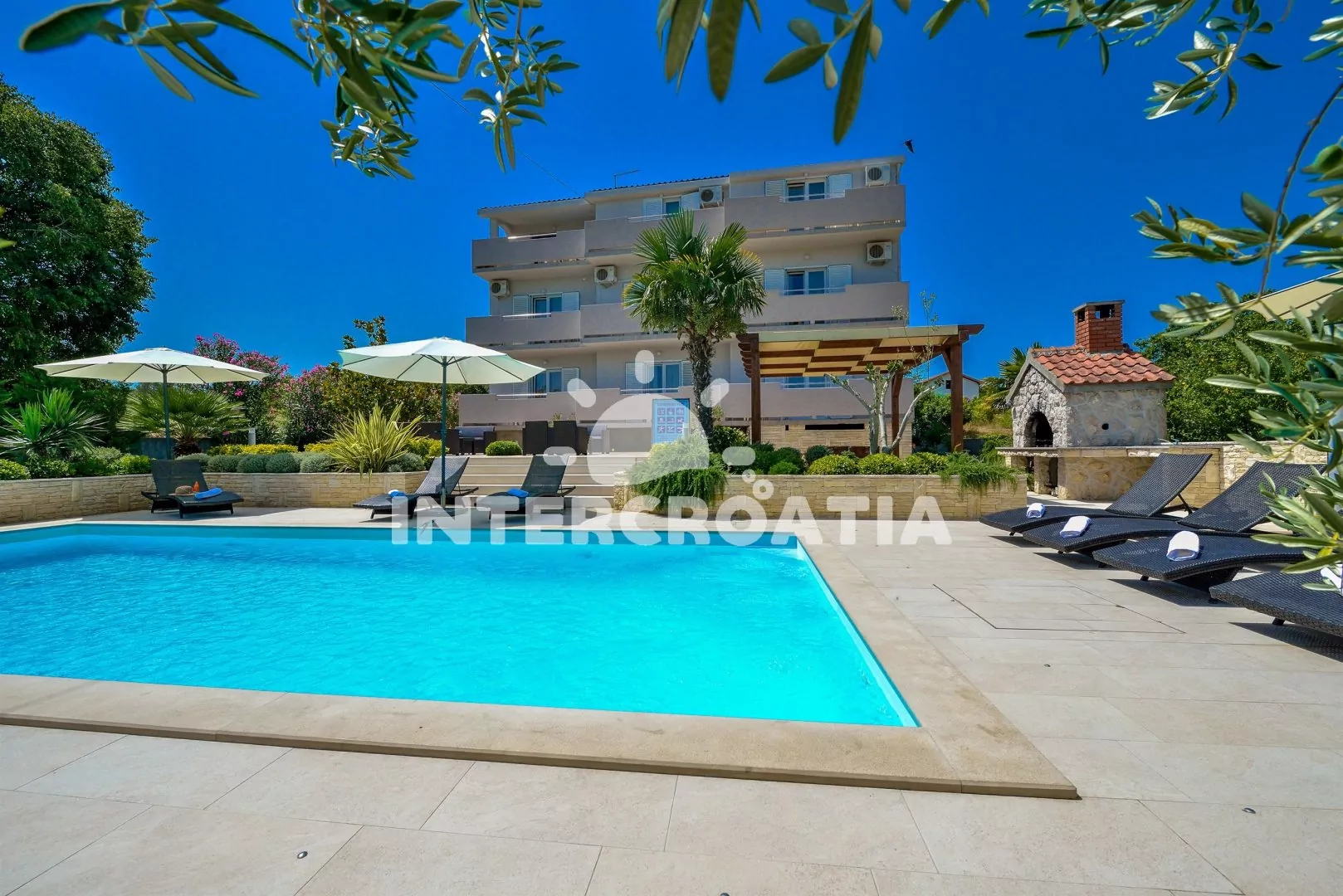 Třípodlažní apartmánová vila v zahradě s terasou, vlastním zapuštěným bazénem s lehátky a dobrou dostupností na pláž. Dále k dispozici terasa s posezením a zděným grilem. Parkovací místa pro automobily u objektu.