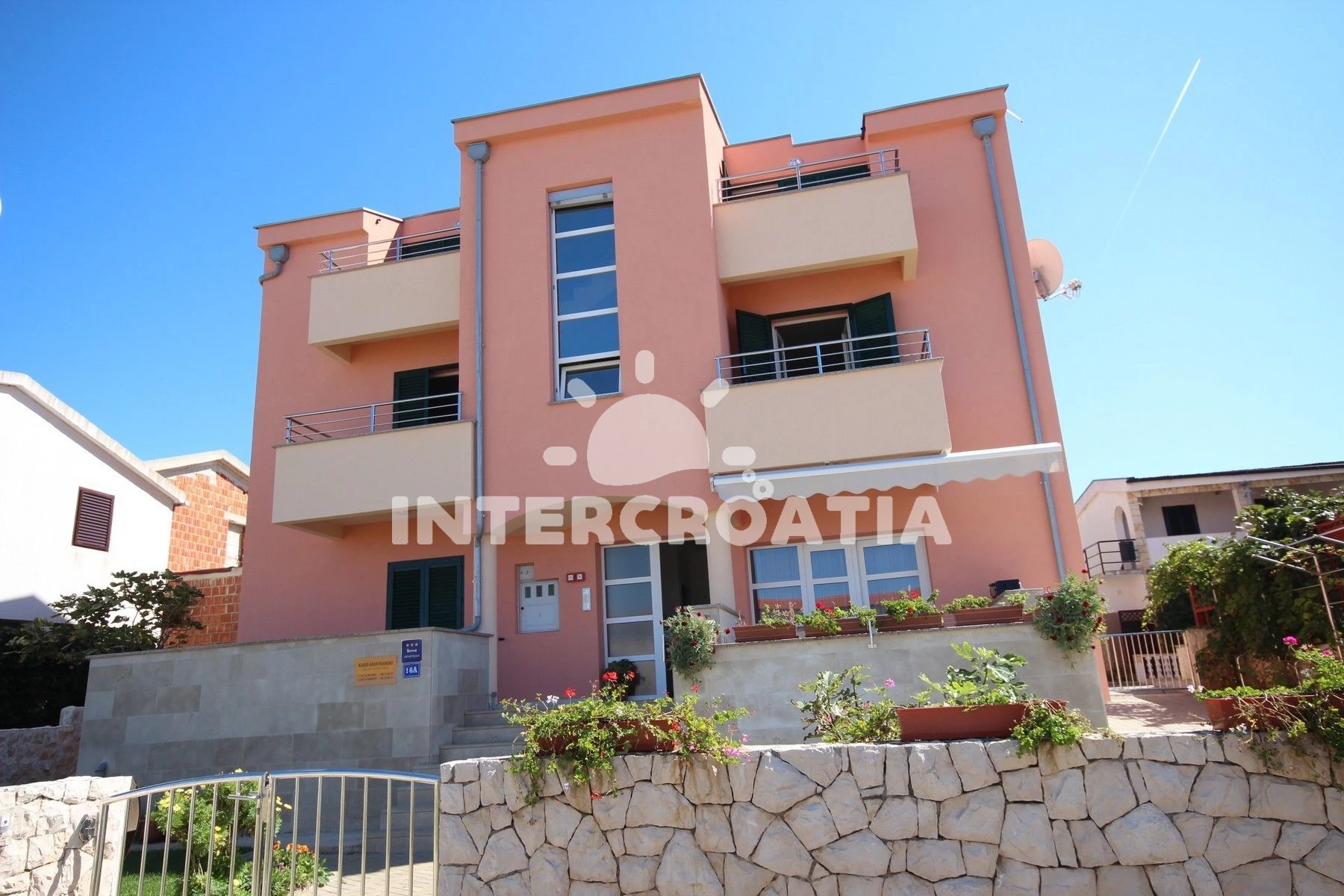 Vzdálenosti: Moře 70 m, pláž 70 m (oblázková a betonové desky), supermarket 200 m, bar 200 m, restaurace 200 m, čerpací stanice 1 km, diskotéka 1 km, potápění 1,5 km, centrum 1,5 km, lékárna 1,5 km, ambulance 1,5 km, směnárna 1,5 km, pošta 1,5 km, banka 7 km, trajekt (Zadar) 30 km, letiště (Zadar) 33 km,