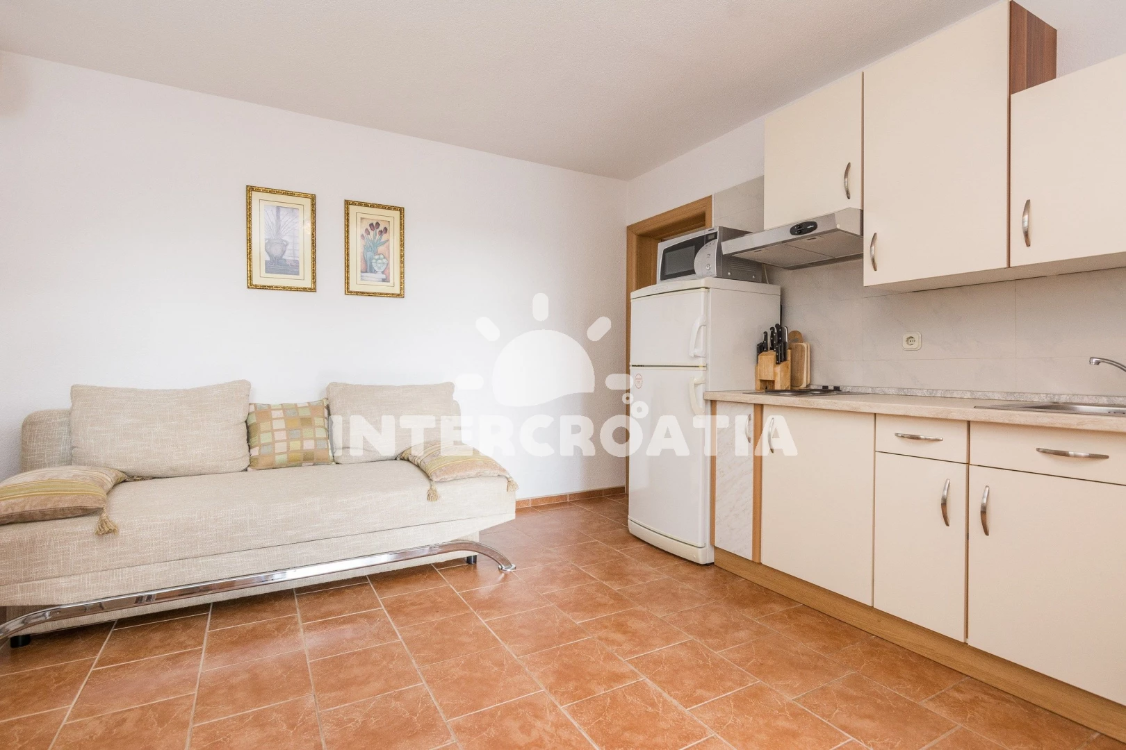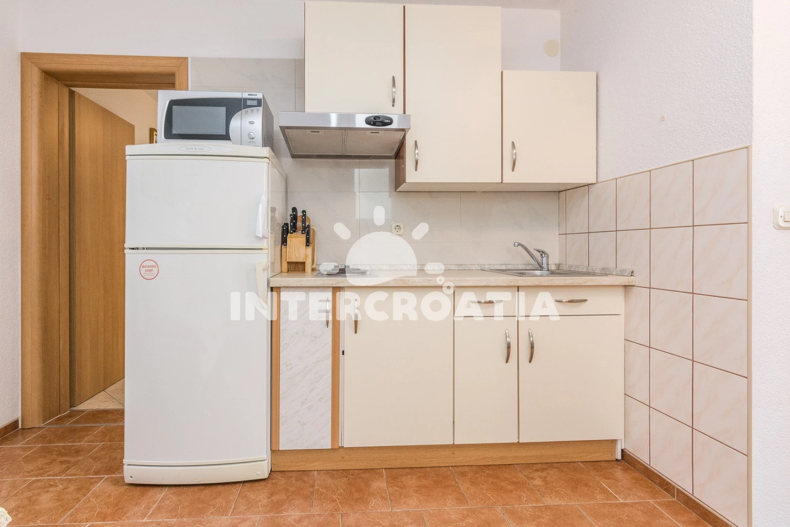 Vzdálenosti: Moře 70 m, pláž 70 m (oblázková a větší kamení), veřejná doprava 200 m, supermarket 300 m, směnárna 700 m, restaurace 700 m, bar 700 m, čerpací stanice 1 km, pošta 2 km, lékárna 2 km, ambulance 2 km, potápění 2 km, centrum 2 km, diskotéka 2 km, banka 7 km, trajekt (Zadar) 30 km, letiště (Zadar) 33 km,