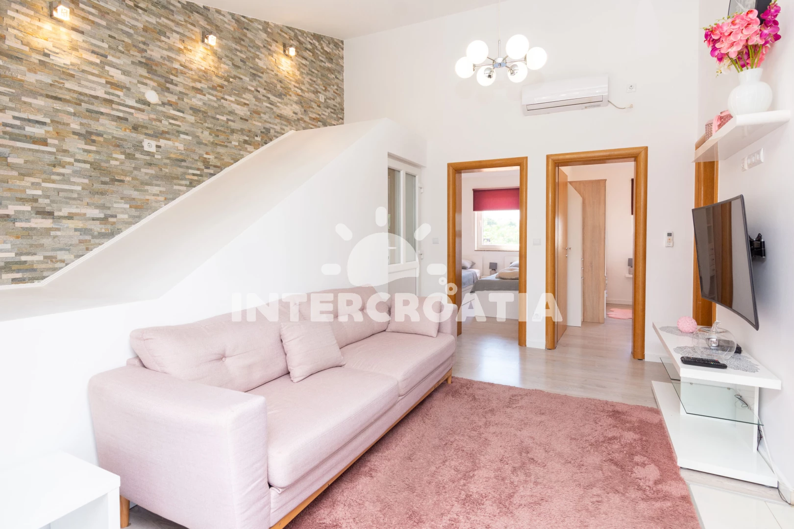 Apartmán se nachází 500 m od moře a pláže. Pláž je skalnatá, oblázková, větší kamení a betonové desky. U objektu je k dispozici společná zahrada s posezením a grilem. Parkování je před domem.