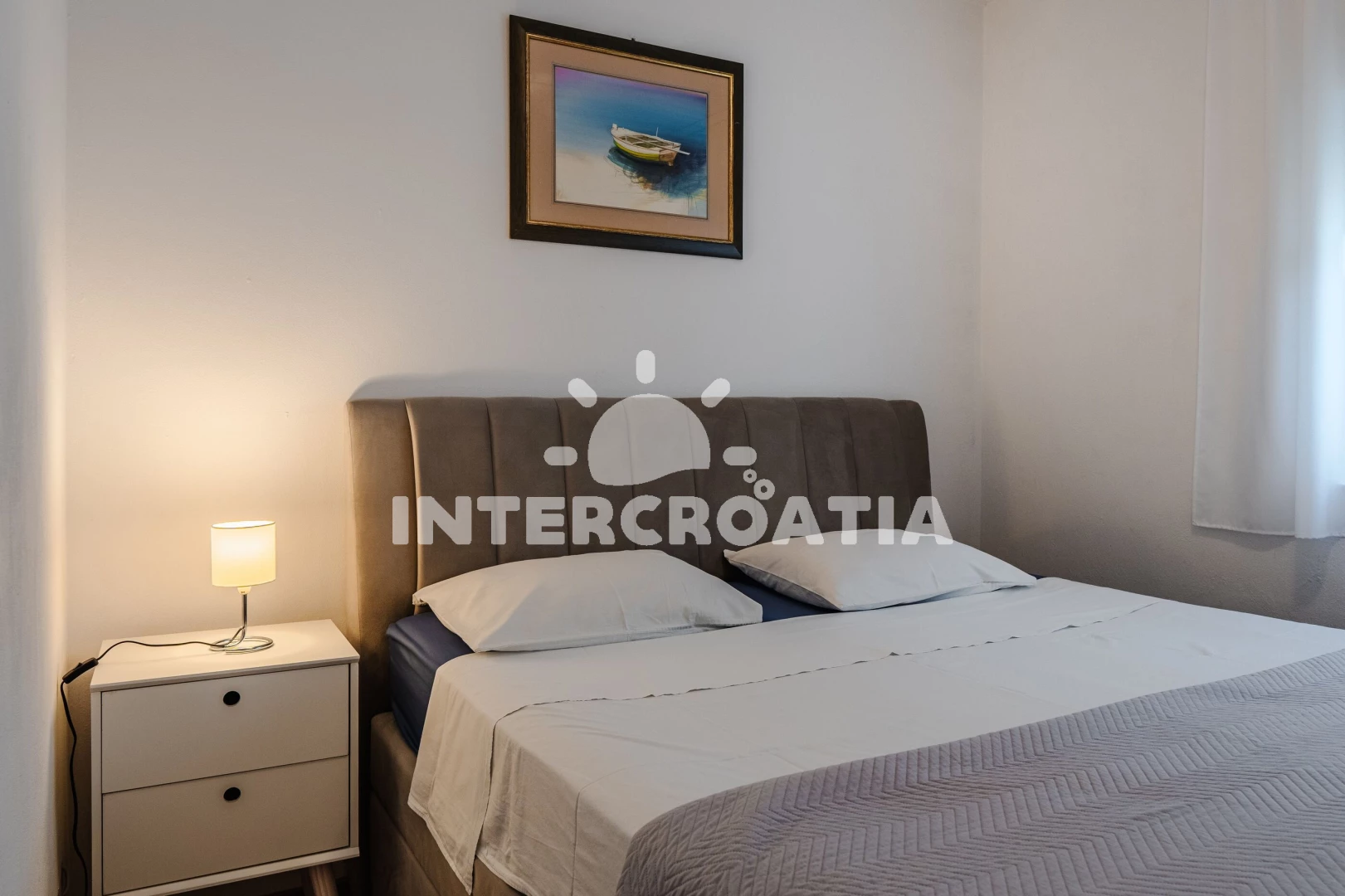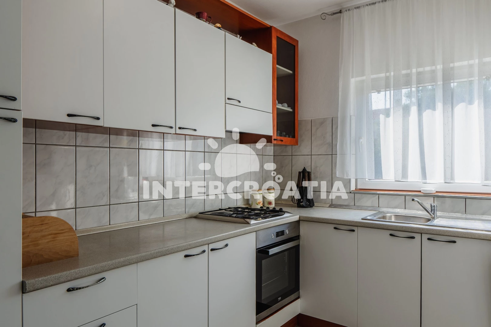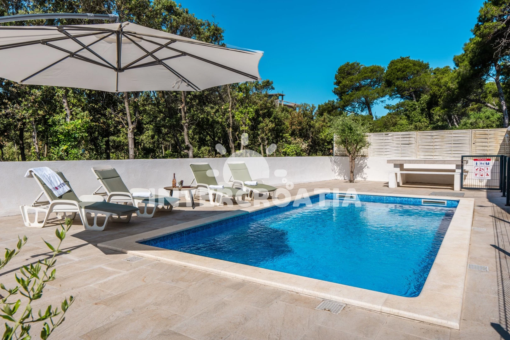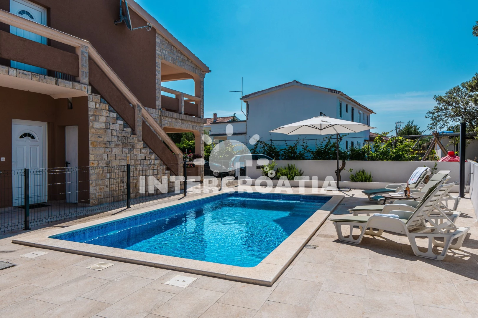 Apartmán se nachází 400 m od moře a pláže. Pláž je kamenné a betonové desky. Apartmán disponuje bazénem s lehátky pro ubytované hosty. U objektu je k dispozici společná zahrada s posezením a grilem. Parkování je před domem.