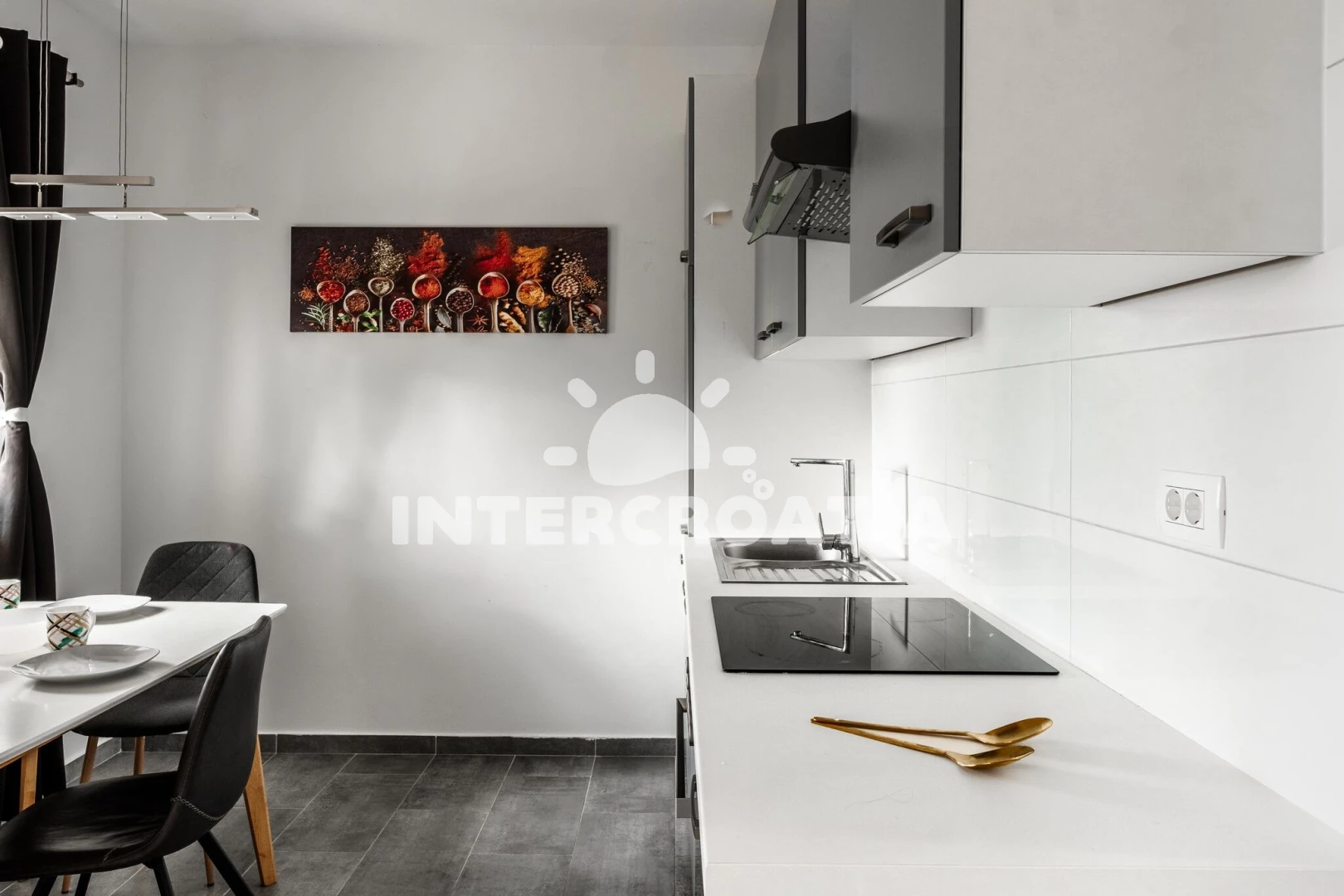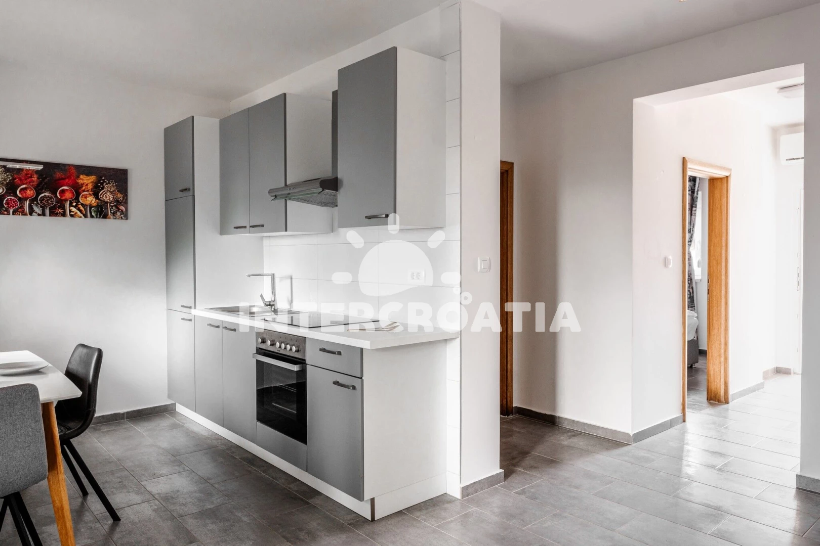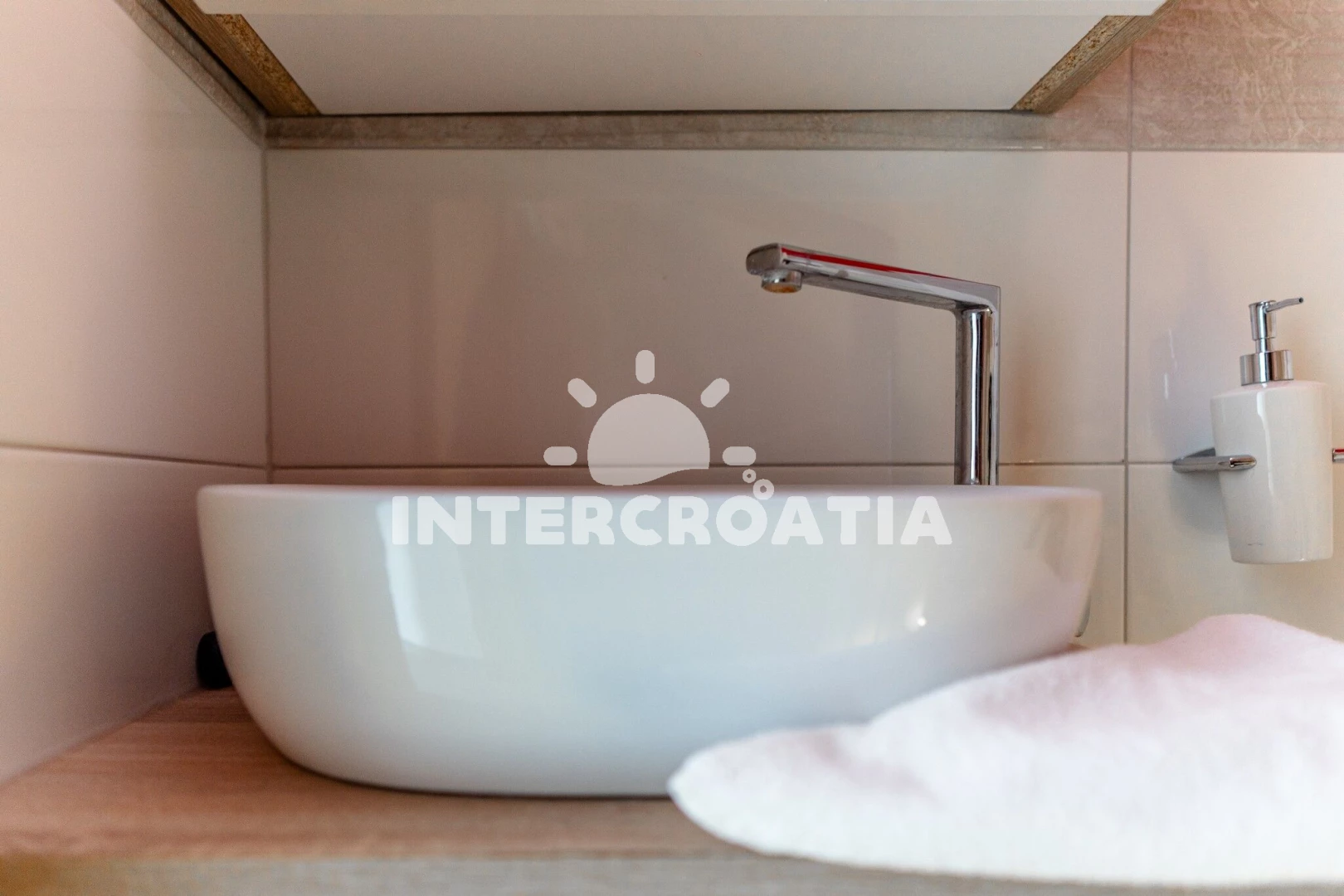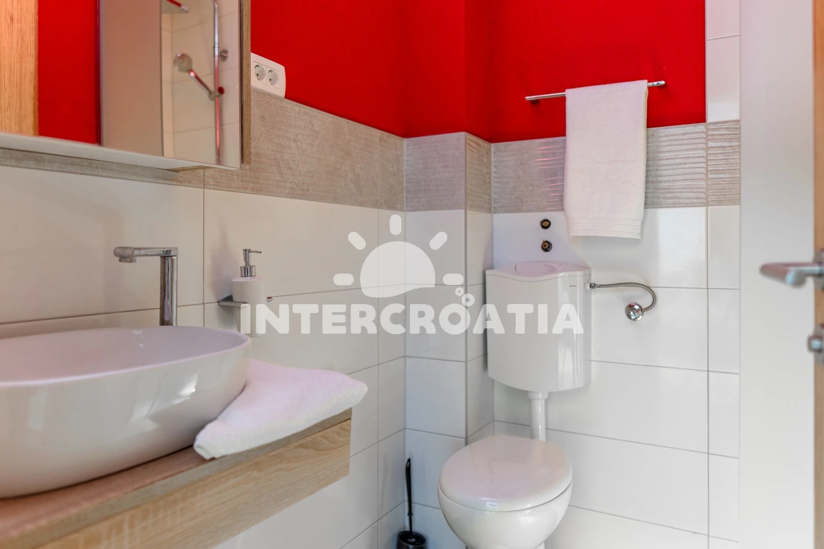 Apartmán se nachází 10 m od moře a pláže. Pláž je kamenné a betonové desky. K dispozici vířivka. U objektu je k dispozici společná zahrada s posezením a grilem. Parkování je před domem.