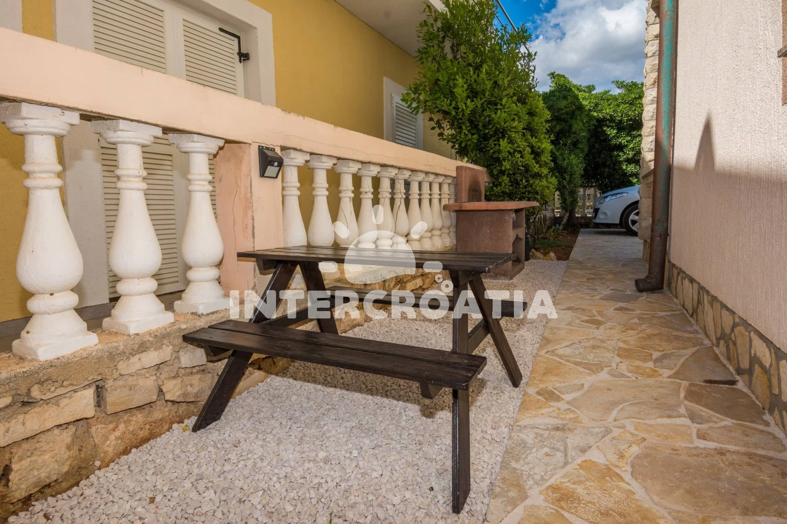 Apartmán se nachází 250 m od moře a pláže. Pláž je oblázková a betonové desky. U objektu je k dispozici společná zahrada s posezením a grilem. Parkování je před domem.