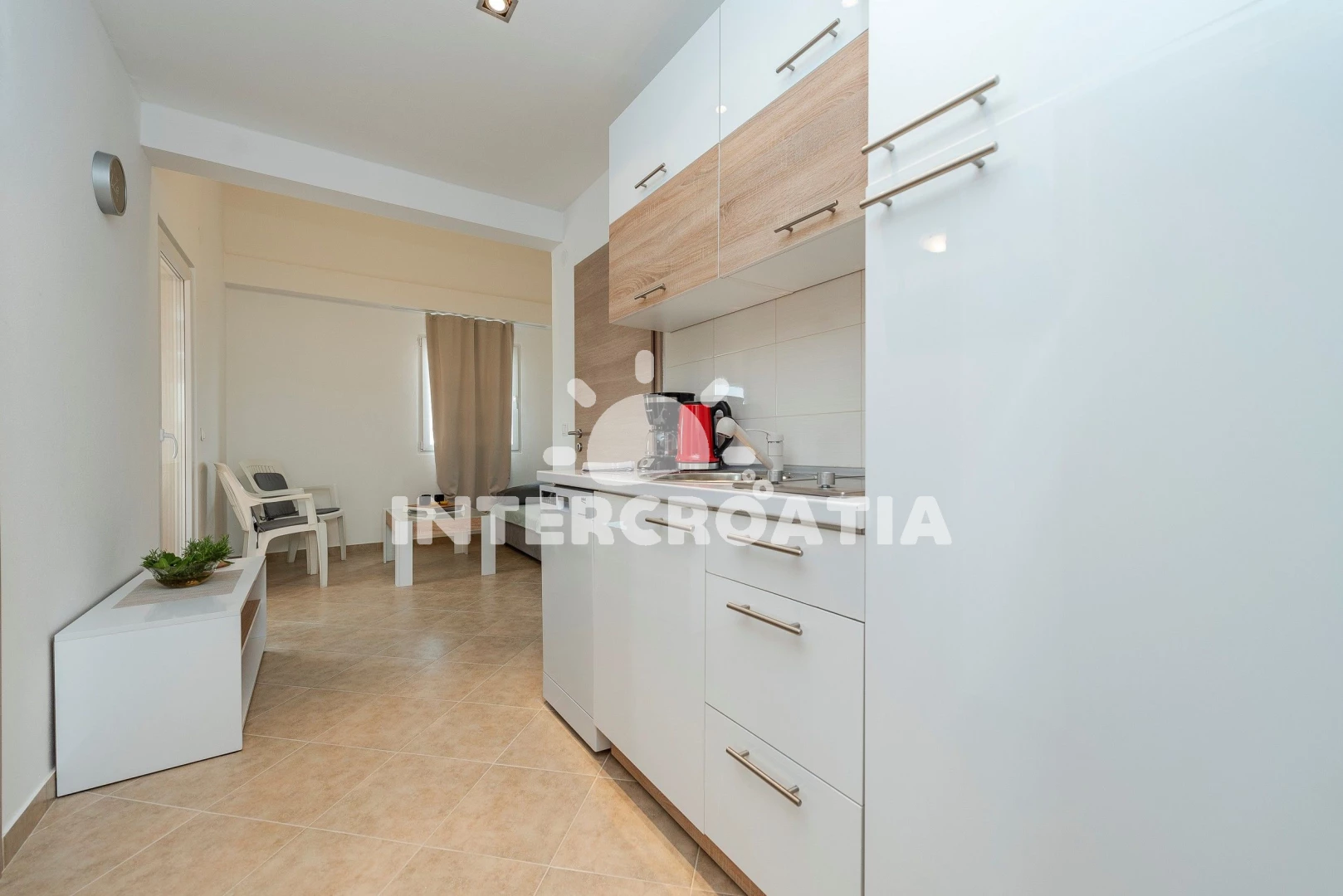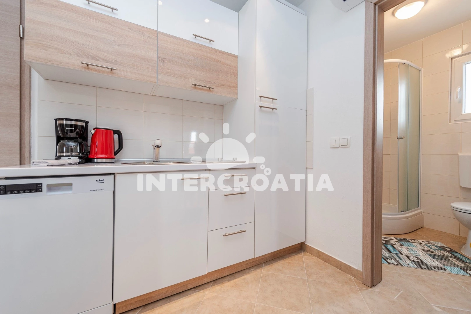 Apartmán se nachází 100 m od moře a pláže. Pláž je oblázková a betonové desky. U objektu je k dispozici společná zahrada s posezením a grilem. Parkování je před domem.
