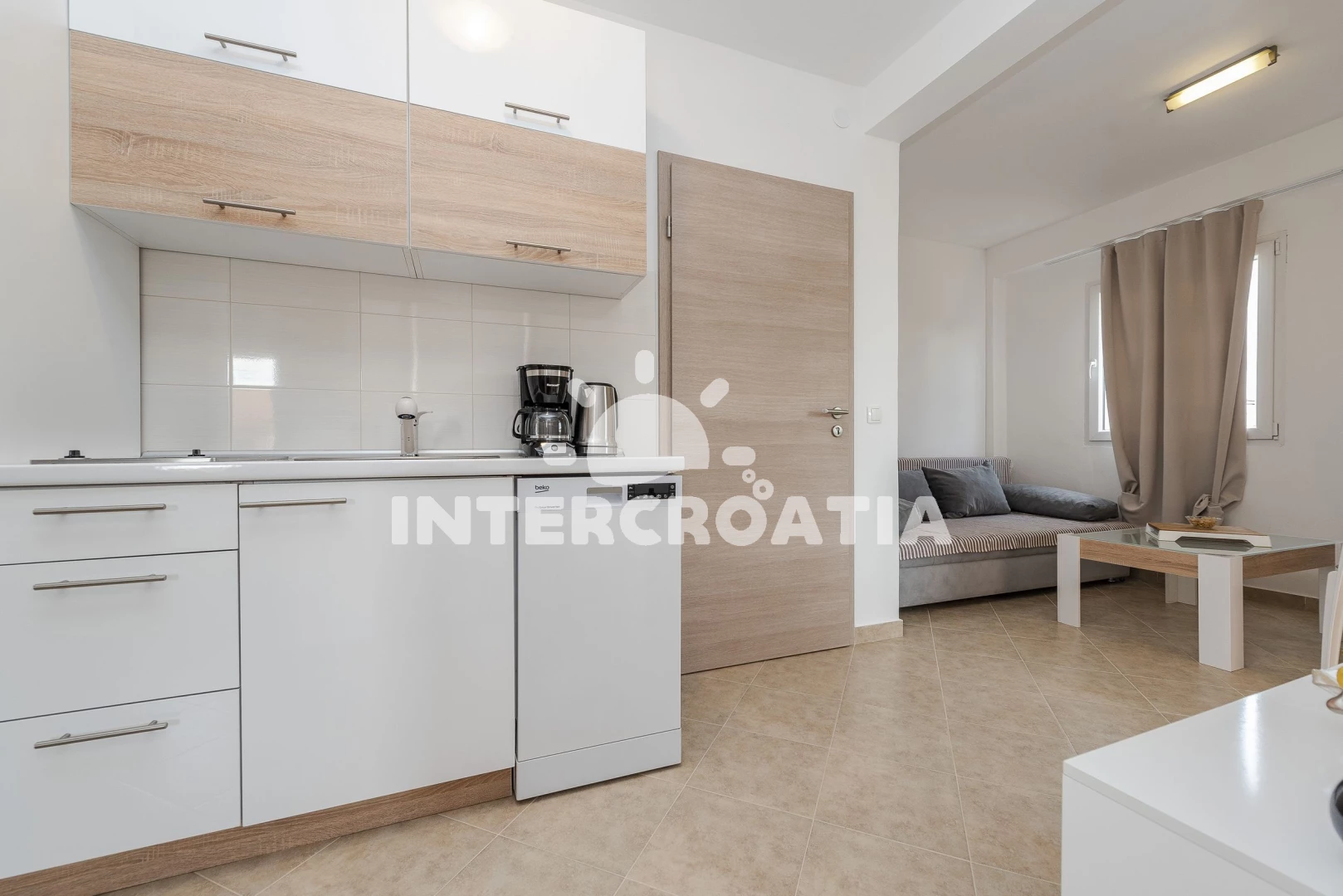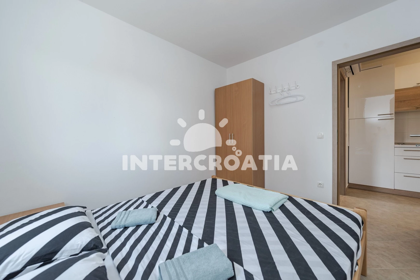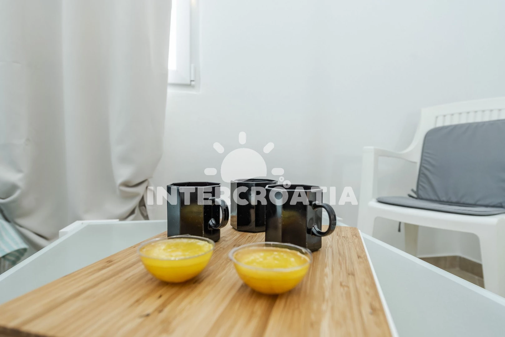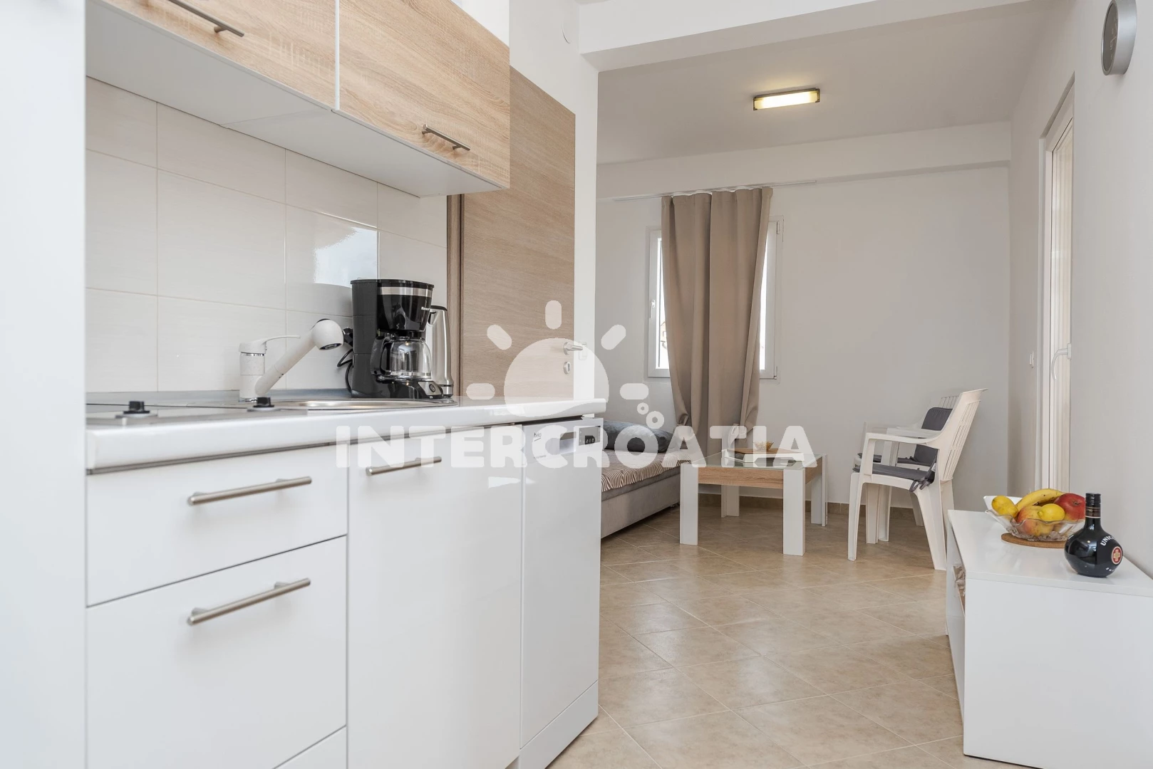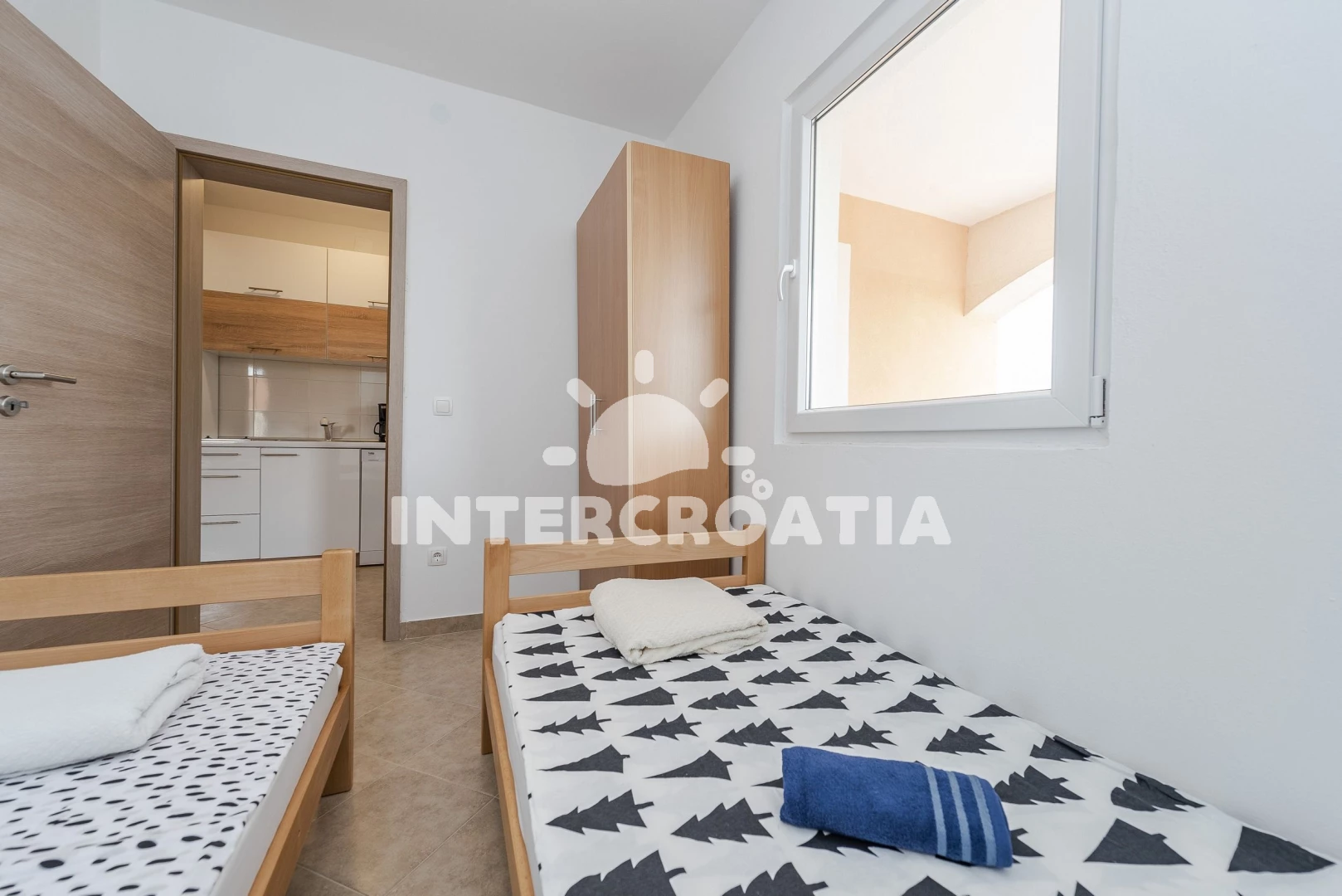 Apartmán se nachází 100 m od moře a pláže. Pláž je oblázková a betonové desky. U objektu je k dispozici společná zahrada s posezením a grilem. Parkování je před domem.