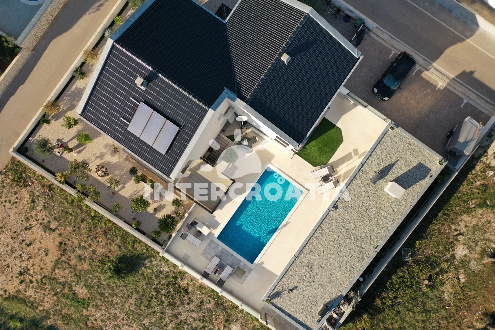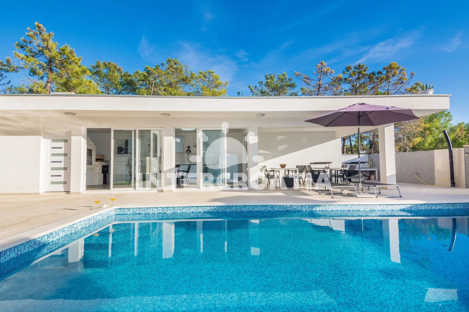 Apartmán se nachází 200 m od moře a pláže. Pláž je oblázková a betonové desky. Apartmán disponuje bazénem s lehátky pro ubytované hosty. U objektu je k dispozici společná zahrada s posezením a grilem. Parkování je před domem.