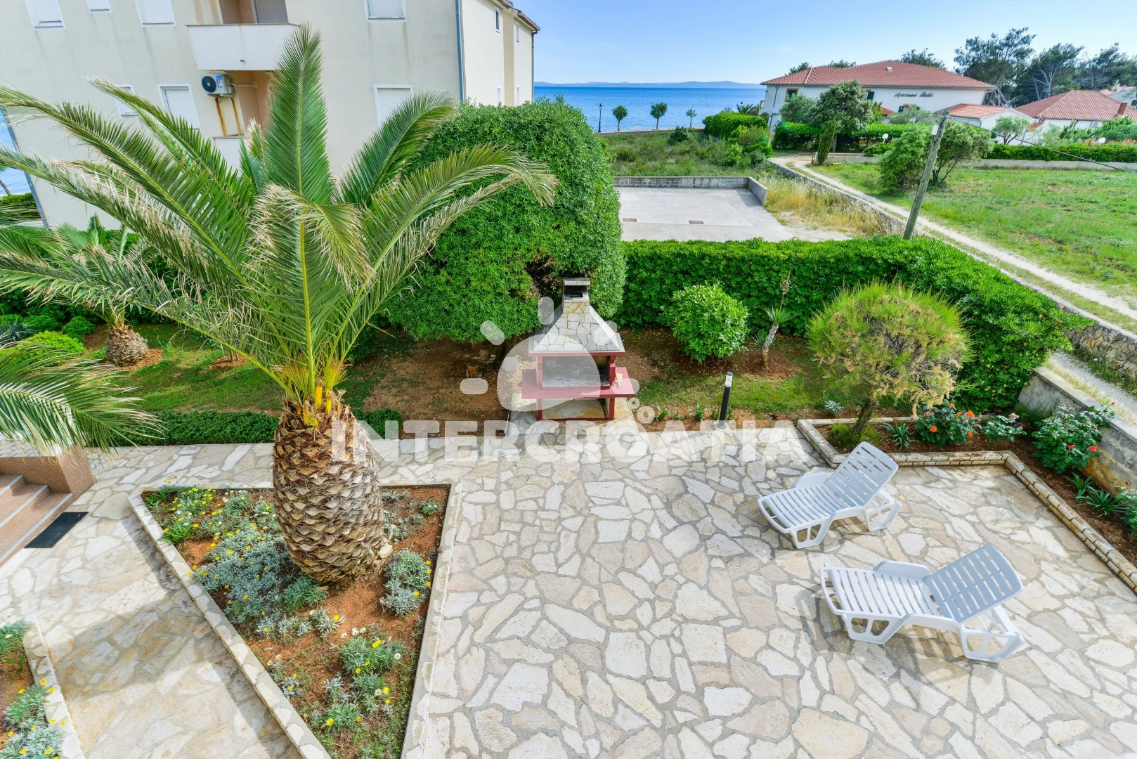 Apartmán se nachází 20 m od moře a pláže. Pláž je oblázková a betonové desky. U objektu je k dispozici společná zahrada s posezením a grilem. Parkování je před domem.