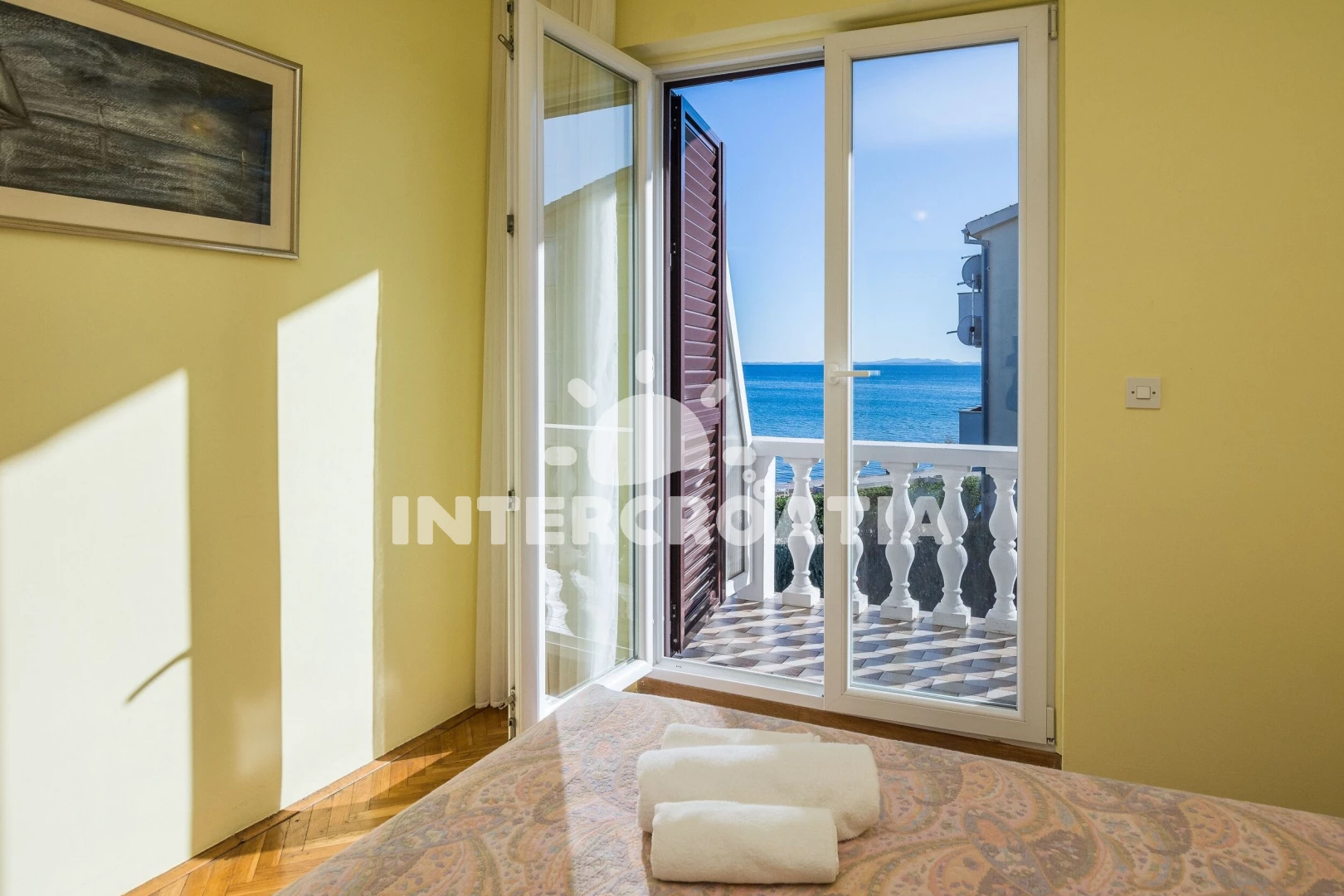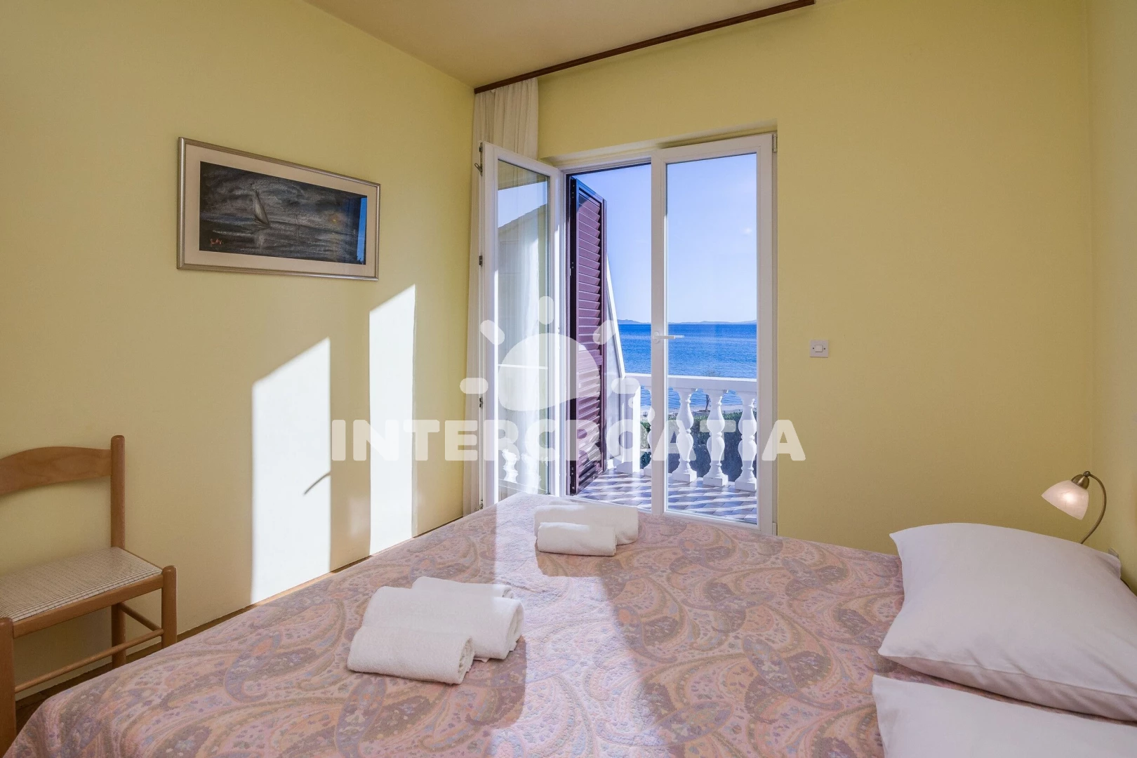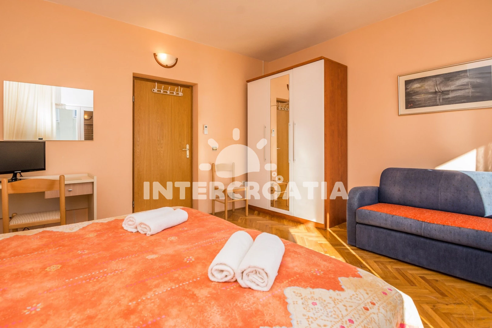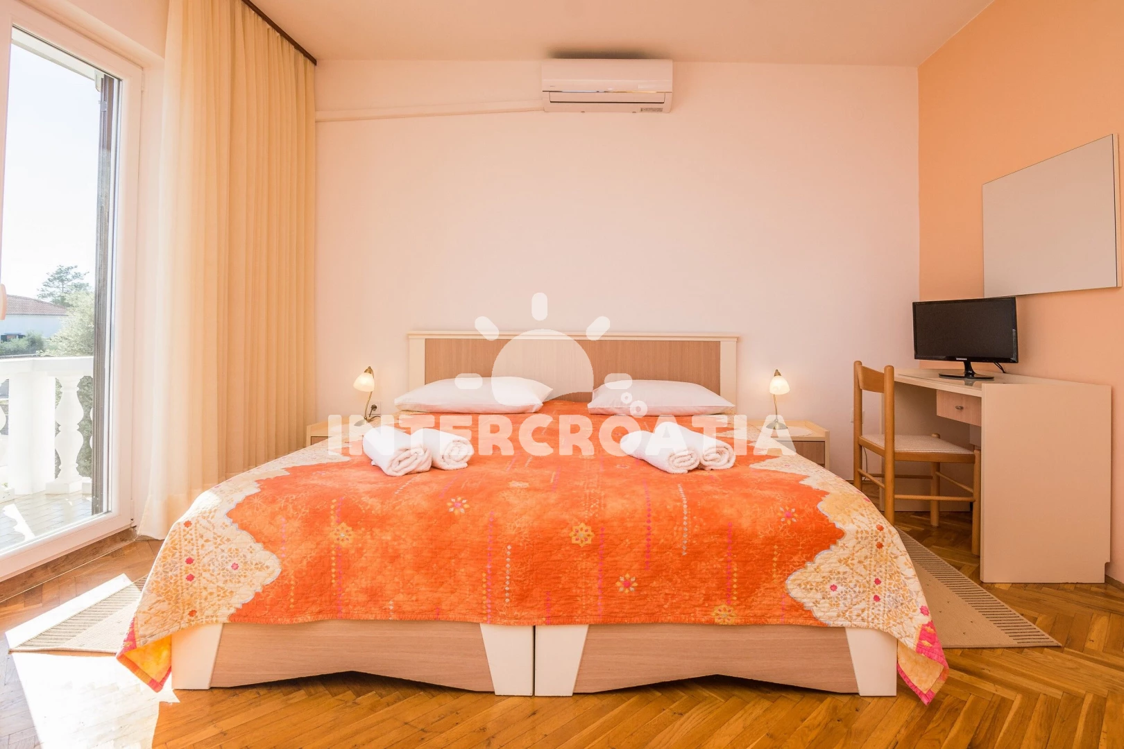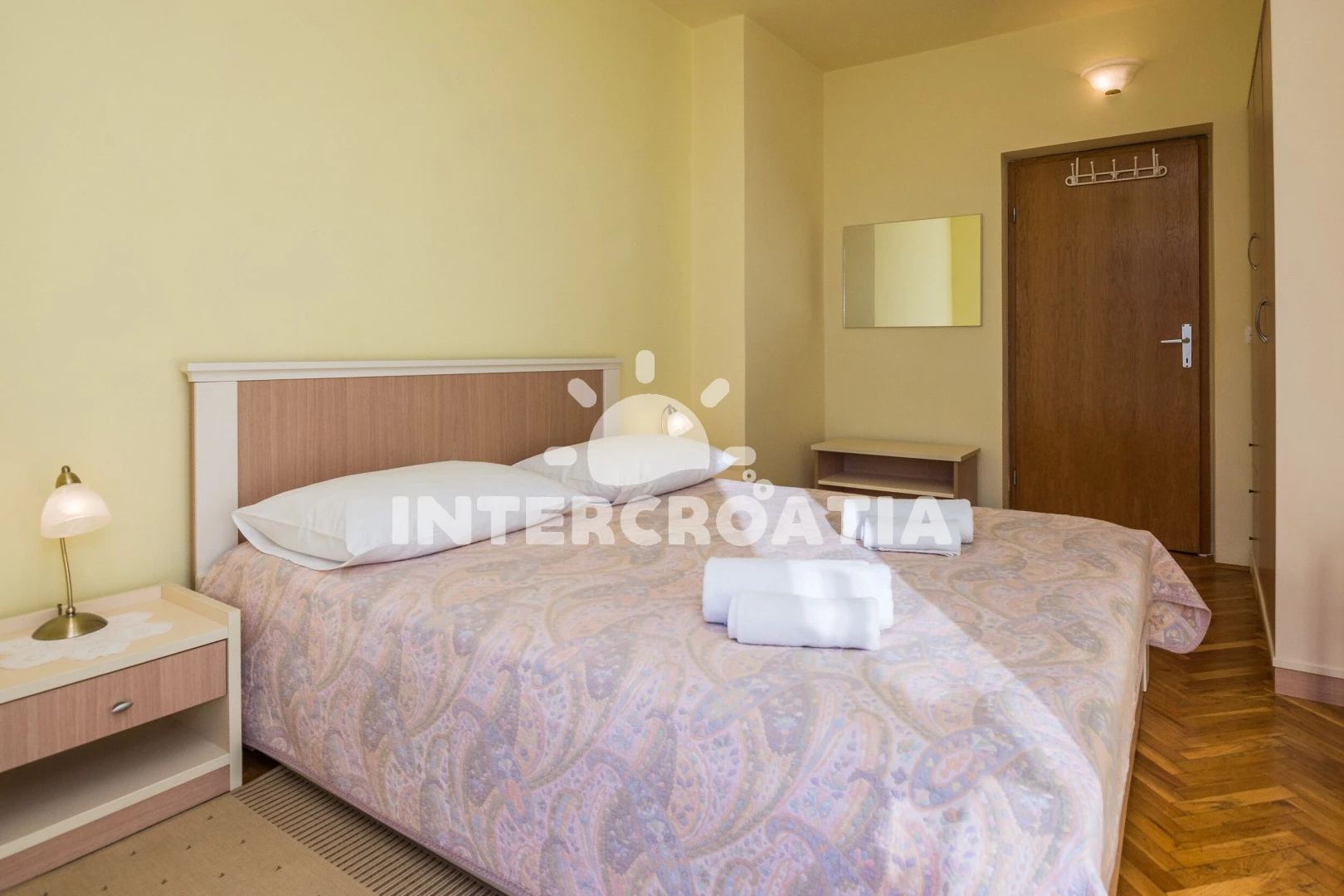 Apartmán (75 m2) s balkonem, a výhledem na moře. Nachází se v 1. patře objektu. Apartmán má 2 ložnice a je vhodný pro až 4 osoby. Kuchyňská linka je vybavena varnou deskou, troubou, toustovačem, kávovarem, myčkou na nádobí, mikrovlnnou troubou, rychlovarnou konvicí, nádobím, lednicí, mrazákem. K dispozici televize se satelitním programem, žehlička. První ložnice s dvoulůžkem. Druhá ložnice s dvoulůžkem. Koupelna se sprchovým koutem, umyvadlem, fénem a WC.