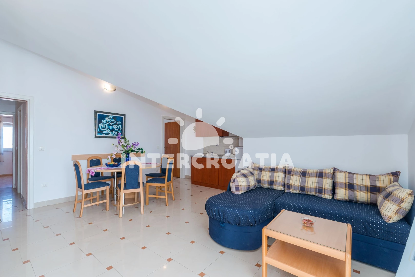 Apartmán se nachází 70 m od moře a pláže. Pláž je oblázková a betonové desky. U objektu je k dispozici společná zahrada s posezením a grilem. Parkování je před domem.
