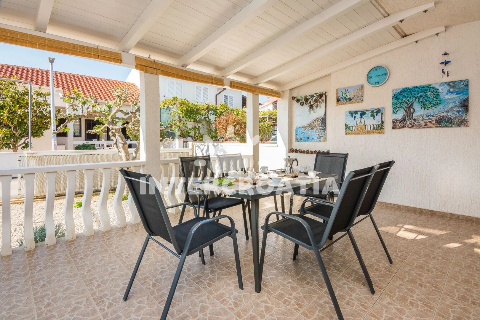 Apartmán se nachází 80 m od moře a pláže. Pláž je oblázková a betonové desky. U objektu je k dispozici společná zahrada s posezením a grilem. Parkování je před domem.
