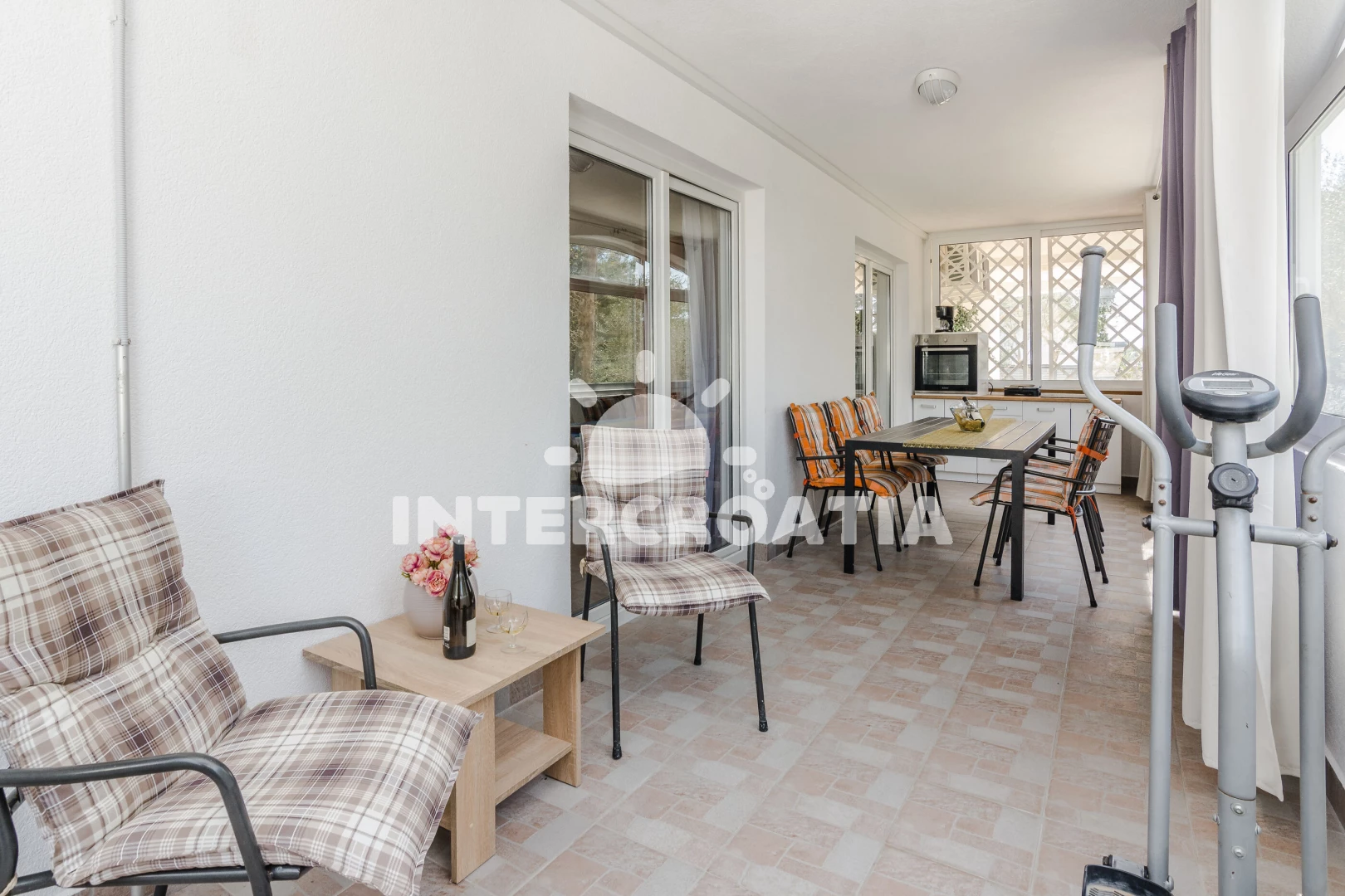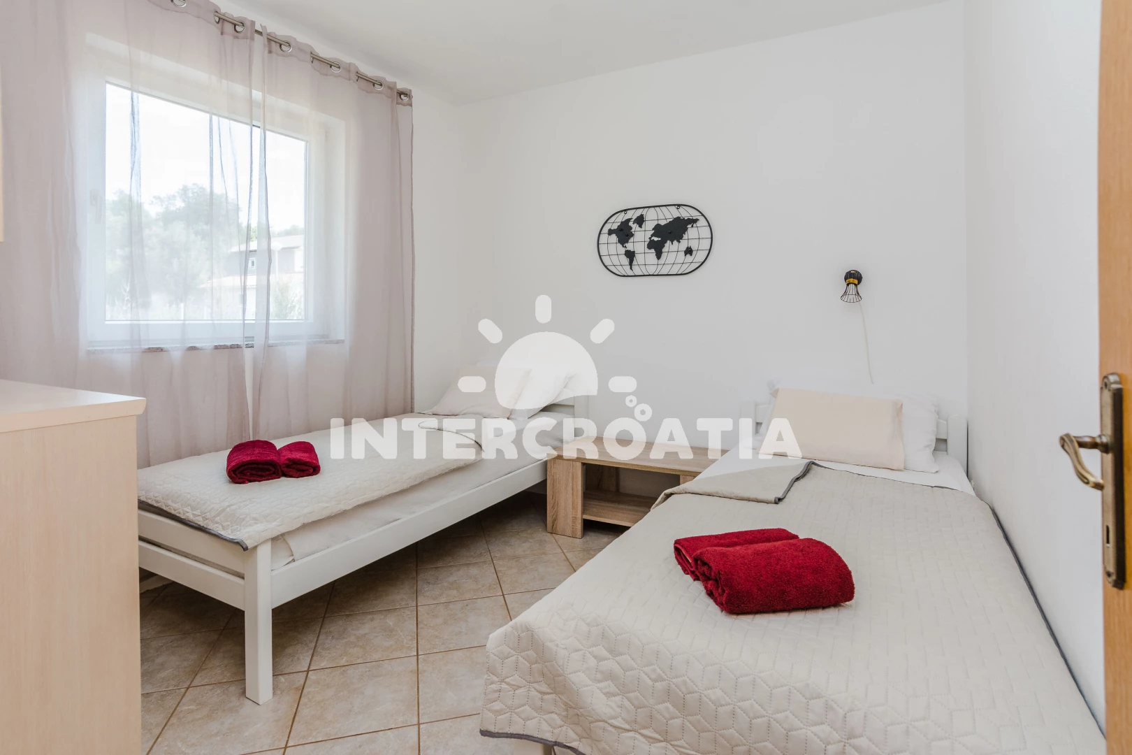 Vzdálenosti: Moře 400 m, pláž 400 m (oblázková a betonové desky), supermarket 300 m, restaurace 400 m, bar 400 m, centrum 1 km, potápění 1 km, diskotéka 1 km, pošta 1 km, čerpací stanice 1 km, směnárna 1 km, ambulance 1 km, lékárna 1 km, půjčovna kol 2 km, muzeum 11 km, trajekt (Zadar) 30 km, letiště (Zadar) 35 km, park Plitvice 150 km,
