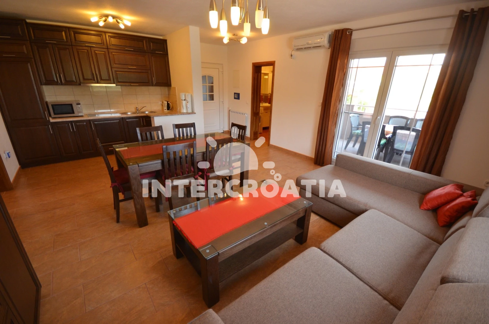 Apartmán (80 m2) s balkonem. Nachází se v 1. patře objektu. Apartmán má 2 ložnice a je vhodný pro až 4 osoby. Kuchyňská linka je vybavena varnou deskou, kávovarem, toustovačem, mikrovlnnou troubou, rychlovarnou konvicí, nádobím, lednicí, mrazákem. V obývací místnosti je rozložitelná pohovka (extra lůžko pro osoby). K dispozici televize se satelitním programem, žehlička. První ložnice s dvoulůžkem. Druhá ložnice s dvoulůžkem. Koupelna se sprchovým koutem, umyvadlem, fénem a WC.