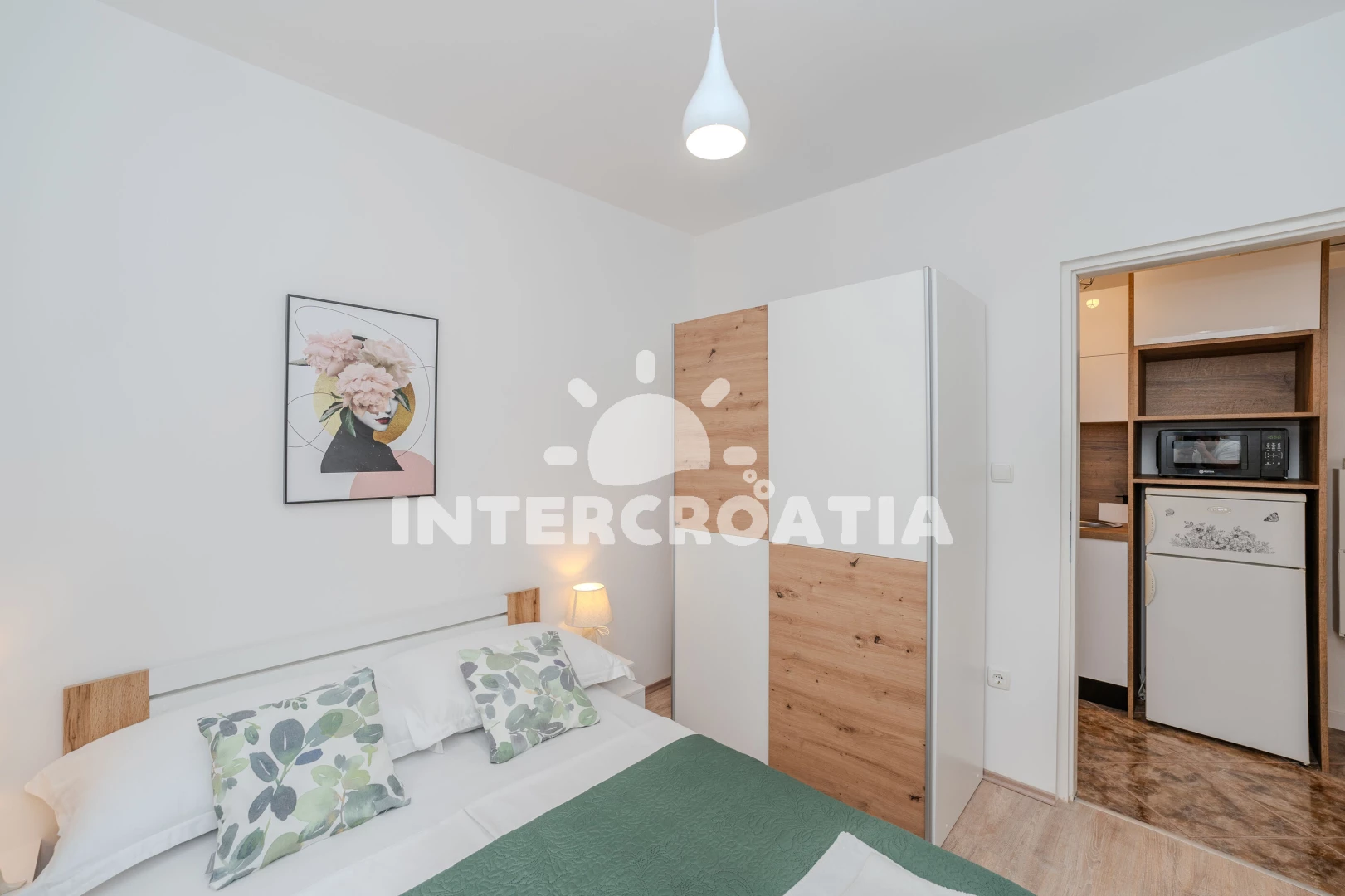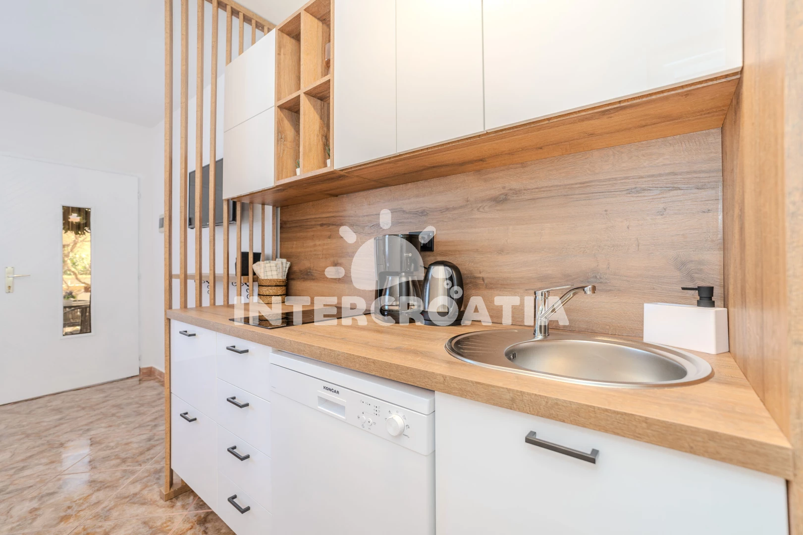 Apartmán se nachází 150 m od moře a pláže. Pláž je oblázková a betonové desky. U objektu je k dispozici společná zahrada s posezením a grilem. Parkování je před domem.