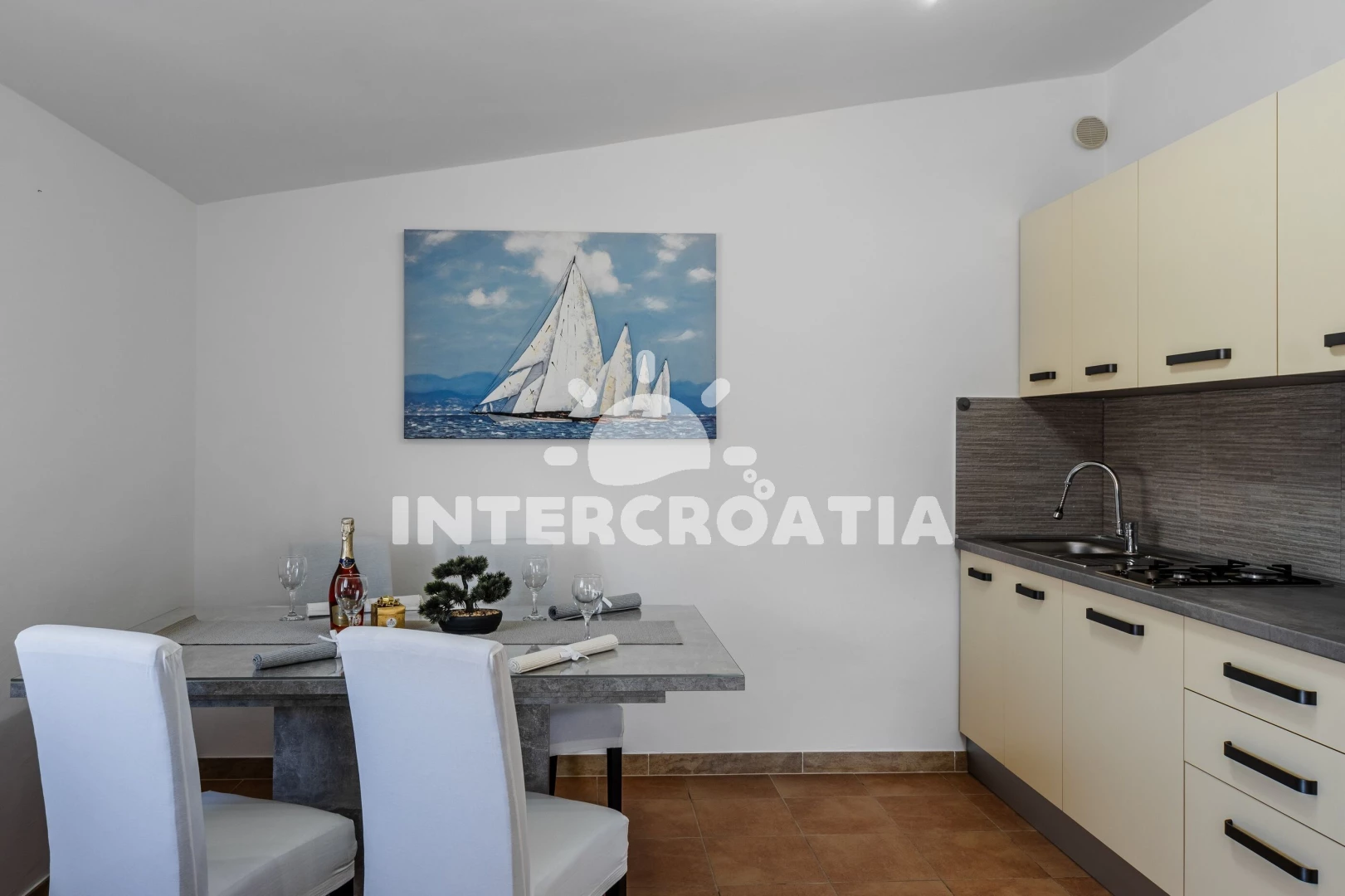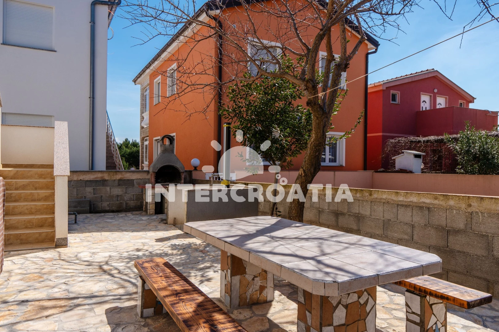 Apartmán se nachází 200 m od moře a pláže. Pláž je oblázková a betonové desky. U objektu je k dispozici společná zahrada s posezením a grilem. Parkování je před domem.