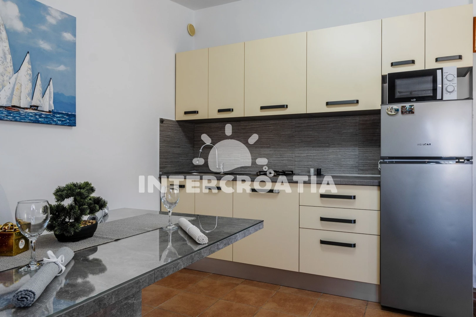 Vzdálenosti: Moře 200 m, pláž 200 m (oblázková a betonové desky), supermarket 950 m, restaurace 1 km, bar 1 km, čerpací stanice 3 km, diskotéka 3,5 km, pošta 3,5 km, potápění 3,5 km, centrum 3,5 km, směnárna 3,5 km, ambulance 3,5 km, lékárna 3,5 km, veřejná doprava 3,5 km, půjčovna kol 3,5 km, marina 30 km, banka 30 km, trajekt (Zadar) 30 km, letiště (Zadar) 35 km,