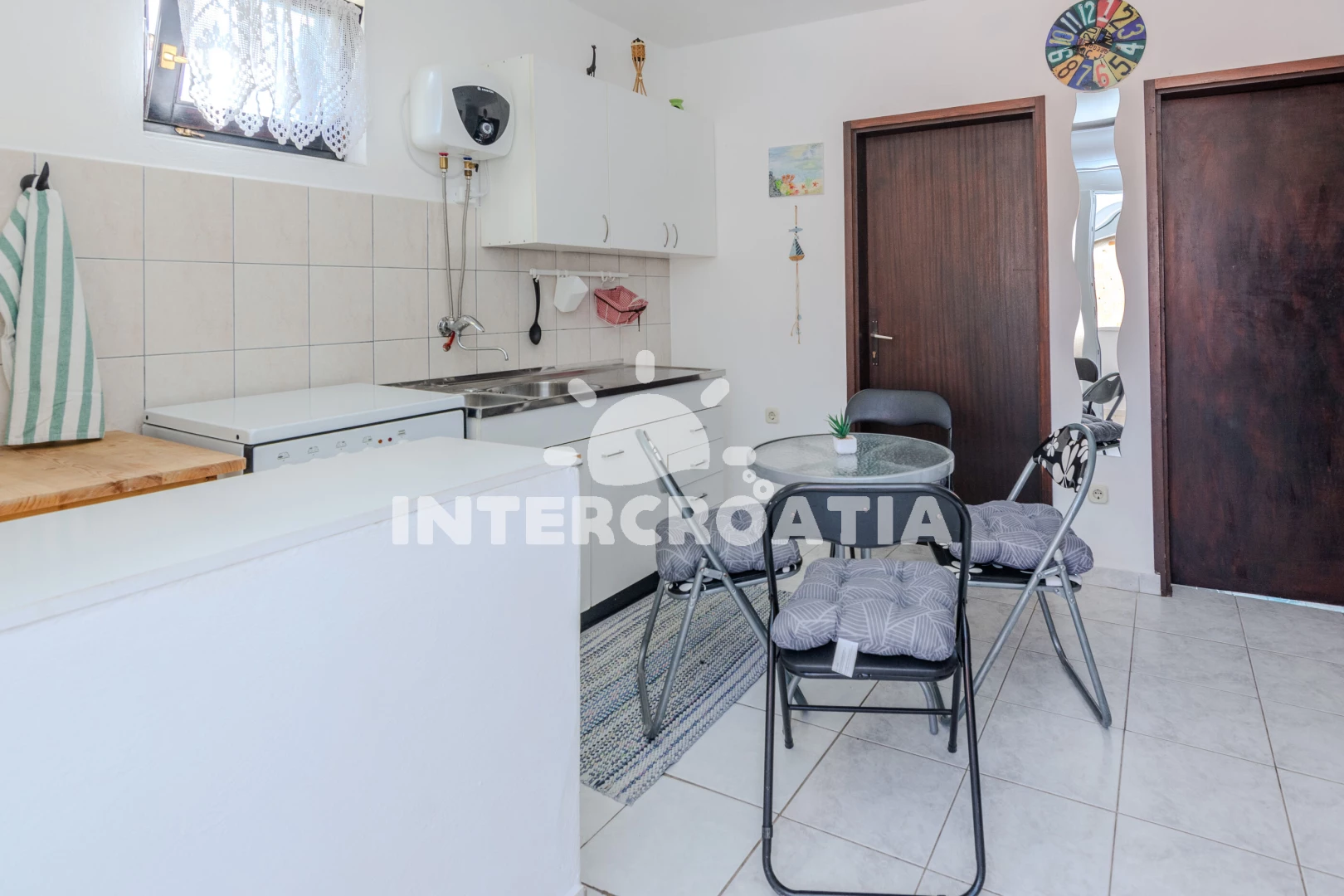 Apartmán se nachází 450 m od moře a pláže. Pláž je oblázková a betonové desky. U objektu je k dispozici společná zahrada s posezením a grilem. Parkování je před domem.